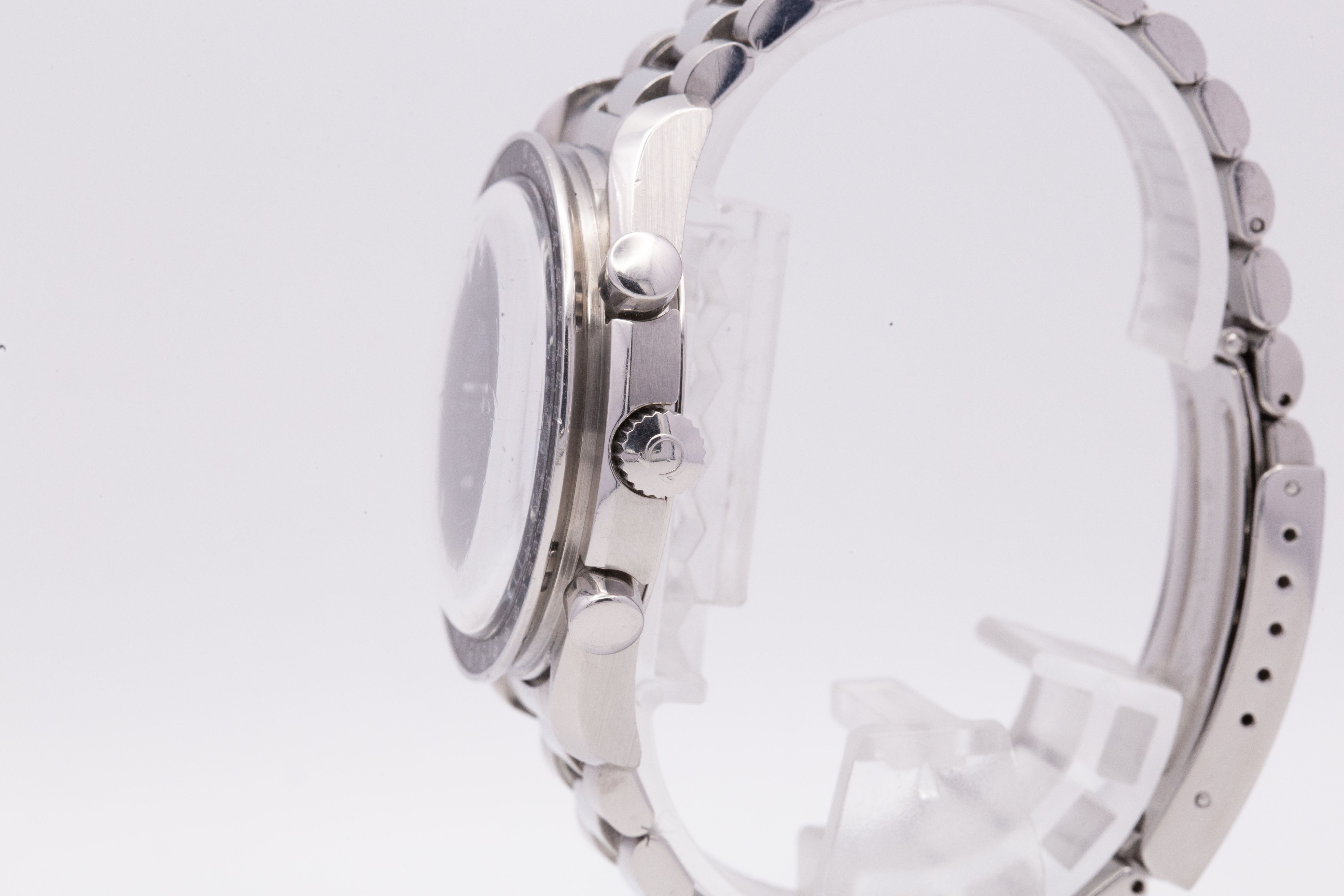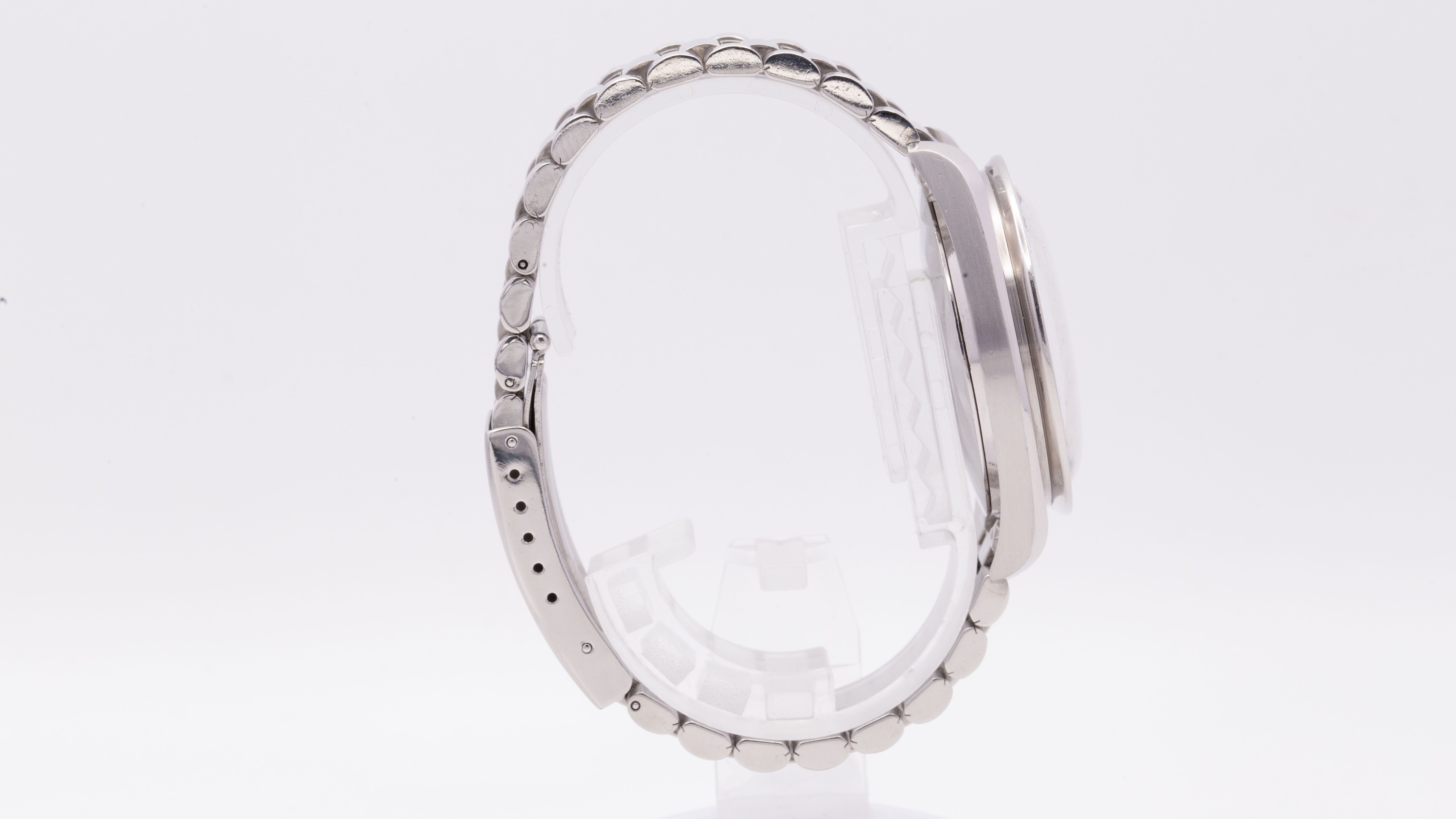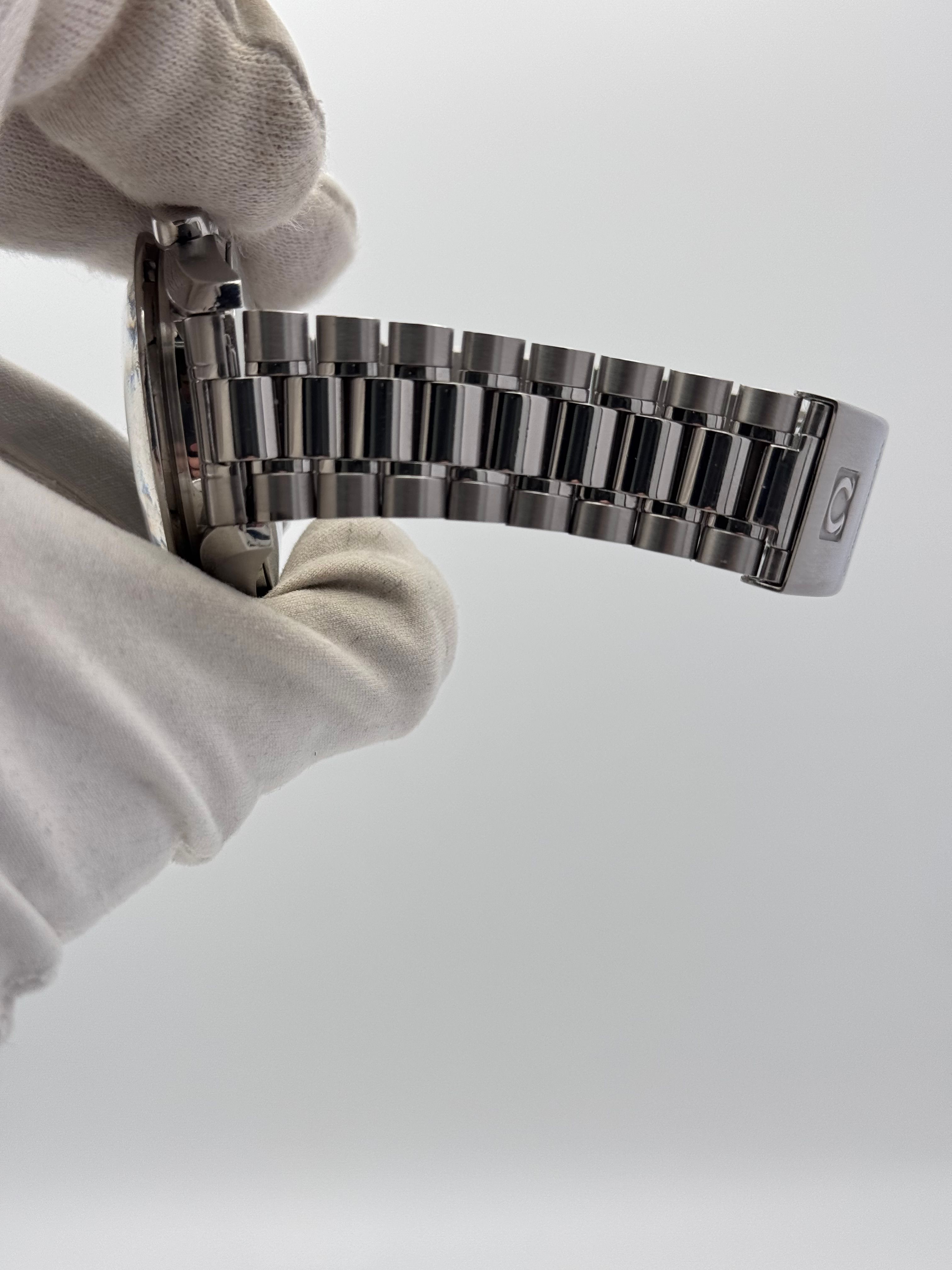 A pulseira original de aço Omega também está em bom estado e atualmente é adequada para um pulso de aproximadamente 18,5 cm. Aqui também, há apenas leves marcas de uso típicas do tempo.