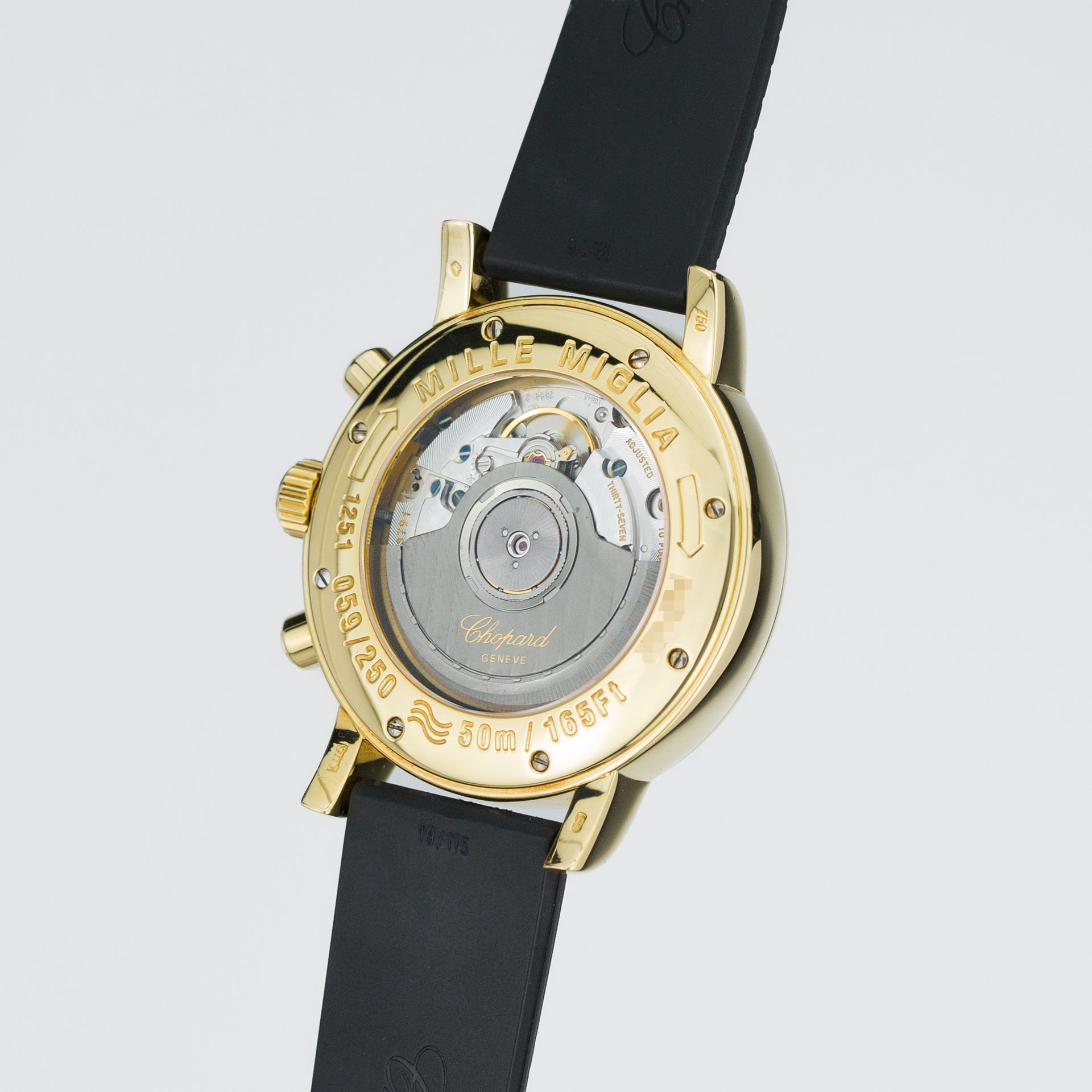 The Chopard Mille Miglia watch series is designed in the spirit of motor racing, and this is evident in every element of this timepiece's design. The trademark of the iconic “1000 Miglia” race, which gave its name to this series, is proudly positioned on the watch's dial (as well as in the form of an engraving on its crown), the dial itself is finished in the same way as the dashboards of vintage racing cars were (which are the main participants in this race to this day), and along the outer edge is the tachymeter scale, which not only reinforces the racing spirit of the watch but also allows for speed calculations, the strap features the tread pattern of a car tire.The case of this watch is a classic 40 mm in size, making it extremely comfortable to wear, the height is only 11.5 mm, and the fact that the case is crafted from 18-carat yellow gold makes it very attractive. Arabic numerals for hour markers, gold hands with SuperLuminova inserts, a transparent case back – all of this indicates the watch's thoroughbred pedigree and makes it very noticeable.