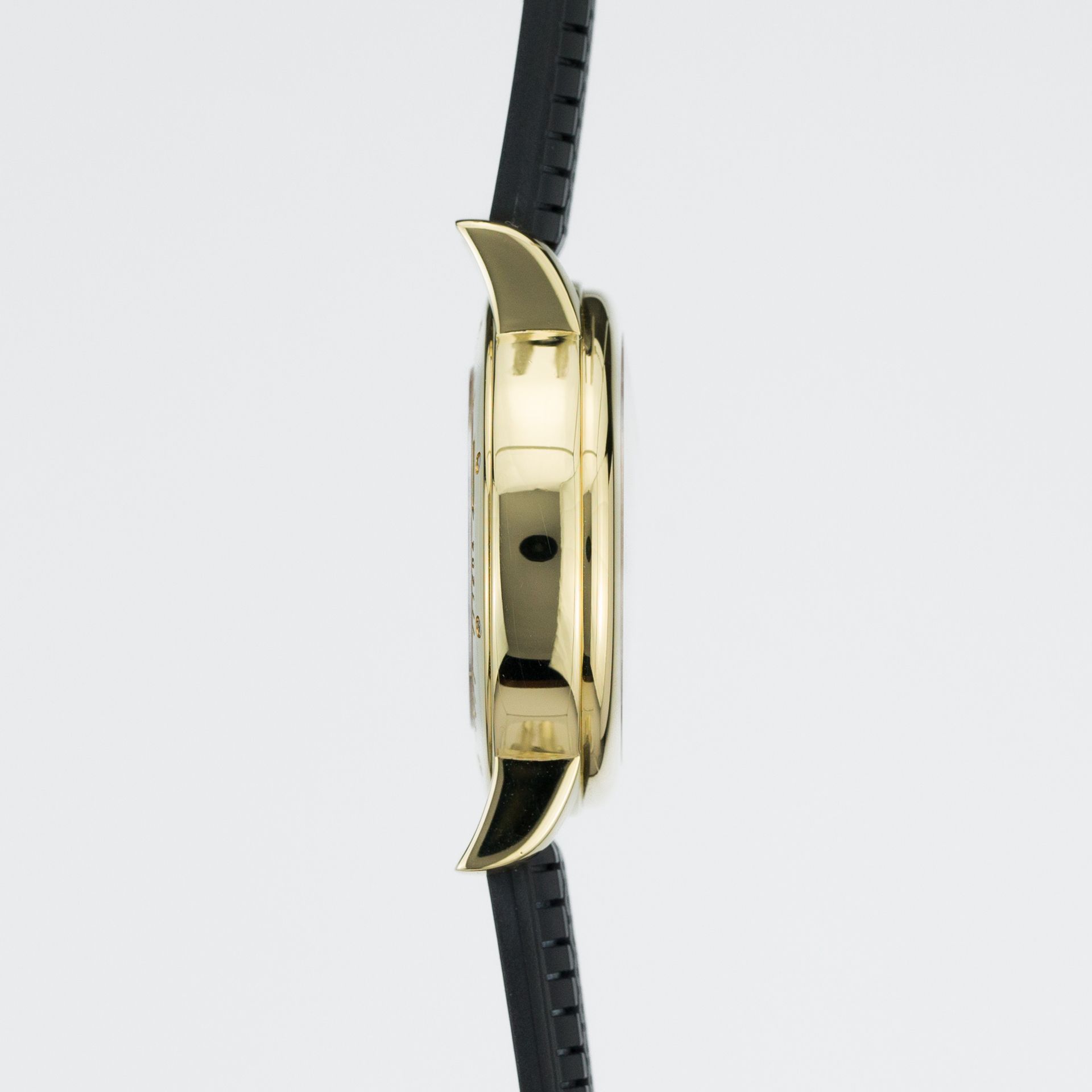 A caixa deste relógio tem um tamanho clássico de 40 mm, tornando-o extremamente confortável de usar, a altura é de apenas 11,5 mm, e o fato de que a caixa é feita de ouro amarelo 18 quilates a torna muito atraente. Números árabes para marcadores de horas, ponteiros dourados com inserções de SuperLuminova, um fundo de caixa transparente – tudo isso indica a linhagem pura do relógio e o torna muito notável.