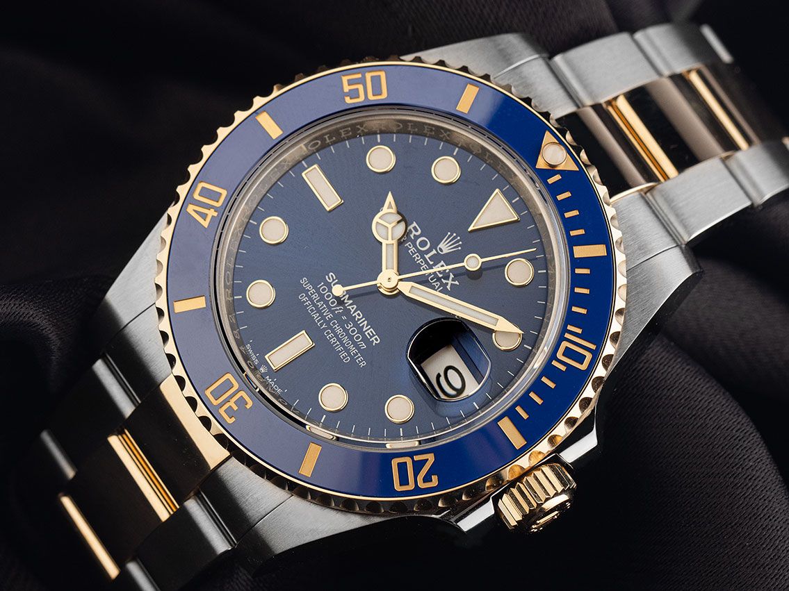 Rolex Submariner Date Stahl 18kt Gelbgold Keramik Automatik Armband OysterGehäuse Edelstahl poliert und satiniert, Gehäusedurchmesser ohne Krone 41mm, Gehäusehöhe 12,4mm. Lünette 18kt Gelbgold gerädelt mit blauem Keramik Inlay, 60-Minuten Skala und Leuchtpunkt, einseitig drehbar. Armband Oyster Edelstahl / 18kt Gelbgold poliert und satiniert, Rolex Sicherheitsfaltschließe Edelstahl / 18kt Gelbgold mit Hersteller-Logo. Zifferblatt blau mit aufgesetzten in Gelbgold gefassten Leuchtindexen und Leuchtpunkten sowie gelbgoldenen Leuchtzeigern. Uhrwerk Automatik, Chronometer mit Zeugnis, Rolex Manufakturkaliber 3235 mit 31 Edelsteinen, Gangreserve ca. 70 Stunden. Anzeige von Stunde, Minute und Sekunde über Zeiger aus der Mitte mit Sekundenstopp zur sekundengenauen Einstellung der Uhrzeit, Datumsanzeige mit Schnellverstellung unter Glaslupe bei 3 Uhr. Saphirglas kratzfest. Krone verschraubbar mit Flankenschutz und Hersteller-Logo. Boden Edelstahl verschraubt. Gewicht der Uhr inklusive Armband 172g, Länge des Armbandes inklusive Gehäuse 180mm. Wasserdicht bis 30 ATM. Referenznummer: 126613LB, ID: P2714320000326HW-20500/18250, Artikelnummer: 10000085232. Original Rolex Box mit Umkarton und Garantie Papiere von April 2025, neue Rolex Garantie Karte ohne Ländercode sowie Beschreibung, Ledermäppchen, Rolex Chronometer-Siegel, Lünettenschutz und Watchregister Auszug von März 2026, The Watch Register Zertifikat / ohne Eintrag (Internationale Datenbank für verlorene oder gestohlene Uhren), Full Set. Kapitalanlage mit Wertsteigerungspotential. Ungetragen. Lieferzeit sofort.