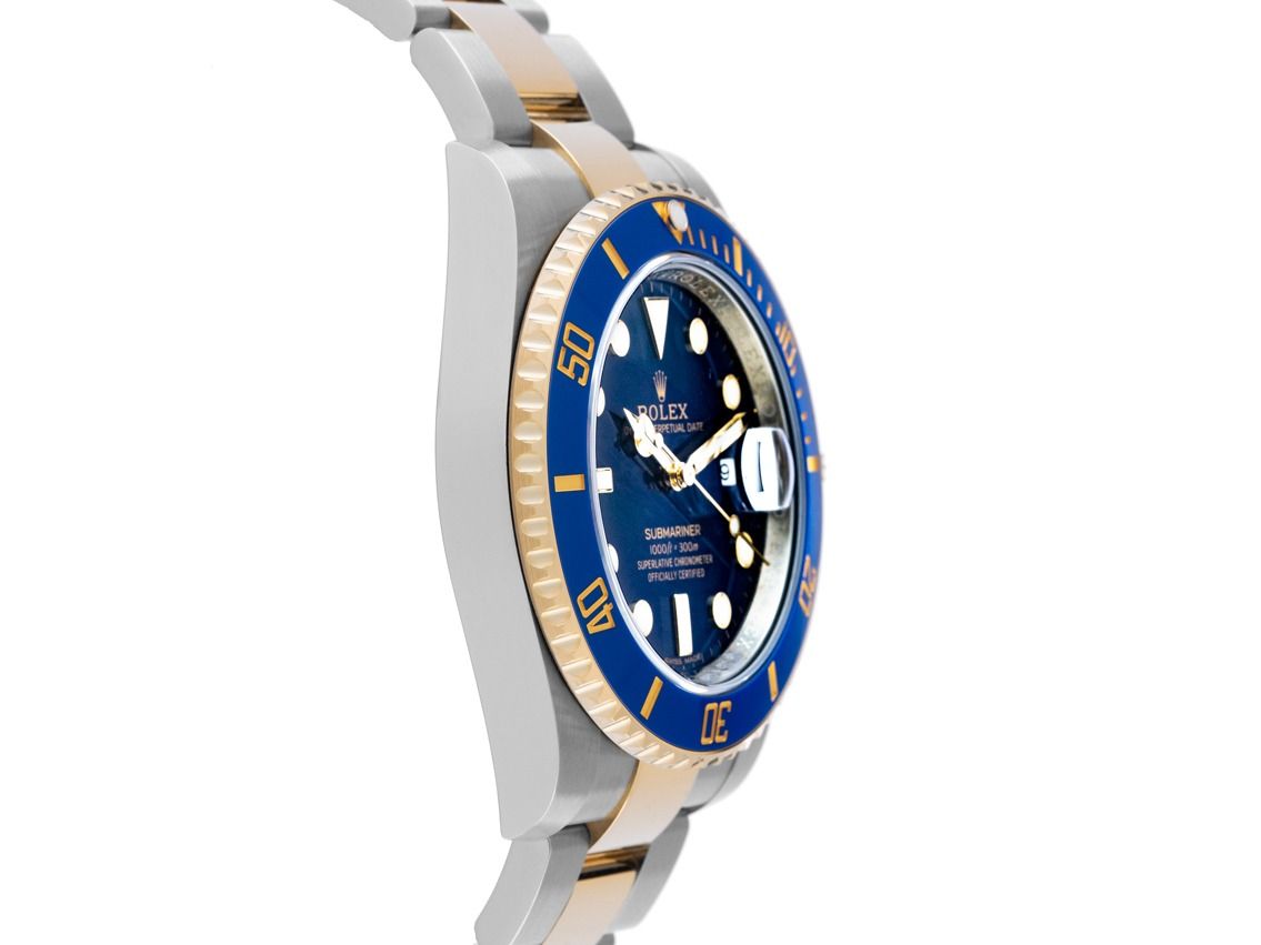 Rolex Submariner Date Bluesy Stahl 18kt Gelbgold Keramik Automatik Armband OysterGehäuse Edelstahl poliert und satiniert, Gehäusedurchmesser ohne Krone 40mm, Gehäusehöhe 12,5mm. Lünette 18kt Gelbgold gerädelt mit blauem Keramik Inlay, 60-Minuten Skala und Leuchtpunkt, einseitig drehbar. Armband Oyster Edelstahl / 18kt Gelbgold poliert und satiniert, Sicherheitsfaltschließe Edelstahl / 18kt Gelbgold mit Hersteller-Logo. Zifferblatt blau mit aufgesetzten in Gelbgold gefassten Indexen und Punkten, sowie gelbgoldenen Zeigern. Uhrwerk Automatik, Chronometer mit Zeugnis, Rolex Manufakturkaliber 3135 mit 31 Edelsteinen. Anzeige von Stunde, Minute und Sekunde über Zeiger aus der Mitte mit Sekundenstopp zur sekundengenauen Einstellung der Uhrzeit, Datumsanzeige mit Schnellverstellung unter Glaslupe bei 3 Uhr. Saphirglas kratzfest. Krone verschraubbar mit Flankenschutz und Hersteller-Logo. Boden Edelstahl verschraubt. Gewicht der Uhr inklusive Armband 170g, Länge des Armbandes inklusive Gehäuse 185mm. Referenznummer: 116613LB, Gehäusenummer: 920T7XXX, ID: KB1825236000326HW-16100, Artikelnummer: 10000085243. Mit Gangkontrolle und kompletter äußerlicher Aufarbeitung von März 2026. Original Rolex Box mit Umkarton und Garantie Papiere von Februar 2018, LC 138 / Netherlands sowie Beschreibung, Ledermäppchen, Rolex Chronometer-Siegel und Watchregister Auszug von März 2026, The Watch Register Zertifikat / ohne Eintrag (Internationale Datenbank für verlorene oder gestohlene Uhren), Full Set. Superschnäppchen, Kapitalanlage mit Wertsteigerungspotential, fast nicht getragen. Wie Neu. Lieferzeit sofort.
