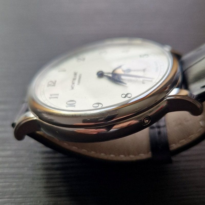 Este Star Legacy Moonphase apresenta uma caixa de aço inoxidável de 42 mm com um mostrador branco prateado.