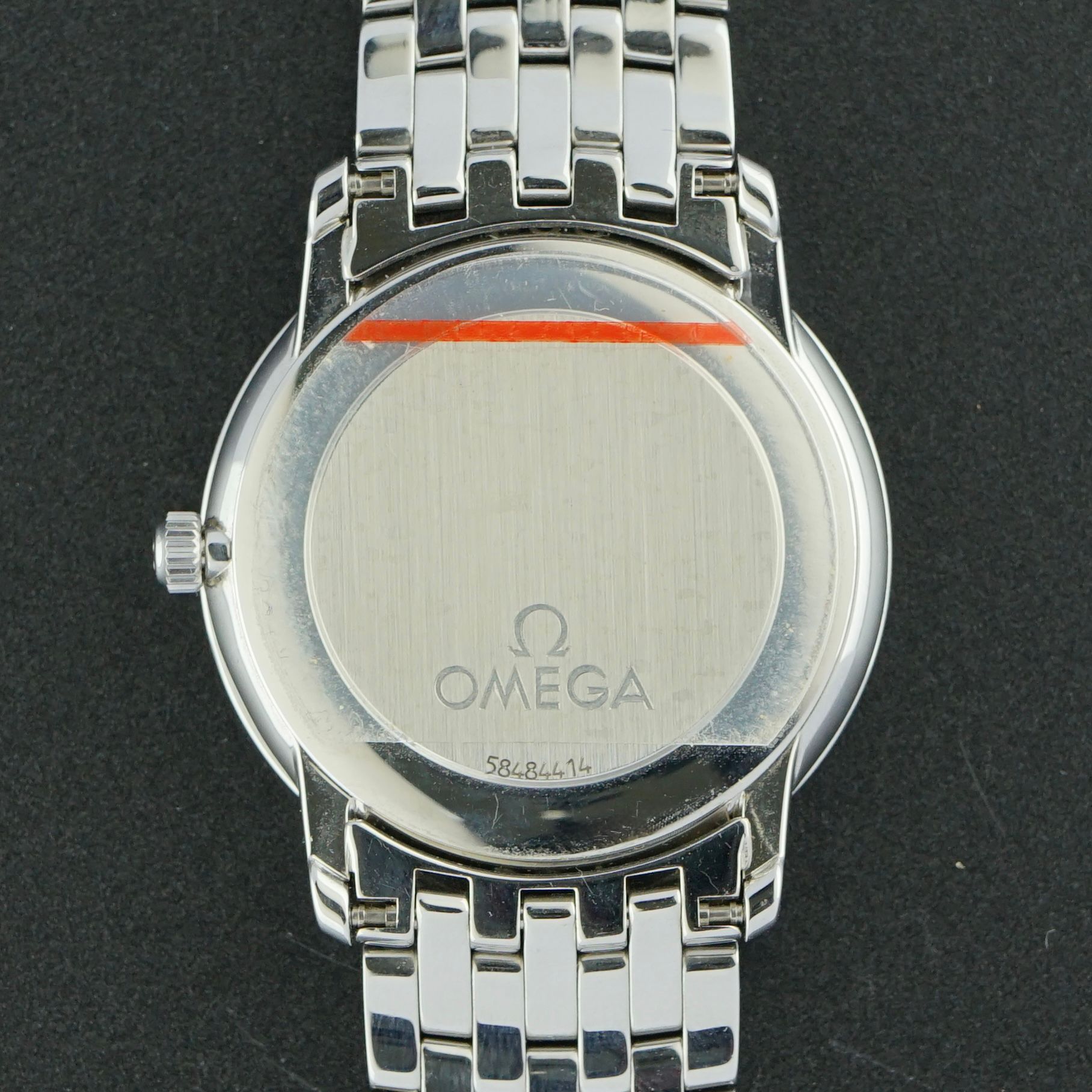 Um Omega De Ville Prestige vintage de 1998, com um mostrador preto e pequenos segundos às 6 horas. A caixa e a pulseira são feitas de aço inoxidável, com uma largura de caixa de 34,5 mm. Preservado em excelente condição de estoque antigo, mantendo o adesivo original da parte de trás da caixa e parte do adesivo de selo da pulseira original.