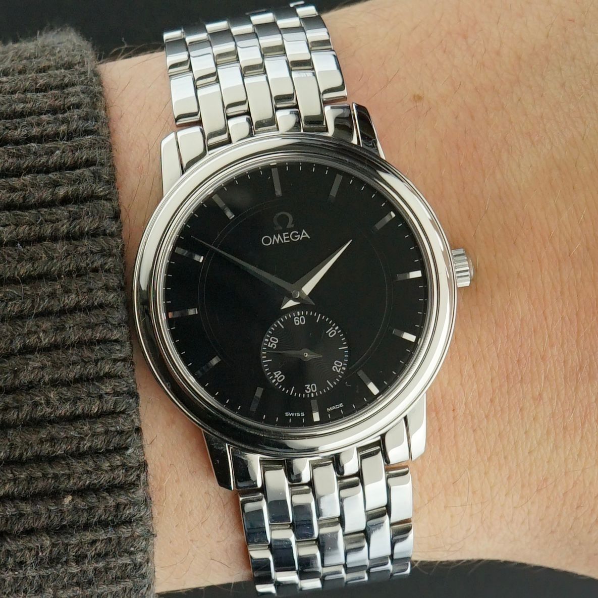 A Vintage Omega De Ville Prestige from 1998, featuring a black dial with small seconds at 6 o’clock. The case and bracelet are made of stainless steel, with a case width of 34.5 mm. Preserved in excellent new old stock condition, retaining the original caseback sticker and part of the original bracelet seal sticker.Comes as a full set, including the original box, booklet with manual, card pouch with all cards showing the international warranty and pictograms card, as well as the original tag displaying the serial number, reference number, and movement number. Overall condition and completeness make this an exceptional dress watch and a true collector’s piece.