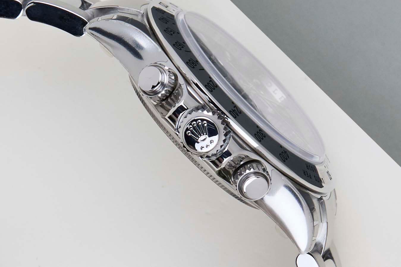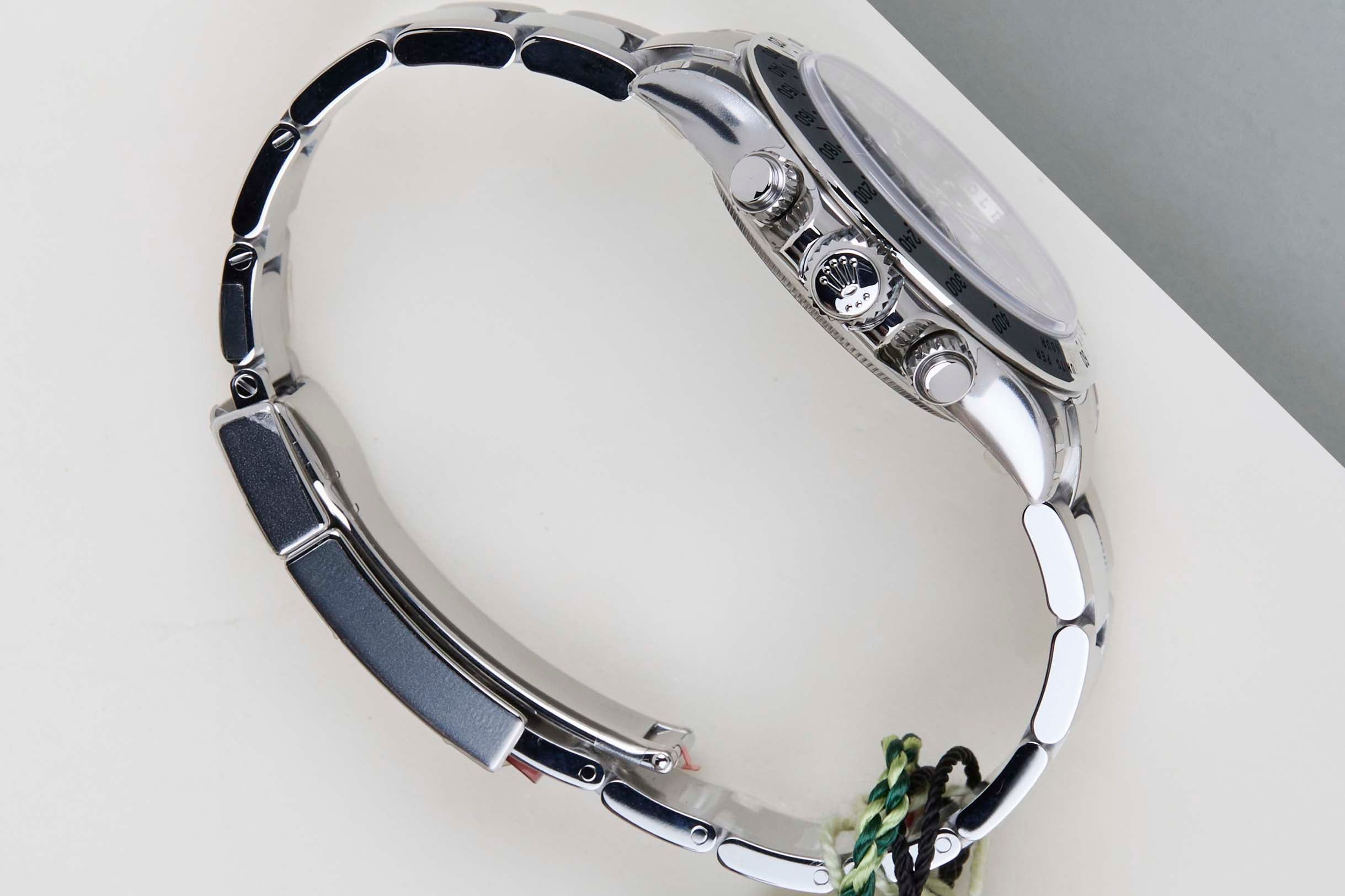 New & Unworn | NOS (New Old Stock) | Full Set | Partly Stickered | APH Chromalight Dial | Including Rolex Green TagThe reference 116520 is the first generation of the Daytona with an in-house movement by Rolex, Calibre 4130. The new calibre was the result of five years of innovation, refinement, and technical improvement resulting in a better and more reliable calibre.This highly-sought after Rolex Daytona has been sold for the first time in August 2015.This collectable Rolex Daytona is fitted with an 'APH-Chromalight' Dial.The Chromalight can be recognised by the lume, which lights up in blue. This is contrary to the earlier Rolex Daytona versions, which were delivered with Superluminova applied on the dial, which lights up in a green colour.This Rolex Daytona 116520 is in New & Unworn condition and comes with the original Rolex Warranty Card and original box. Furthermore, the watch has been checked by our watchmaker, and therefore it comes with One Year of Steiner Warranty.
