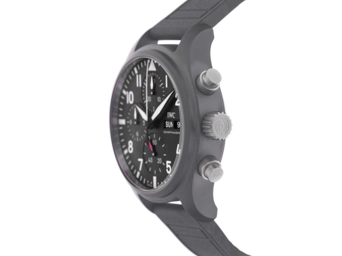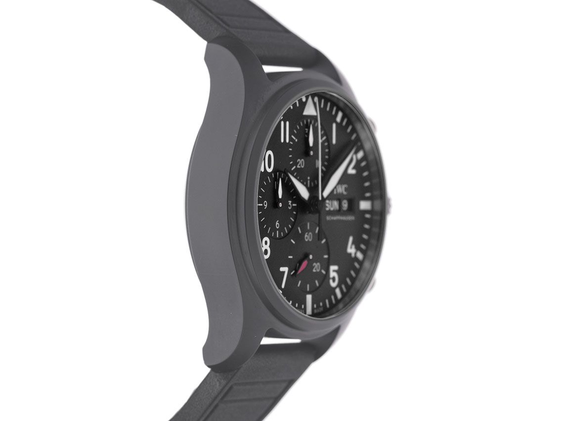 IWC Pilot´s Watch Top Gun Keramik Automatik Chronograph Armband KautschukGehäuse Keramik schwarz satiniert, Gehäusedurchmesser ohne Krone 41,9mm, Gehäusehöhe 15,5mm. Lünette Keramik schwarz glatt und satiniert. Armband Kautschuk schwarz, Anstoßbreite 20mm, Stiftschließe Edelstahl mit Hersteller-Logo. Zifferblatt schwarz mit weißen arabischen Leuchtziffern, Leuchtindexen und schwarzen Zeigern mit Leuchtmasse. Uhrwerk Automatik Chronograph, Kaliber IWC 69380 mit 33 Edelsteinen, Gangreserve ca. 46 Stunden. Anzeige von Stunde und Minute über Zeiger aus der Mitte, kleine Sekunde mit Sekundenstopp zur sekundengenauen Einstellung der Uhrzeit bei 6 Uhr, Datumsanzeige und Wochentaganzeige in englisch mit Schnellverstellung bei 3 Uhr. Saphirglas kratzfest und gewölbt. Krone verschraubbar mit Hersteller-Logo. Boden Edelstahl verschraubt und mit Top Gun Logo graviert. Gewicht der Uhr inklusive Armband 120g. Referenznummer: IW389401, ID: ST1160129720326H-9700, Artikelnummer: 10000085289. Original IWC Schaffhausen Box mit Umkarton und Garantie Papiere von 2026 sowie Beschreibung und IWC Poliertuch, Full Set. Ungetragen. Lieferzeit sofort.