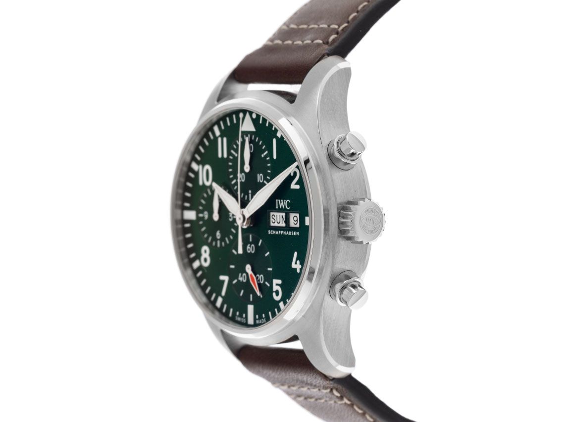 IWC Pilot´s Watch Stahl Automatik Chronograph Armband LederGehäuse Edelstahl poliert und satiniert, Gehäusedurchmesser ohne Krone 41mm, Gehäusehöhe 14,4mm. Lünette Edelstahl glatt und poliert. Armband Leder schwarz mit heller Ziernaht, Anstoßbreite 20mm, Stiftschließe Edelstahl mit Hersteller-Logo. Zifferblatt grün mit weißen arabischen Ziffern und Indexen sowie Edelstahl Leuchtzeigern. Uhrwerk Automatik, Chronograph, IWC Manufakturkaliber 69385 mit 33 Edelsteinen, Gangreserve ca. 46 Stunden. Anzeige von Stunde und Minute über Zeiger aus der Mitte, kleine Sekunde mit Sekundenstopp zur sekundengenauen Einstellung der Uhrzeit bei 6 Uhr, Wochentaganzeige in Englisch und Datumsanzeige mit Schnellverstellung bei 3 Uhr. Saphirglas kratzfest, gewölbt und beidseitig entspiegelt. Krone verschraubbar mit Hersteller-Logo. Boden Edelstahl verschraubt und graviert mit Saphirglas Sichtfenster. Gewicht der Uhr inklusive Armband 109g. Wasserdicht bis 10 ATM. Referenznummer: IW388103, ID: ST1160109040326H-7700, Artikelnummer: 10000085288. Original IWC Box mit Umkarton und Garantie Papiere von 2026 sowie Beschreibung, Full Set. Ungetragen. Lieferzeit sofort.