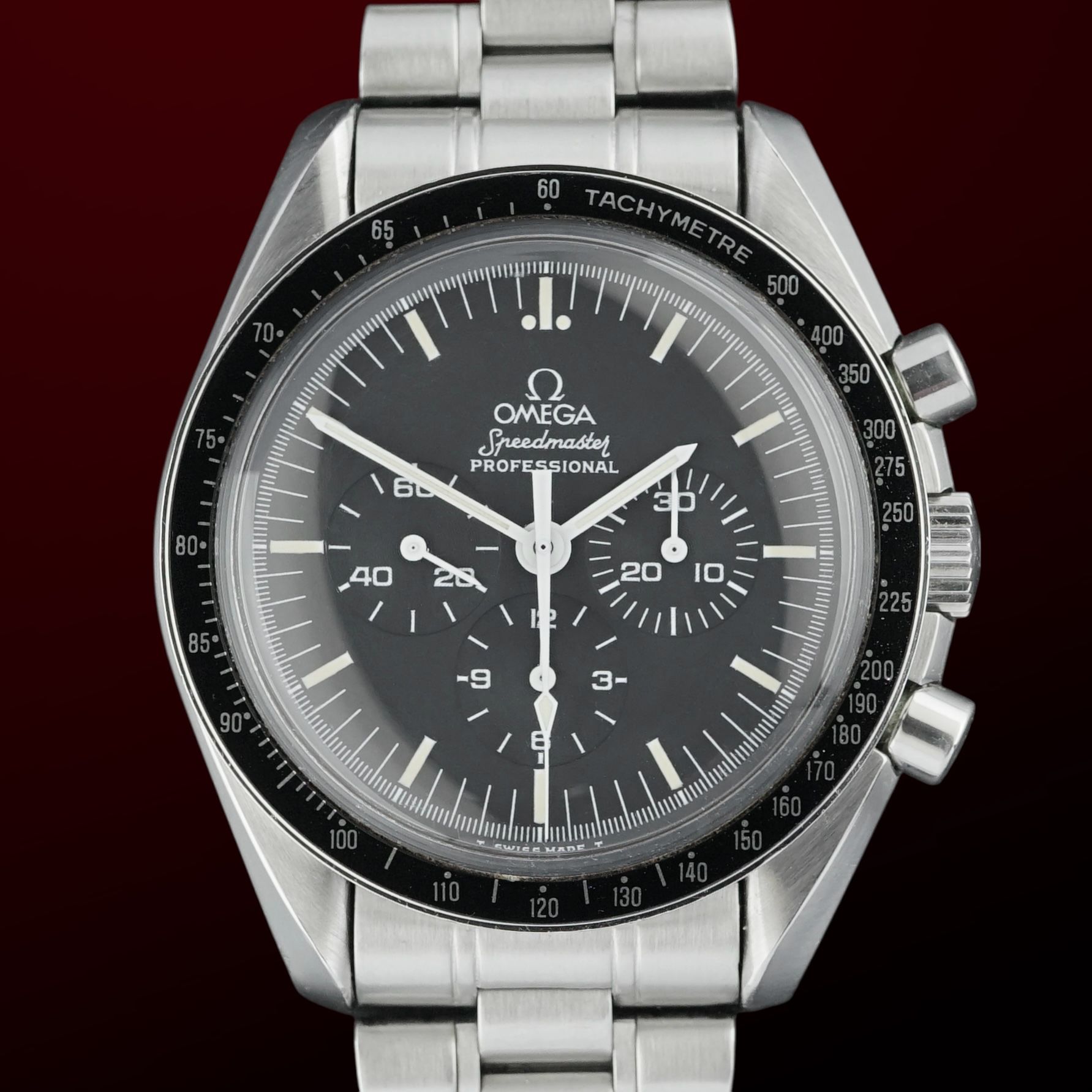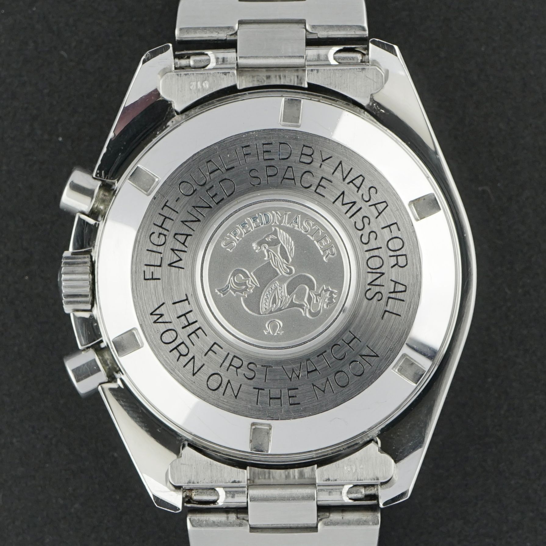 A very important aspect of this watch is that it remains unpolished, retaining its original factory finish throughout. The lacquer on the caseback is fully intact, and the tachymeter bezel is in perfect shape. The watch is entirely original, including its original Omega Speedmaster bracelet, suitable for wrists between 15 and 20 cm.