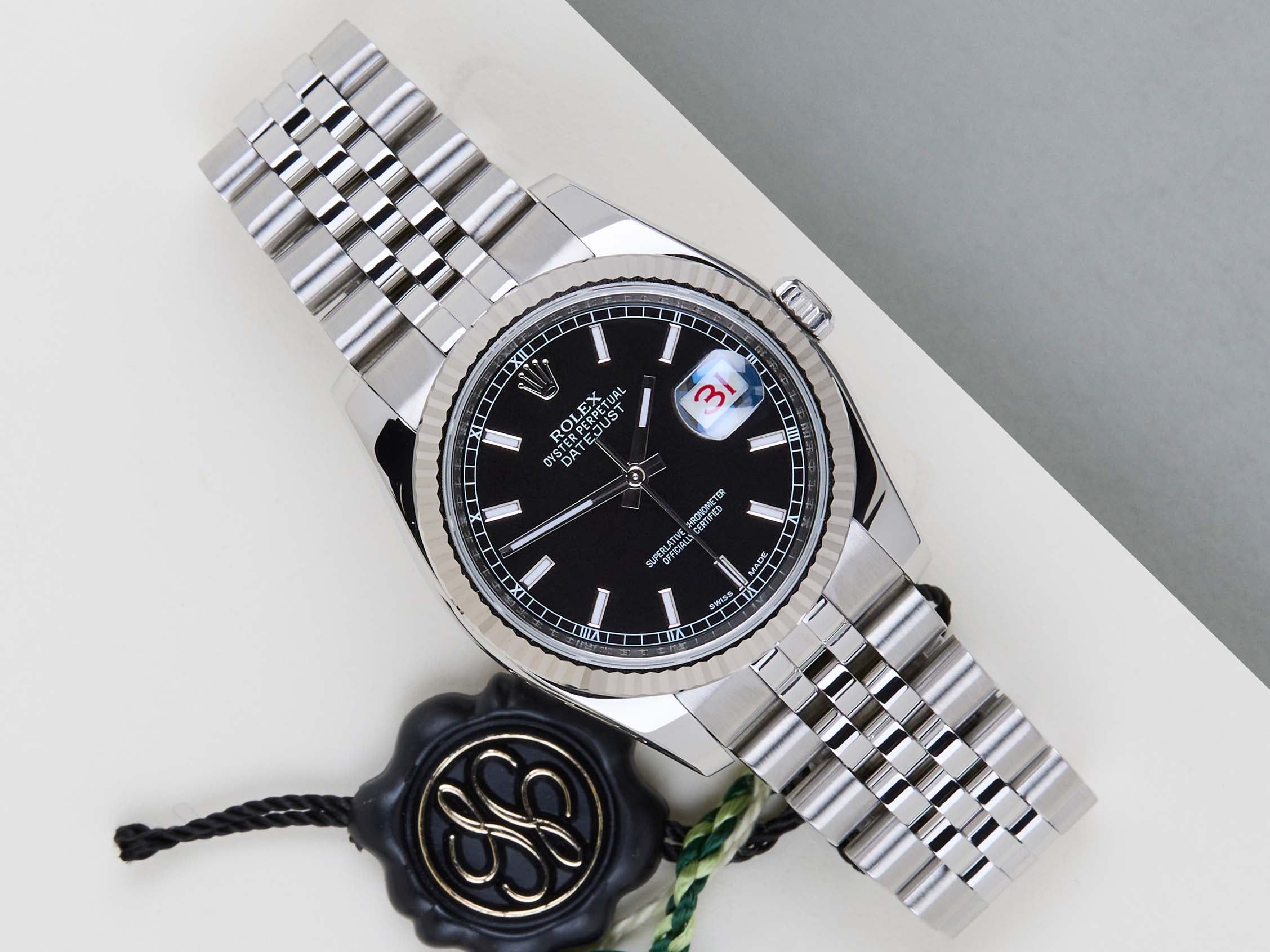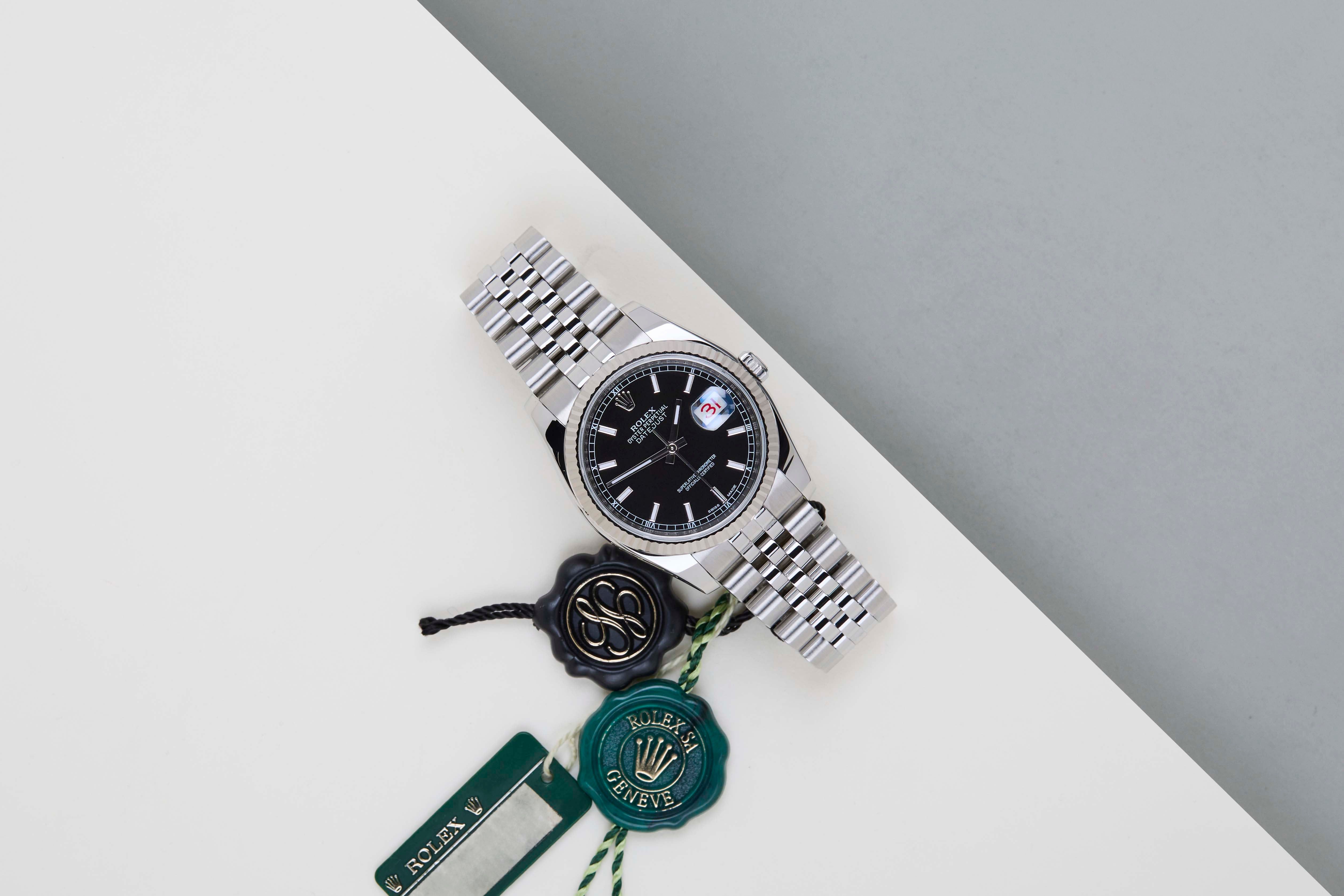 Este Rolex Datejust 36 'Mostrador Preto - Data Roulette - Jubilee' foi vendido pela primeira vez em fevereiro de 2016. Este Datejust é feito de uma combinação de Ouro Branco 18k e aço inoxidável e vem com uma pulseira jubilee que oculta o fecho Crownclasp. Este Datejust apresenta a 'Data Roulette', que remete ao primeiro modelo Datejust. Com esta 'Data Roulette', as datas ímpares são vermelhas e as datas pares são pretas.
