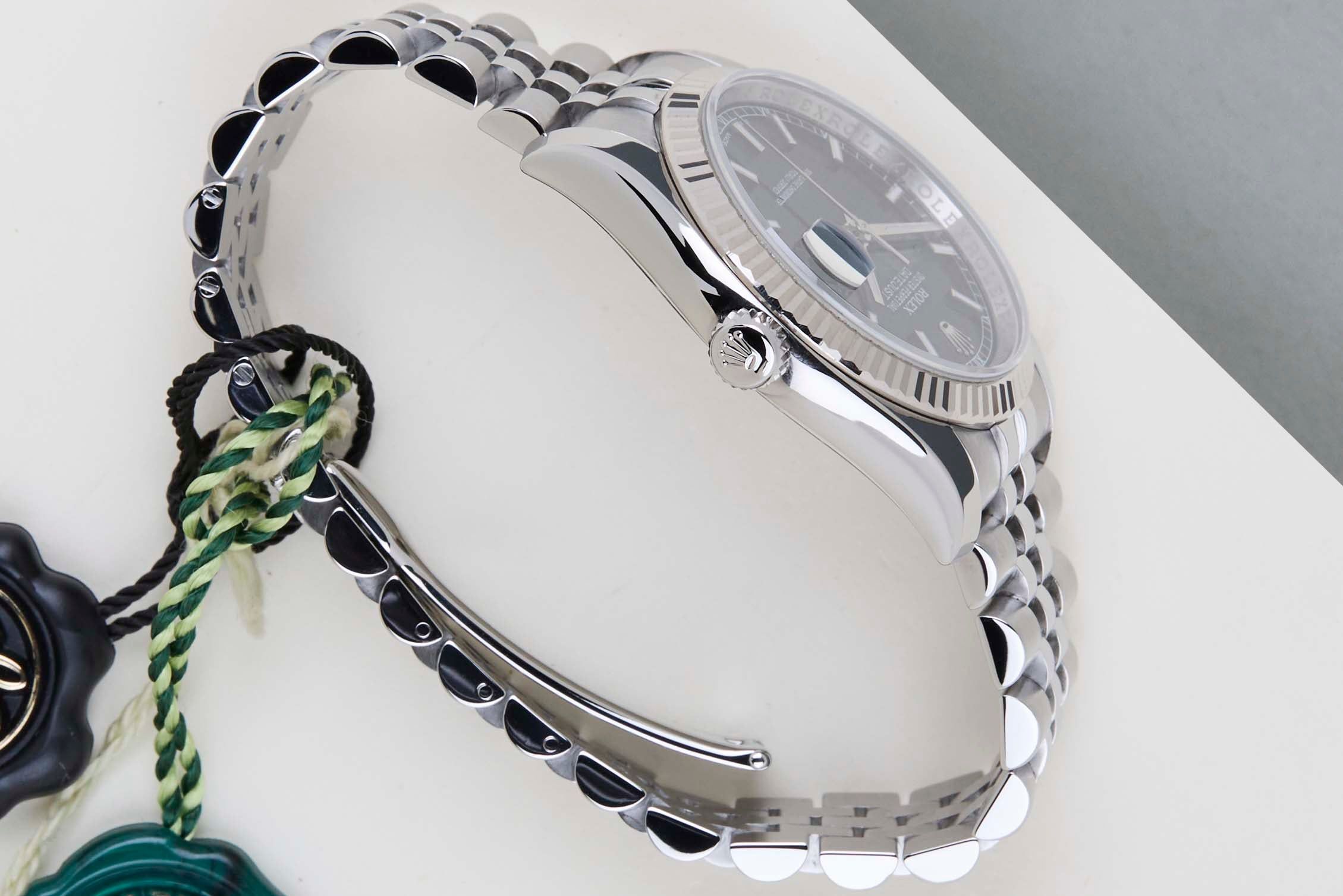 Full Set | Including Rolex Green Tag | Roulette Date WheelRolex introduced the original Datejust in 1945 to celebrate the company's 40th anniversary. Due to the various case sizes and materials, the Datejust has been ingrained in Rolex's history and remains incredibly popular for 75 years.This Rolex Datejust 36 'Black Dial - Roulette Date - Jubilee' was sold for the first time in February 2016. This Datejust is made of a combination of 18k White Gold and stainless steel and is fitted with a jubilee bracelet which conceals the Crownclasp. This Datejust features the 'Roulette Date', which refers back to the first Datejust model. With this 'Roulette Date', odd dates are red and even dates are black.This Rolex Datejust 36 is in mint condition and comes as a full-set with the original Rolex Warranty Card and box. Furthermore, the watch has been serviced by our watchmaker, and therefore it comes with one year of Steiner warranty.