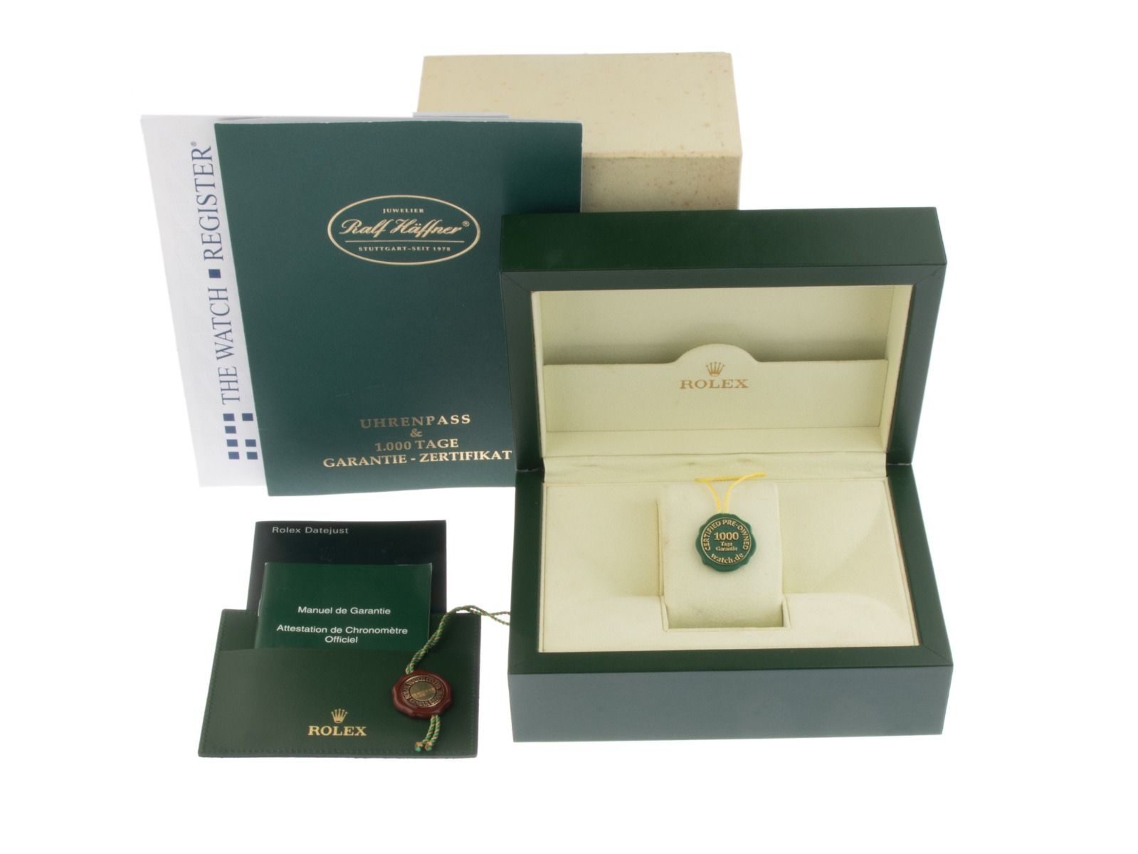 Inklusive certified pre owned Siegel / Uhrenpass mit einem Farbbild, der genauen Beschreibung sowie dem Wiederbeschaffungswert der Uhr über 10600,-€ und 1000 Tage Garantie ab Kaufdatum.