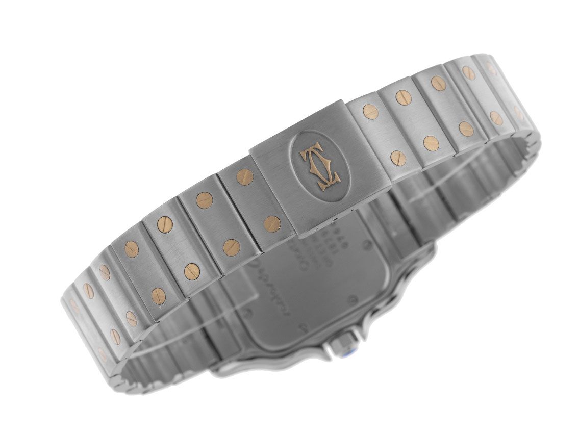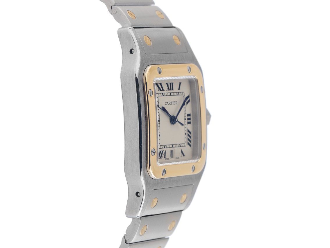 Cartier Santos Galbee GM großes Modell Stahl 18kt Gelbgold Quarz Armband Stahl 18kt GelbgoldGehäuse Edelstahl poliert und satiniert, rechteckig, Gehäusemaße ohne Krone (L x B x H) 41 x 29 x 8,7mm. Lünette 18kt Gelbgold 8-fach verschraubt und poliert. Armband Edelstahl satiniert mit 18kt Gelbgold Schrauben dekoriert, Faltschließe Edelstahl mit Hersteller-Logo. Zifferblatt cremeweiß mit schwarzen römischen Ziffern und gebläuten Zeigern. Uhrwerk quarzgesteuert, Kaliber Cartier 87 mit 7 Edelsteinen. Anzeige von Stunde, Minute und Sekunde über Zeiger aus der Mitte mit Sekundenstopp zur sekundengenauen Einstellung der Uhrzeit, Datumsanzeige mit Schnellverstellung bei 6 Uhr. Saphirglas kratzfest. Krone mit Saphir Cabochon und Flankenschutz. Boden Edelstahl 8-fach verschraubt und graviert. Gewicht der Uhr inklusive Armband 80g, Länge des Armbandes inklusive Gehäuse 170mm. Referenznummer: 187901, Gehäusenummer: 02XXX, ID: P277250000326HW-6900, Artikelnummer: 10000085330. Mit Gangkontrolle, neuer Batterie und kompletter äußerlicher Aufarbeitung von März 2026. Original Cartier Box und Garantie Papiere von August 1988 sowie Beschreibung und Watchregister Auszug von März 2026, The Watch Register Zertifikat / ohne Eintrag (Internationale Datenbank für verlorene oder gestohlene Uhren), Full Set. Kapitalanlage mit Wertsteigerungspotenzial, sehr seltenes Sammlerstück. Sehr guter Zustand. Lieferzeit sofort.