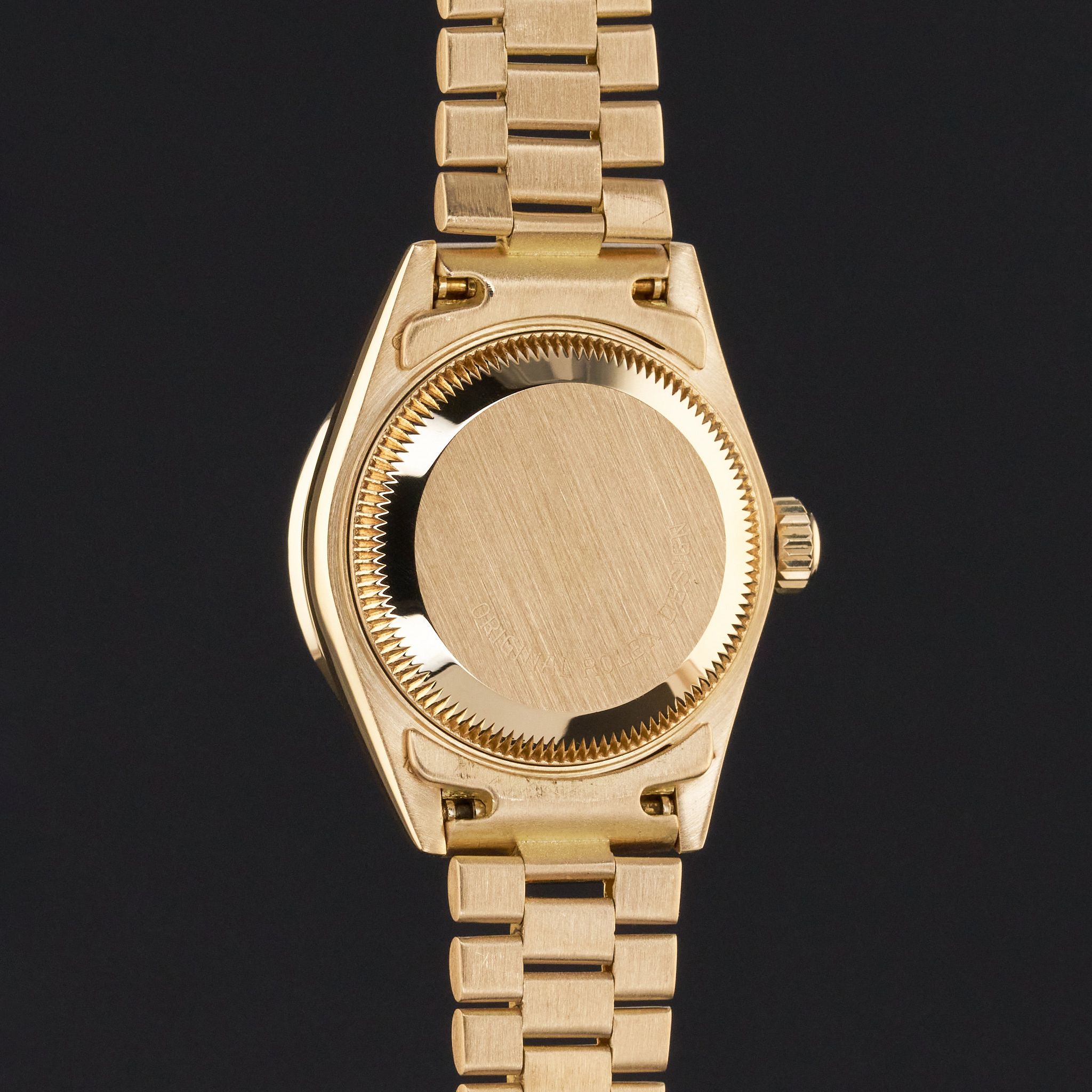 Este Rolex Lady-Datejust 69178 apresenta um mostrador de diamantes com rubis Pave e é feito de ouro amarelo 18K, com ano de produção de 1987. O mostrador, a luneta, a caixa e a pulseira são originais, mas têm cravação de diamantes de terceiros.