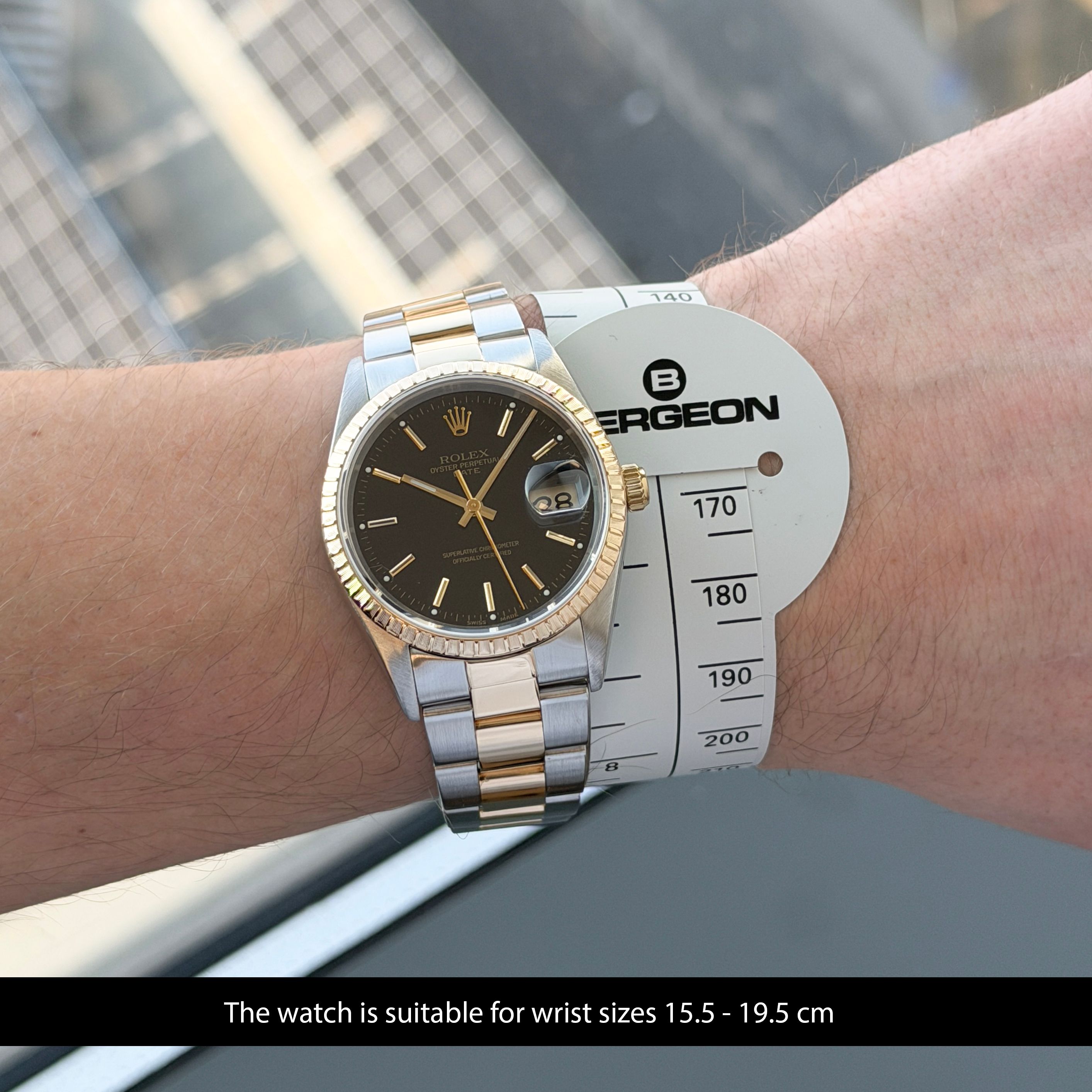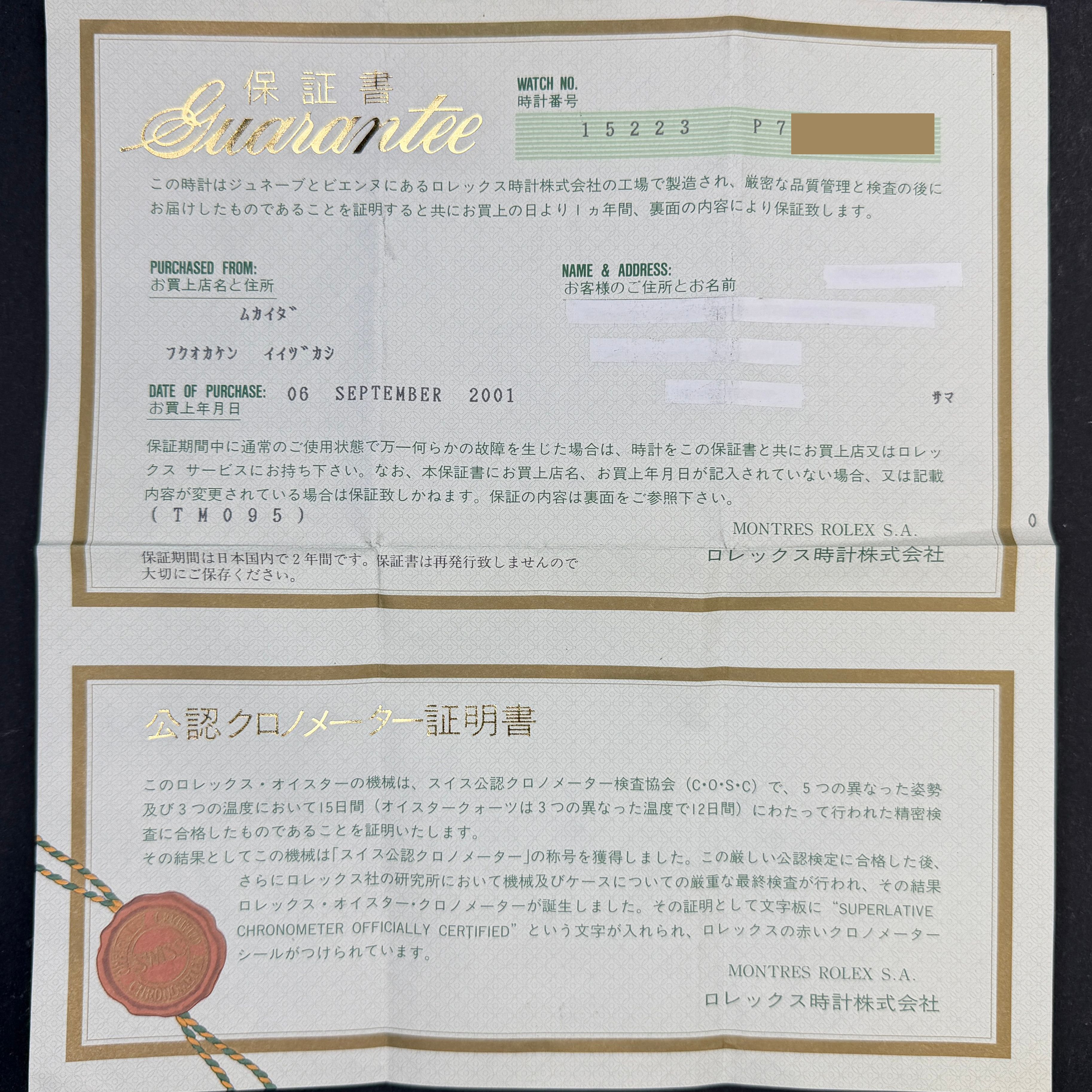 This Rolex Oyster Perpetual Date 15223 features a Black dial and is crafted from 18K yellow gold and stainless steel, with a production year of 2000.Case No: P78XXXX
