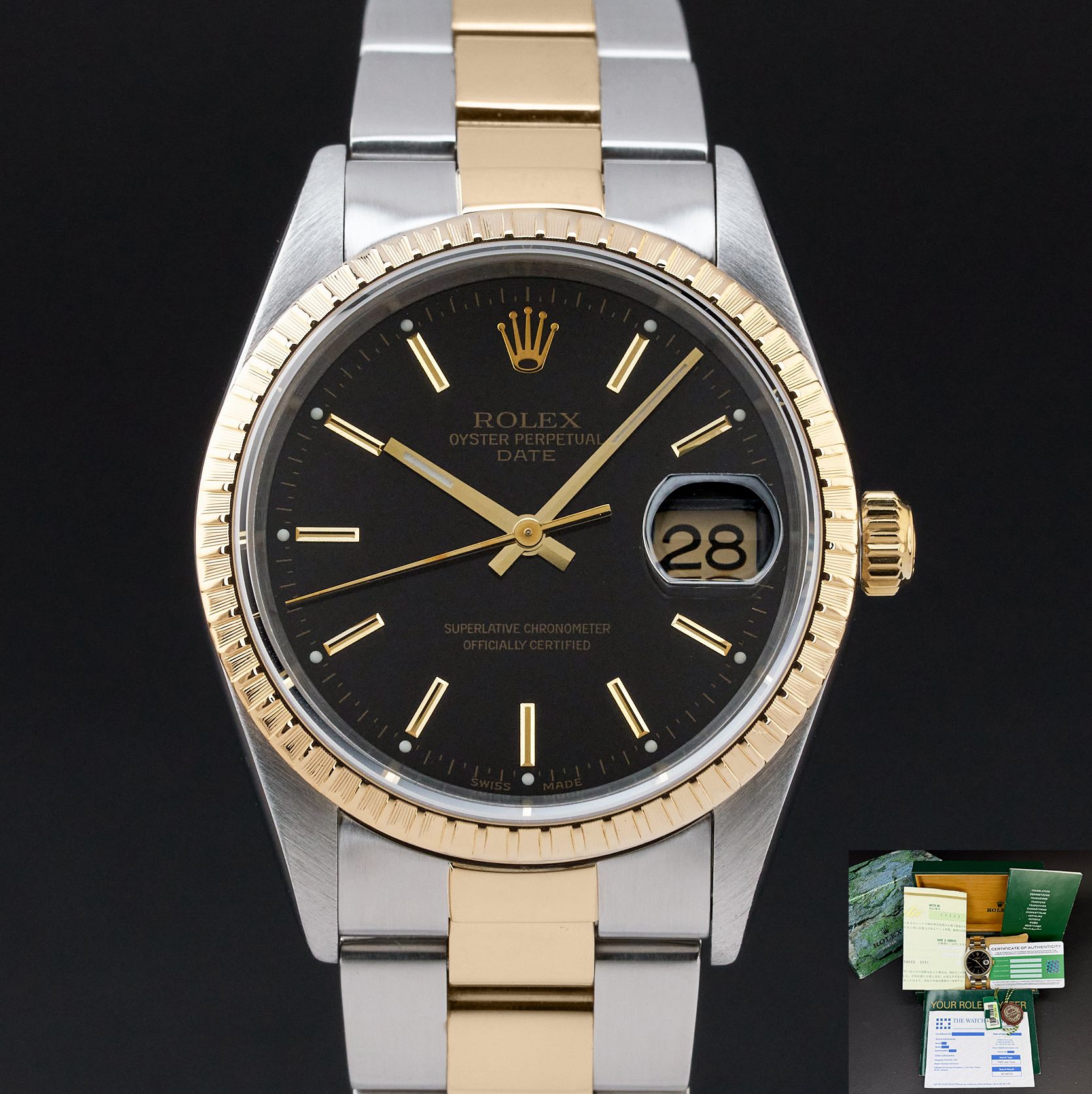 Rolex Oyster Perpetual Date, 15223, 34mm, 2000, Two-Tone, Black dial, Fullset, 1y warranty
