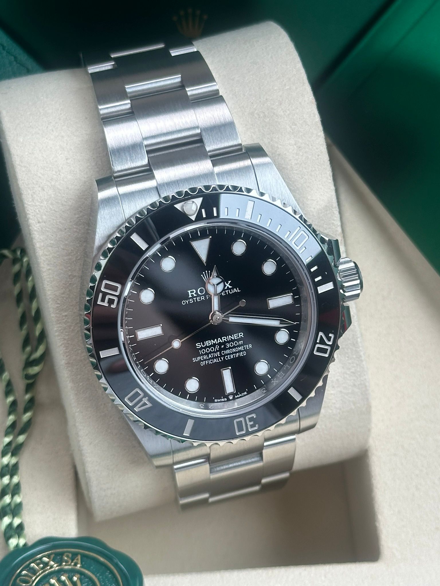 The watch is delivered as a full set, including the original Rolex box, warranty papers, booklets, and all original full links.