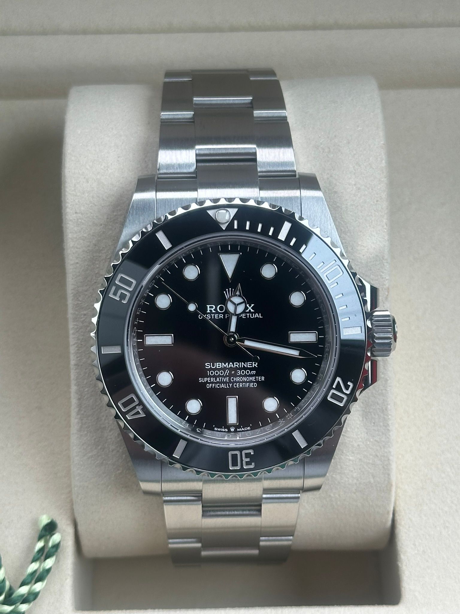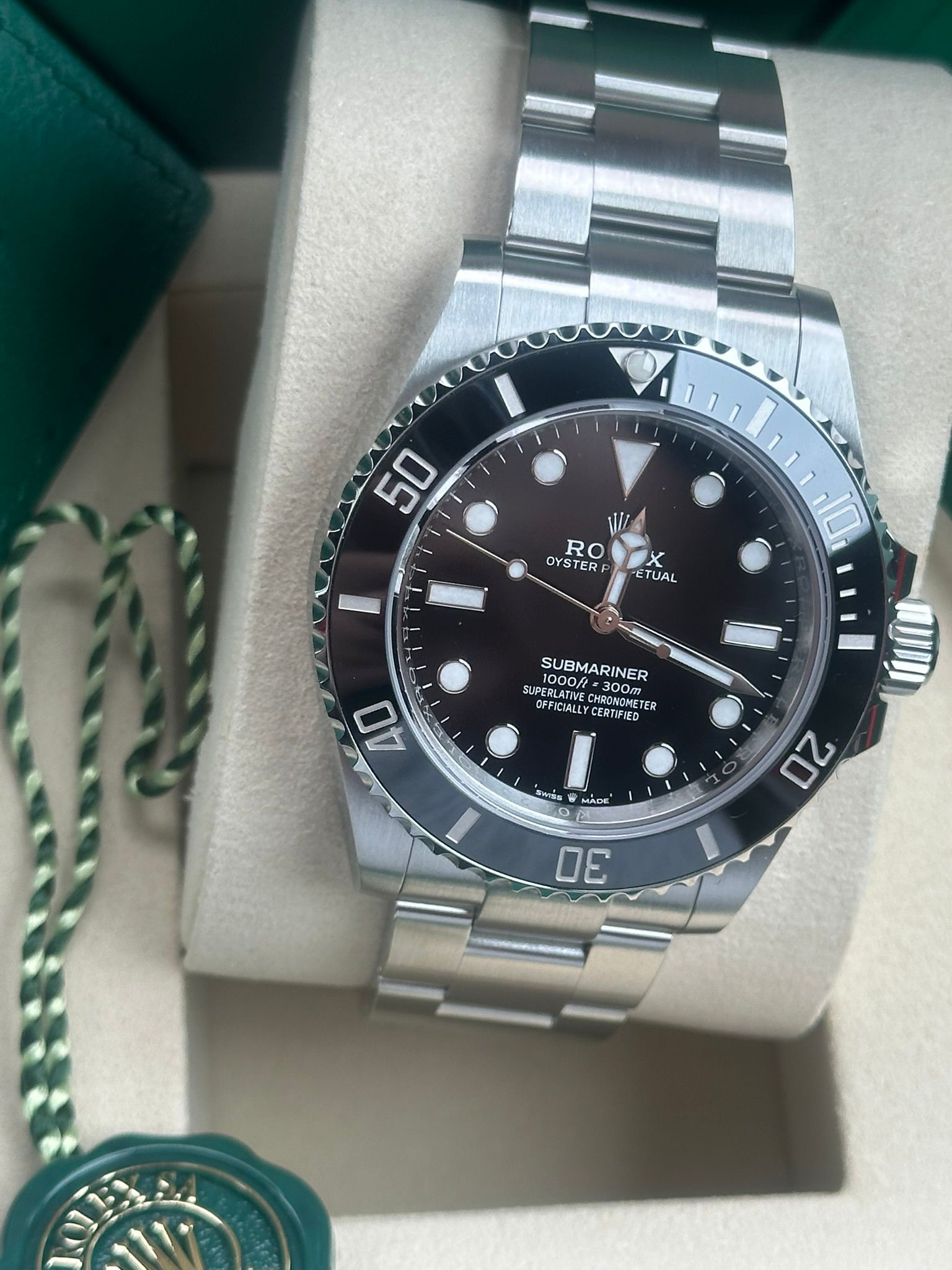 O relógio é entregue como um conjunto completo, incluindo a caixa original da Rolex, documentos de garantia, folhetos e todos os elos originais completos.