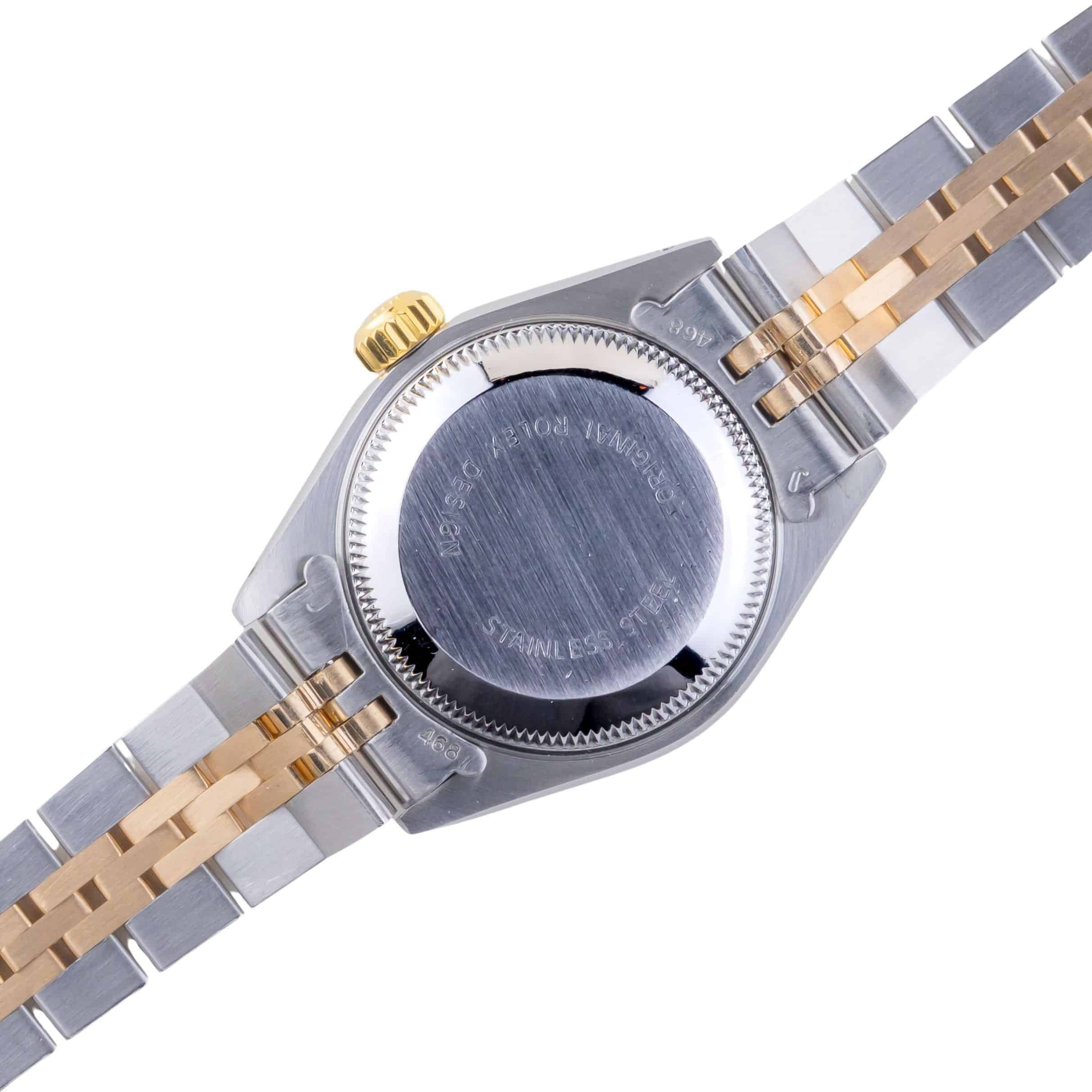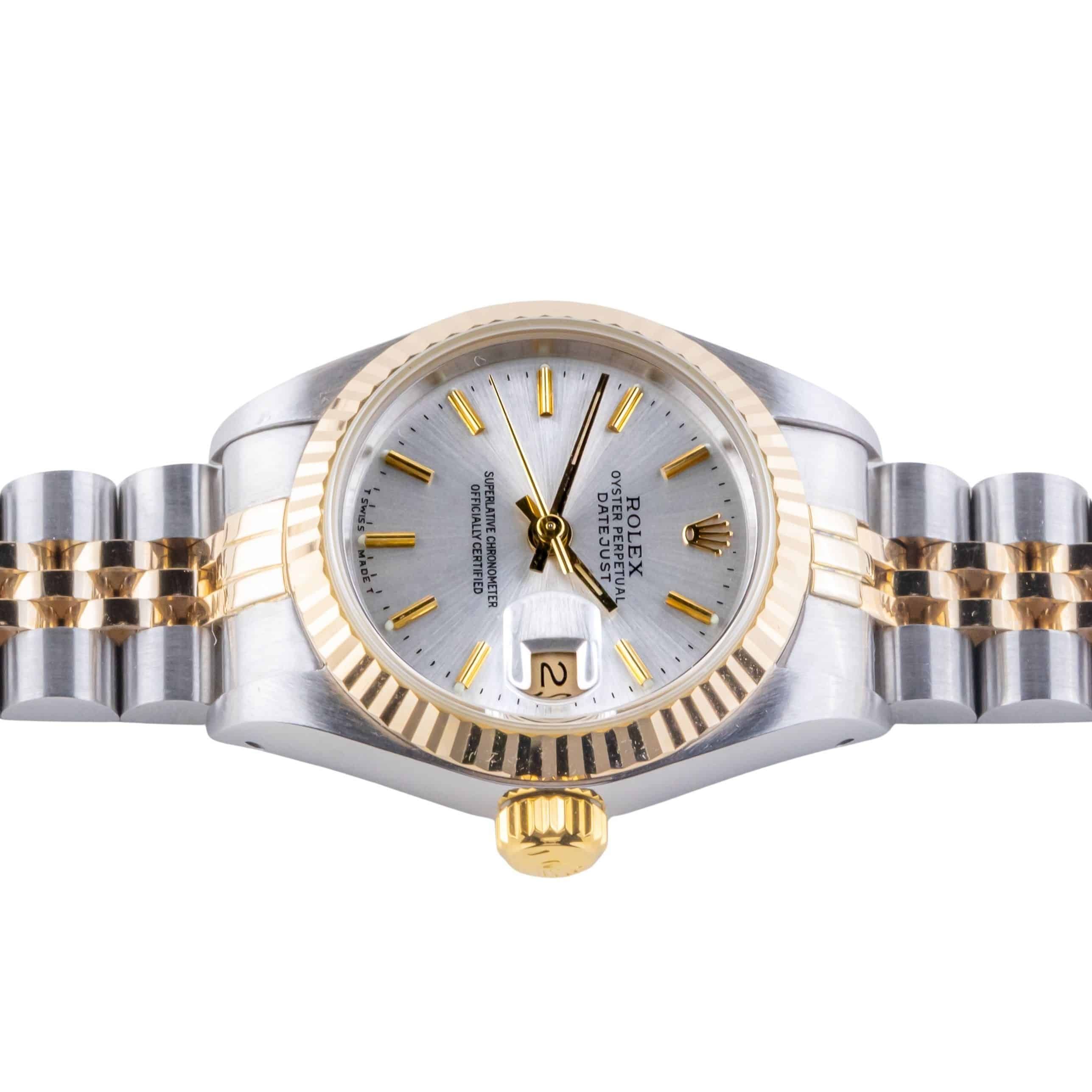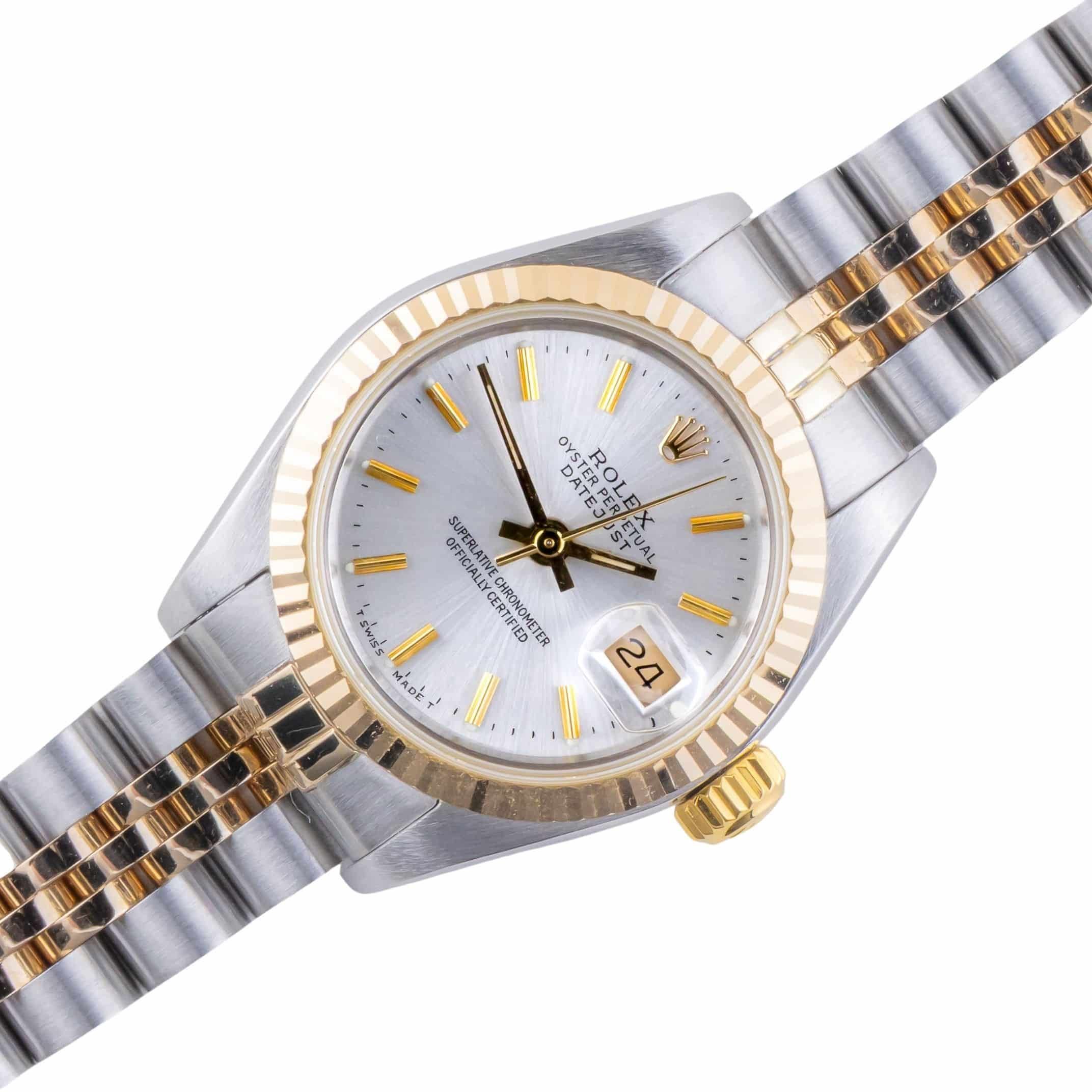 Rolex Oyster Perpetual Lady-Datejust reference 69173 from 1991 including full set. The Lady-Datejust 69173 measures a 26mm gold and stainless steel case, two-tone jubilee bracelet and fluted 14k gold bezel. This Lady-Datejust 69173 features an automatic movement caliber 2135 with quickset date function, a scratch resistance sapphire crystal and a silver dial w/ tritium hands.
