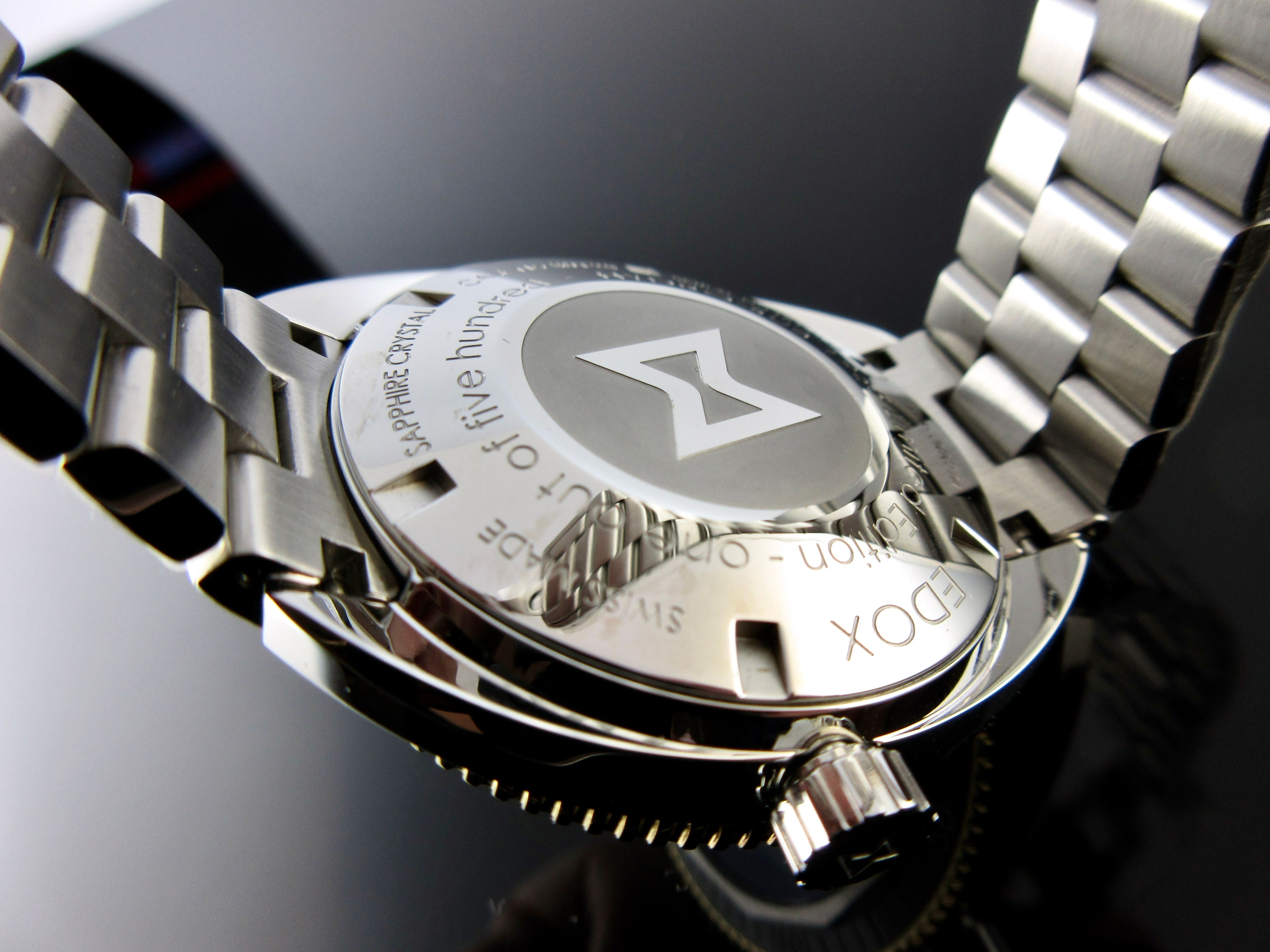 Technische Angben : Drehbare Keramiklünette , Edox Krone und/oder Drücker mit doppeltem O-Ring , Nachleuchtende Zeiger und/oder Indizes , Sicherheitsschraubkrone