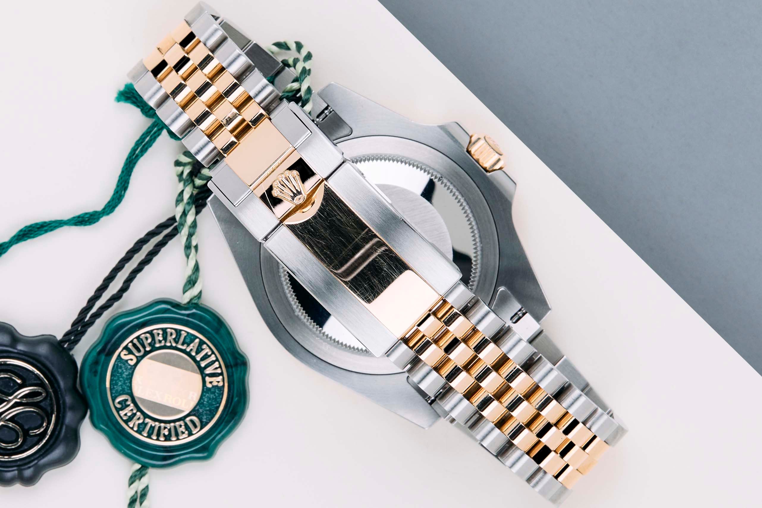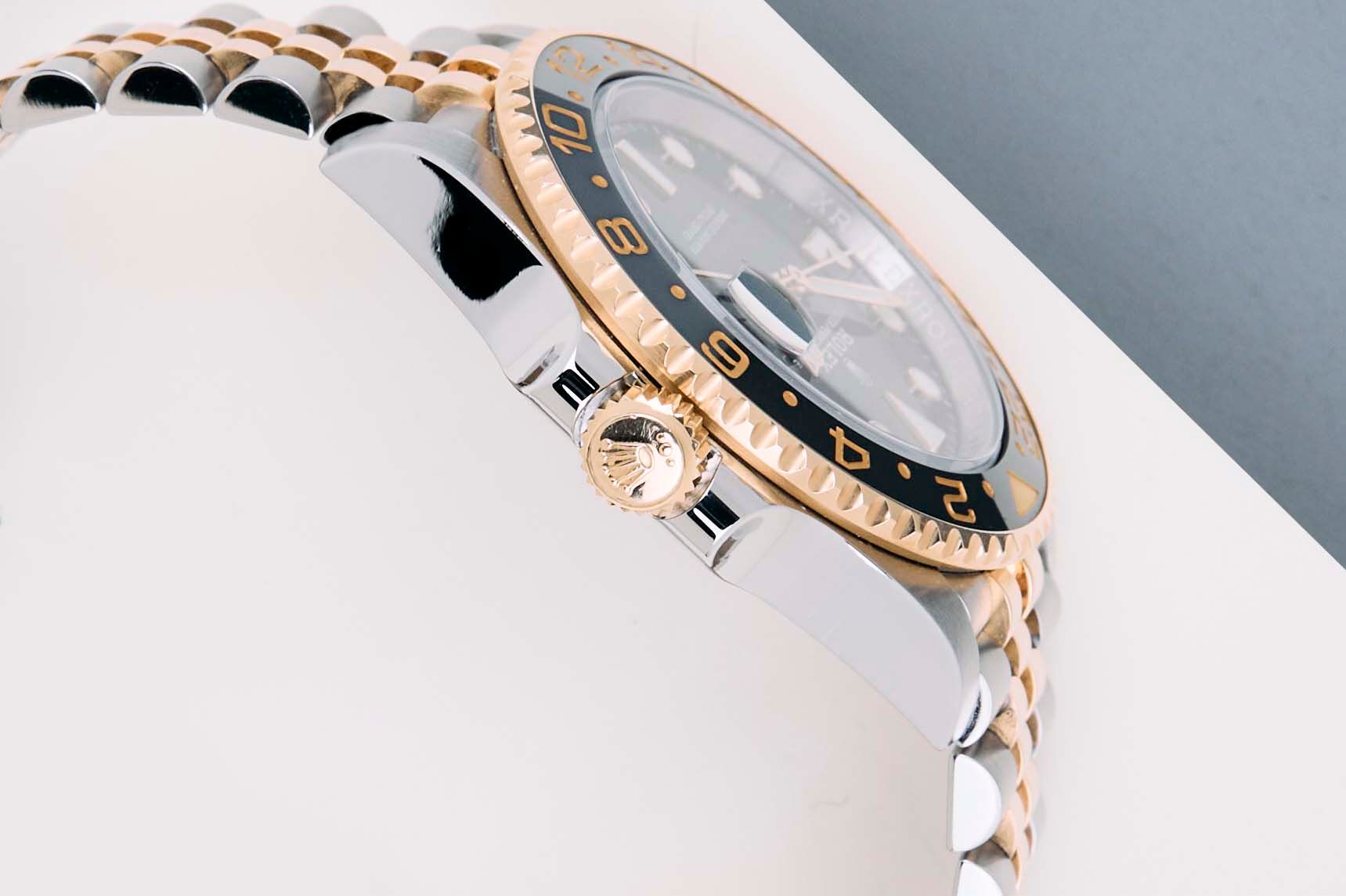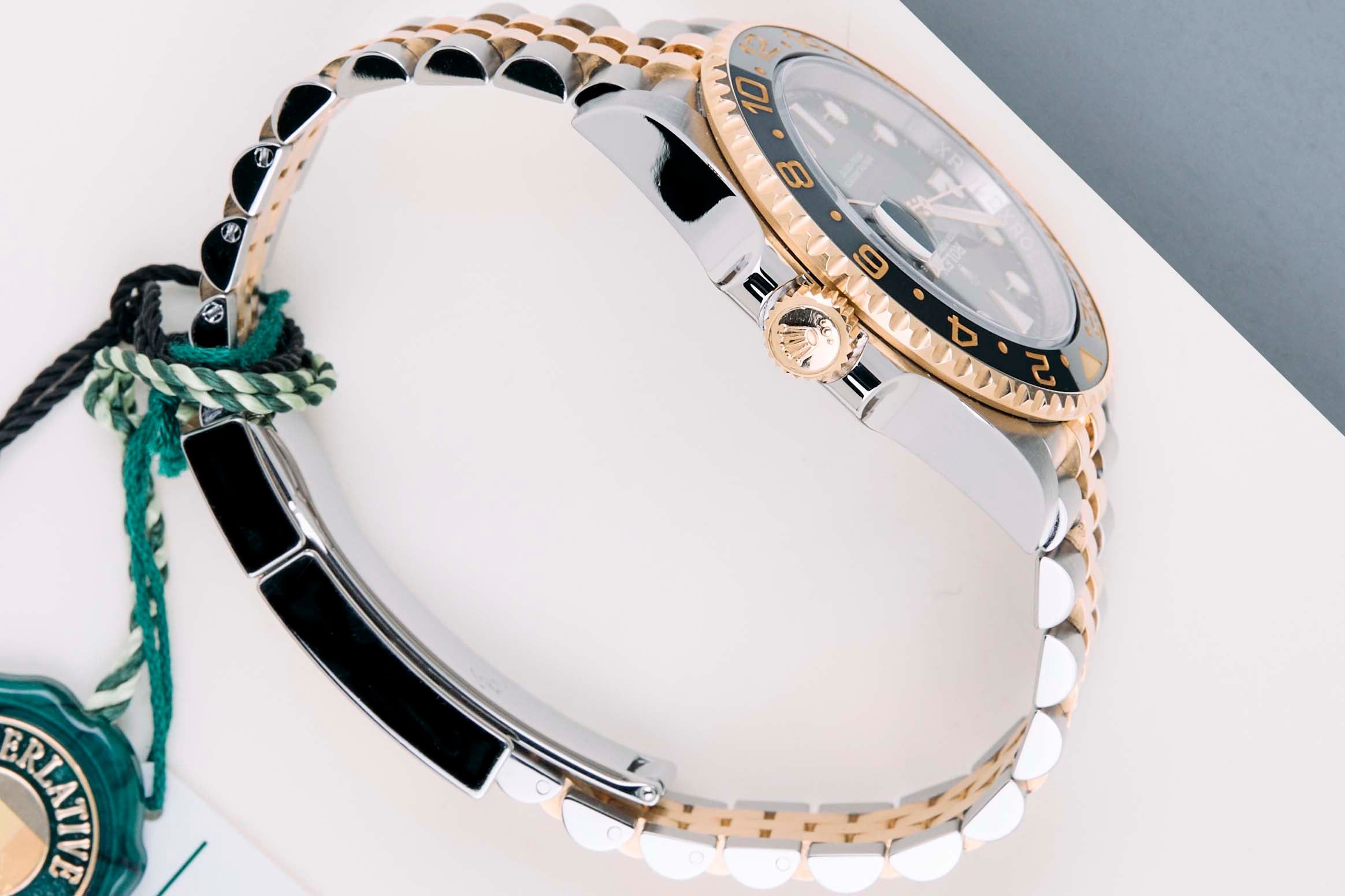 Este GMT está equipado com o Bezel Cinza e Preto, que pode ser derivado da referência 126713GRNR, Gris Noir. Este GMT-Master é feito de ouro amarelo combinado com aço inoxidável e vem com uma pulseira Jubilee, que é equipada com o Easylink. Esta extensão permite ao usuário aumentar ou diminuir a pulseira em 5 milímetros, melhorando a usabilidade e conforto do relógio.