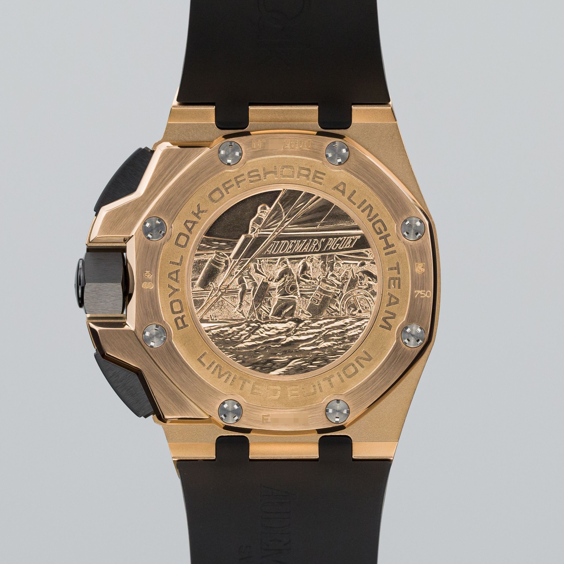 The partnership between Audemars Piguet and Alinghi led to the creation of a number of interesting models, but this particular one has the honor of being the first in the 44 mm size – a fact that makes it extremely sought-after and rare on the secondary market. The differences compared to the standard Royal Oak Offshore 44 are immediately visible – a rose gold case, the Alinghi logo (the red handwritten letter “Alfa”), and the case back with a medallion depicting a yacht crew in a race, surrounded by the inscription “Royal Oak Offshore Alinghi Team Limited Edition”.