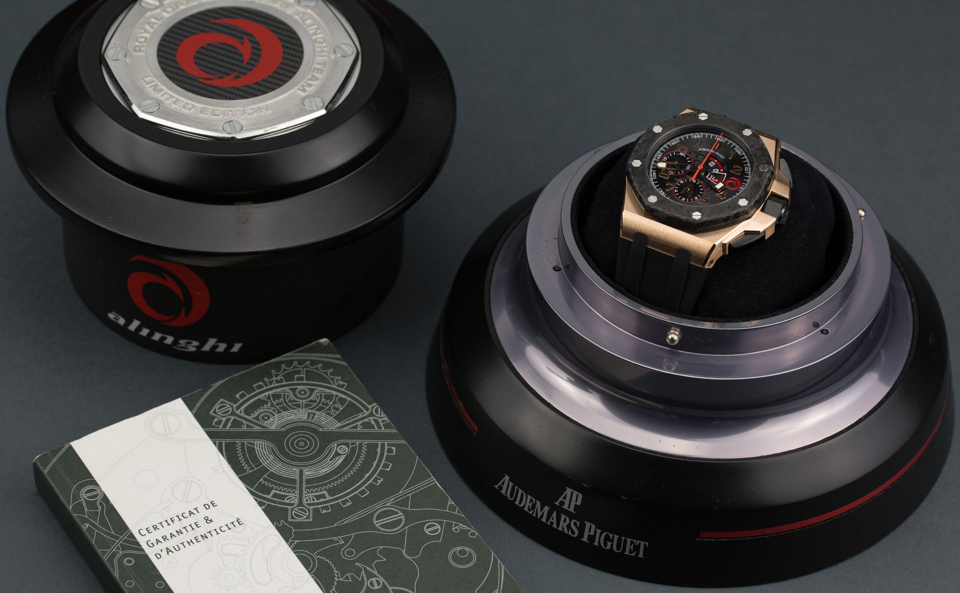 A parceria entre Audemars Piguet e Alinghi levou à criação de vários modelos interessantes, mas este em particular tem a honra de ser o primeiro no tamanho de 44 mm – um fato que o torna extremamente procurado e raro no mercado secundário. As diferenças em relação ao Royal Oak Offshore 44 padrão são imediatamente visíveis – uma caixa de ouro rosa, o logo da Alinghi (a letra “Alfa” escrita à mão em vermelho) e o fundo da caixa com um medalhão representando uma tripulação de iate em uma corrida, cercado pela inscrição “Royal Oak Offshore Alinghi Team Edição Limitada”.