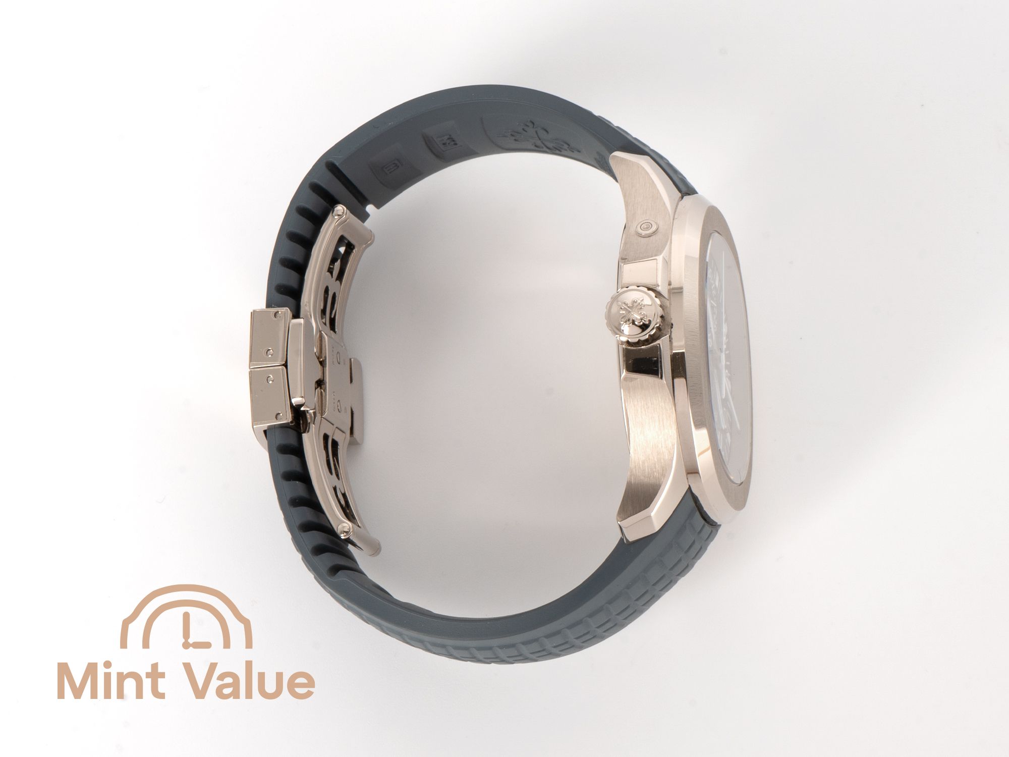 The opaline blue-gray embossed Aquanaut grid-pattern dial, combined with a matching composite strap and white gold fold-over clasp, exudes both sportiness and subtle elegance. The white gold markers and luminescent hands deliver clarity, even in low light.