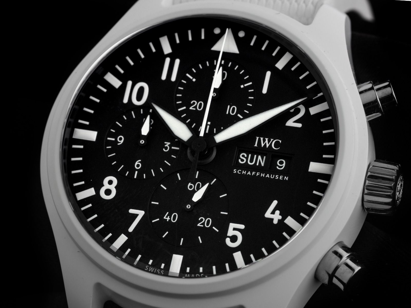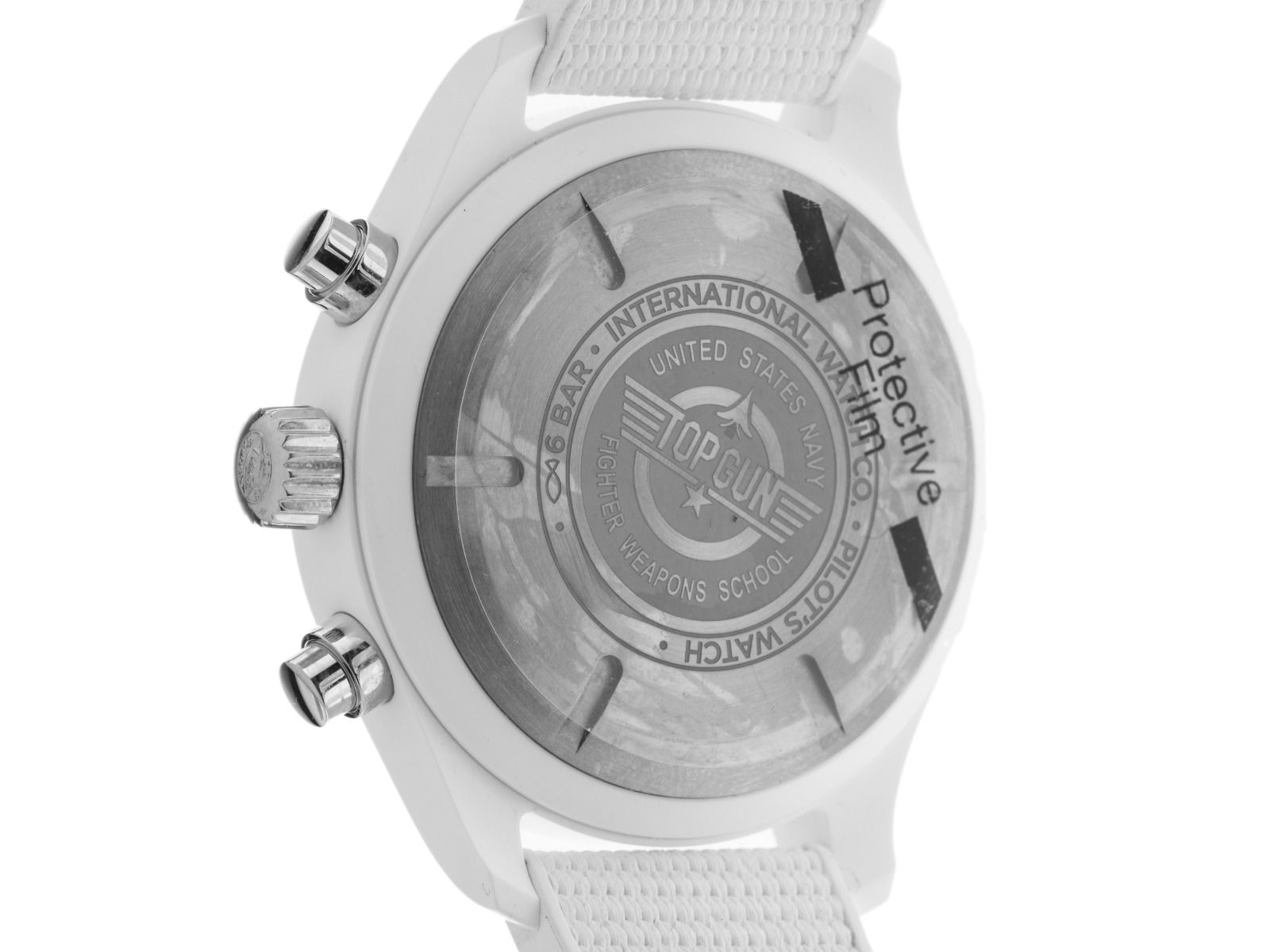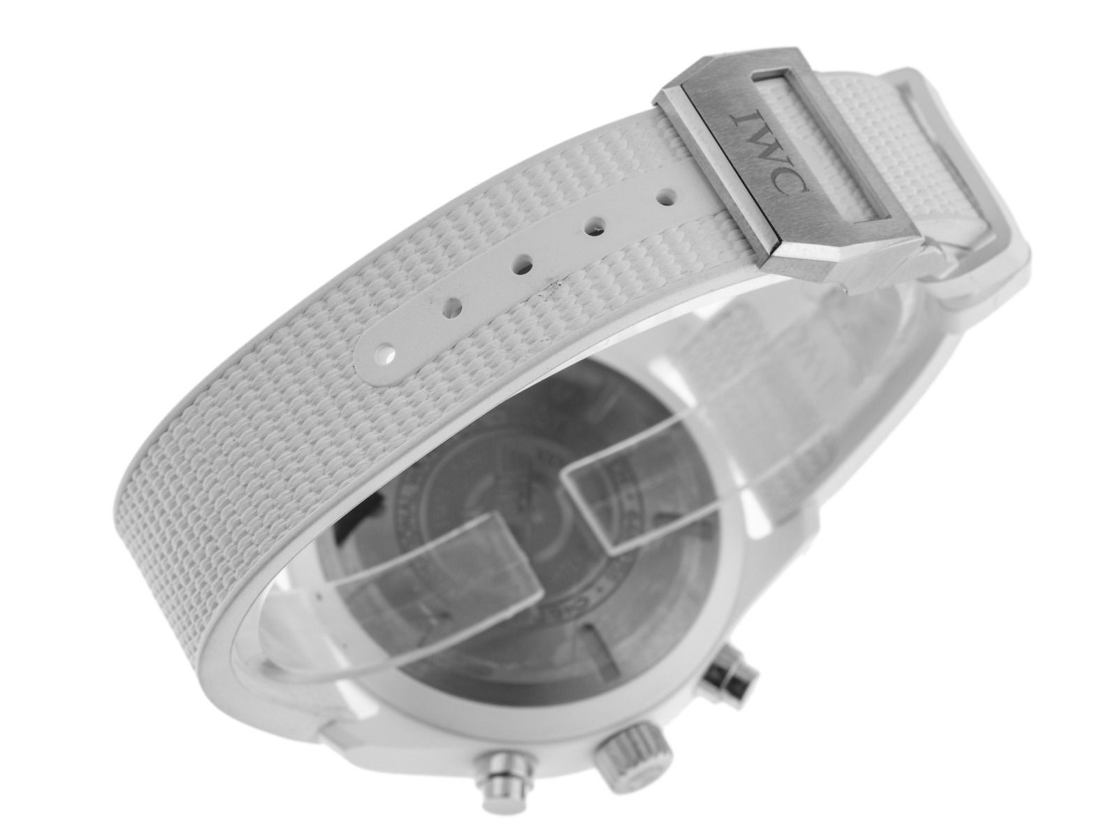 Gehäuse Keramik weiß satiniert, Gehäusedurchmesser ohne Krone 44,5mm, Gehäusehöhe 15,7mm. Armband Kautschuk weiß, Anstoßbreite 21mm, Faltschließe Edelstahl mit Hersteller-Logo. Zifferblatt schwarz mit arabischen Leuchtziffern, Leuchtindexen und schwarzen Leuchtzeigern. Uhrwerk Automatik, Chronograph, Kaliber IWC 69380 mit 33 Edelsteinen, Gangreserve ca. 46 Stunden. Anzeige von Stunde und Minute über Zeiger aus der Mitte, kleine Sekunde mit Sekundenstopp zur sekundengenauen Einstellung der Uhrzeit bei 6 Uhr, Datums- und Wochentaganzeige in Englisch mit Schnellverstellung bei 3 Uhr. Saphirglas kratzfest. Krone mit Hersteller-Logo. Boden Edelstahl verschraubt und graviert. Gewicht der Uhr inklusive Armband 137g. Wasserdicht bis 6 ATM. Referenznummer: IW389105, ID: ST1160184100426H-12700, Artikelnummer: 10000085426. Original IWC Schaffhausen Box mit Umkarton und Garantie Papiere von April 2026, Full Set. Ungetragen. Lieferzeit sofort.