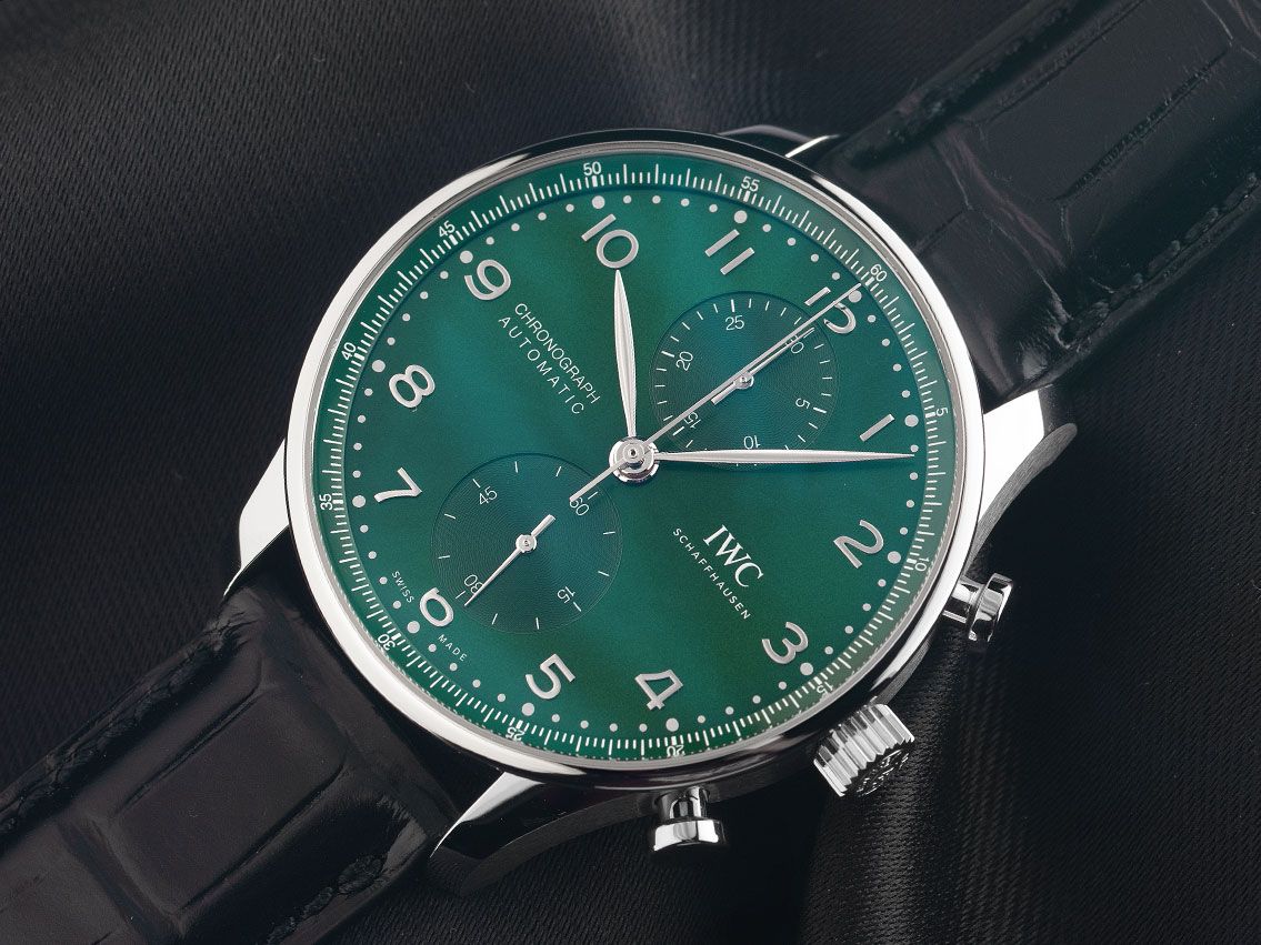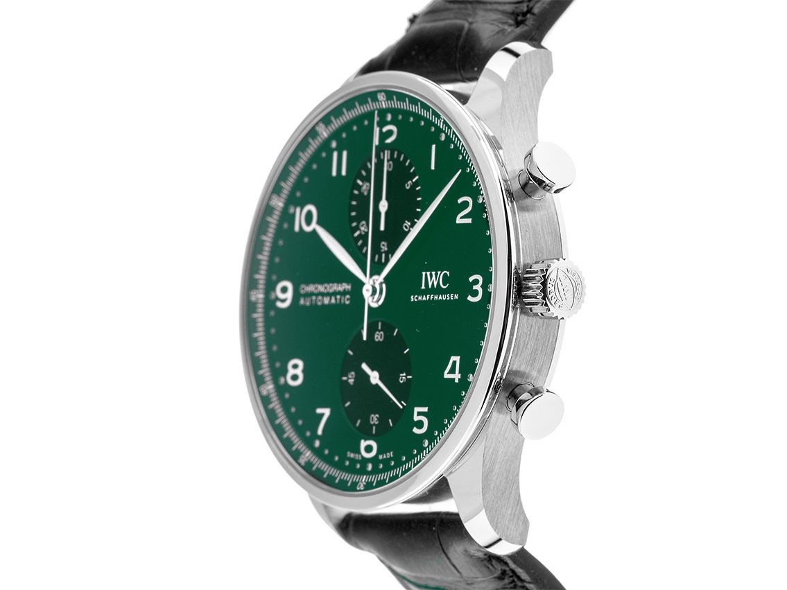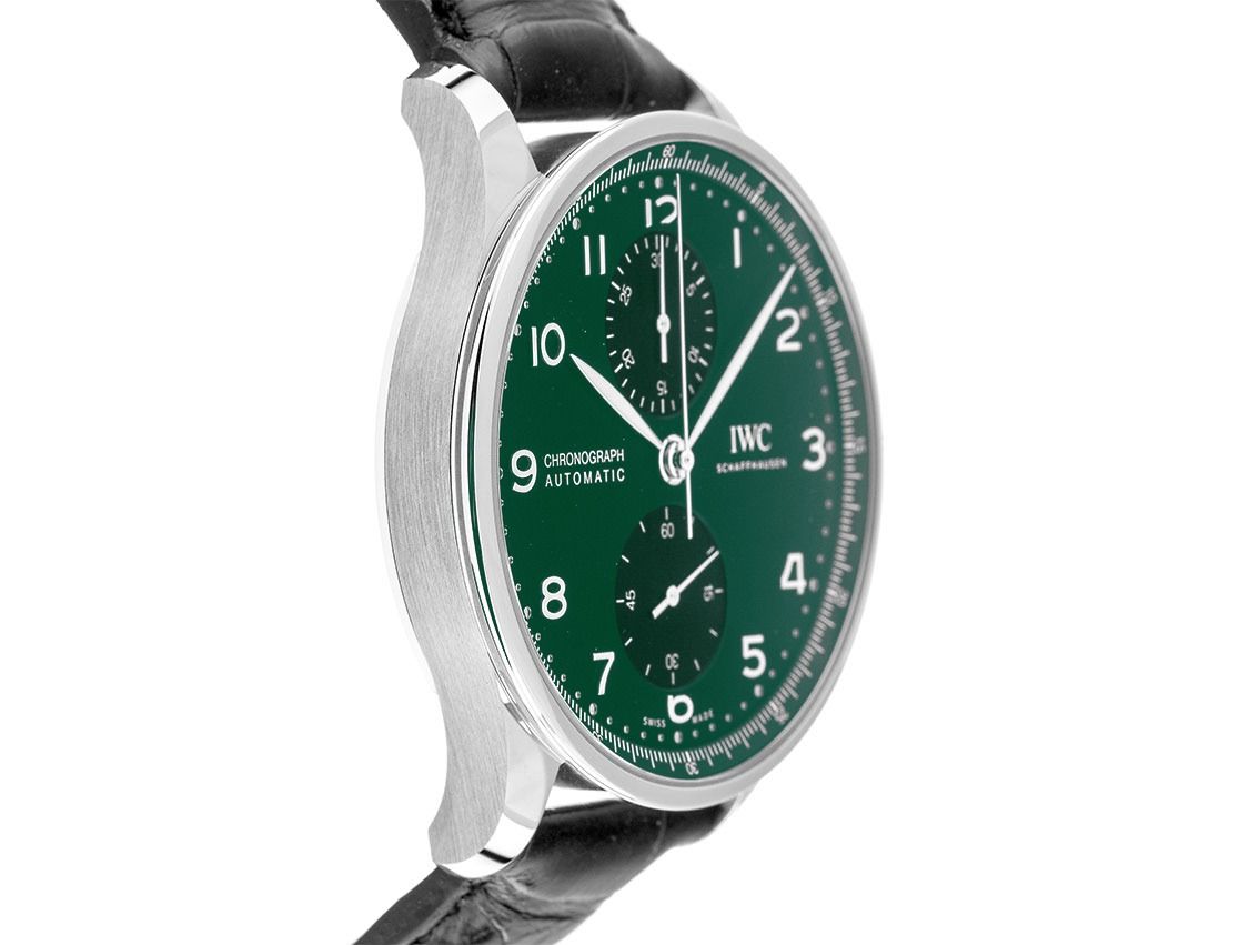Gehäuse Edelstahl poliert und satiniert, Gehäusedurchmesser ohne Krone 41mm, Gehäusehöhe 13,0mm. IWC Armband Krokoleder mit Ziernaht, Anstoßbreite 20mm, Doppelfaltschließe Edelstahl mit Hersteller-Logo. Zifferblatt grün mit aufgesetzten arabischen Edelstahl Ziffern und Edelstahl Zeigern. Uhrwerk Automatik, Chronograph, IWC Manufakturwerk 69355 mit 27 Edelsteinen, Gangreserve ca. 46 Stunden. Anzeige von Stunde und Minute über Zeiger aus der Mitte, kleine Sekunde mit Sekundenstopp zur sekundengenauen Einstellung der Uhrzeit bei 6 Uhr. Saphirglas kratzfest und gewölbt. Krone mit Hersteller-Logo. Boden Edelstahl 4-fach verschraubt und graviert mit Saphirglas Sichtfenster. Gewicht der Uhr inklusive Armband 87g. Wasserdicht bis 3 ATM. Referenznummer: IW371615, ID: ST1160130280426H-9100, Artikelnummer: 10000085429. Original IWC Box mit Umkarton und Garantie Papiere von März 2026 sowie Beschreibung, Full Set. Ungetragen. Lieferzeit sofort.