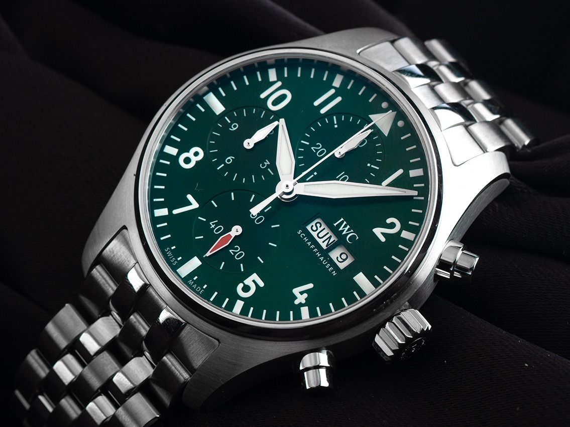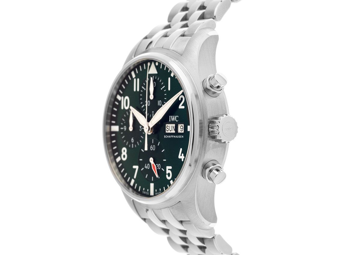 IWC Pilot´s Watch Chronograph Stahl Automatik Armband StahlGehäuse Edelstahl poliert und satiniert, Gehäusedurchmesser ohne Krone 41mm, Gehäusehöhe 14,4mm. Lünette Edelstahl glatt und poliert. Armband Edelstahl poliert und satiniert, Sicherheitsfaltschließe Edelstahl mit Hersteller-Logo. Zifferblatt grün mit weißen arabischen Ziffern und Indexen sowie Edelstahl Leuchtzeigern. Uhrwerk Automatik, Chronograph, IWC Manufakturkaliber 69385 mit 33 Edelsteinen, Gangreserve ca. 46 Stunden. Anzeige von Stunde und Minute über Zeiger aus der Mitte, kleine Sekunde mit Sekundenstopp zur sekundengenauen Einstellung der Uhrzeit bei 6 Uhr, Wochentaganzeige in Englisch und Datumsanzeige mit Schnellverstellung bei 3 Uhr. Saphirglas kratzfest, gewölbt und beidseitig entspiegelt. Krone verschraubbar mit Hersteller-Logo. Boden Edelstahl verschraubt und graviert mit Saphirglas Sichtfenster. Gewicht der Uhr inklusive Armband 170g, Länge des Armbandes inklusive Gehäuse 175mm. Wasserdicht bis 10 ATM. Referenznummer: IW388104, ID: ST1160124620426H-8600, Artikelnummer: 10000085436. Original IWC Box mit Umkarton und Garantie Papiere von April 2026 sowie Beschreibung, Full Set. Ungetragen. Lieferzeit sofort.