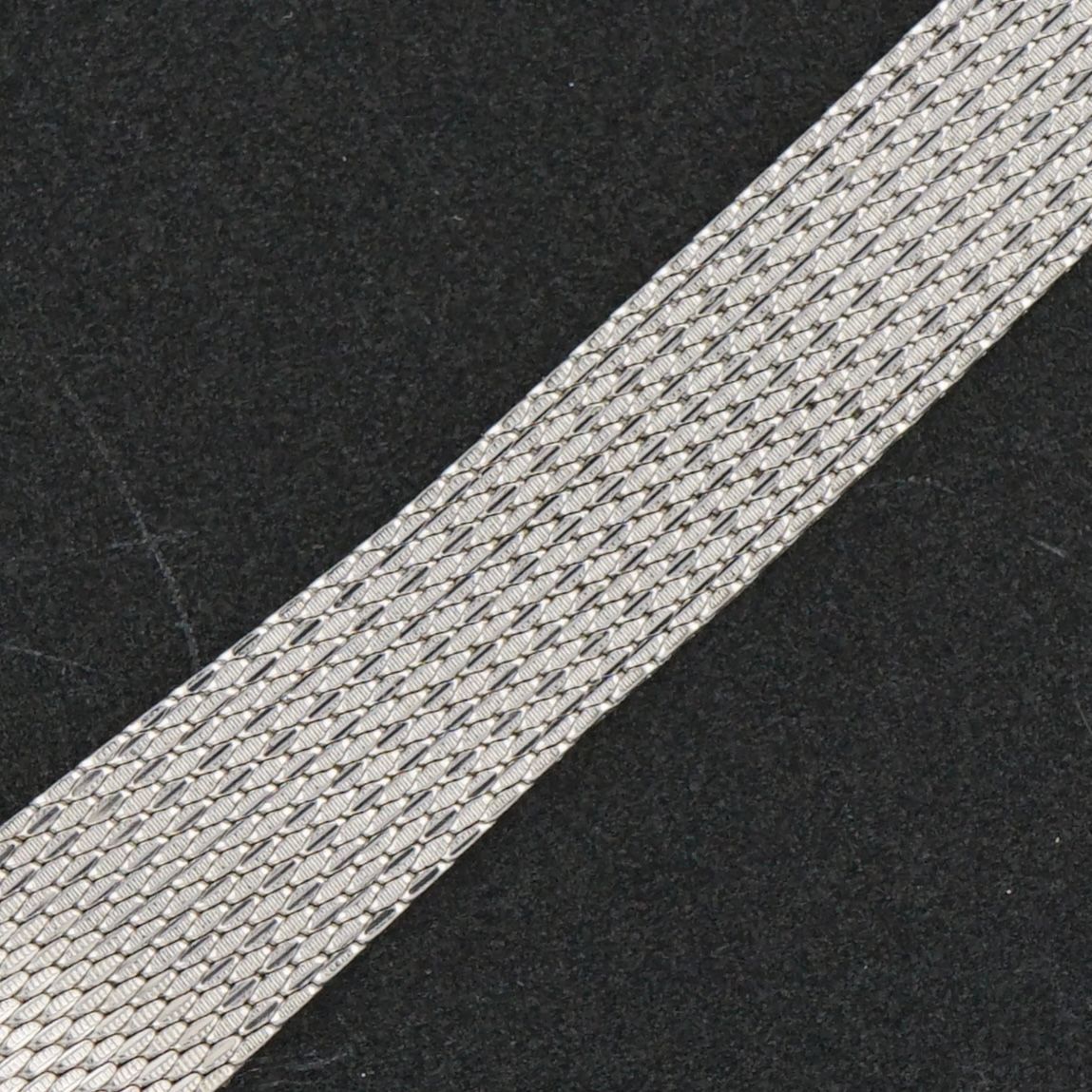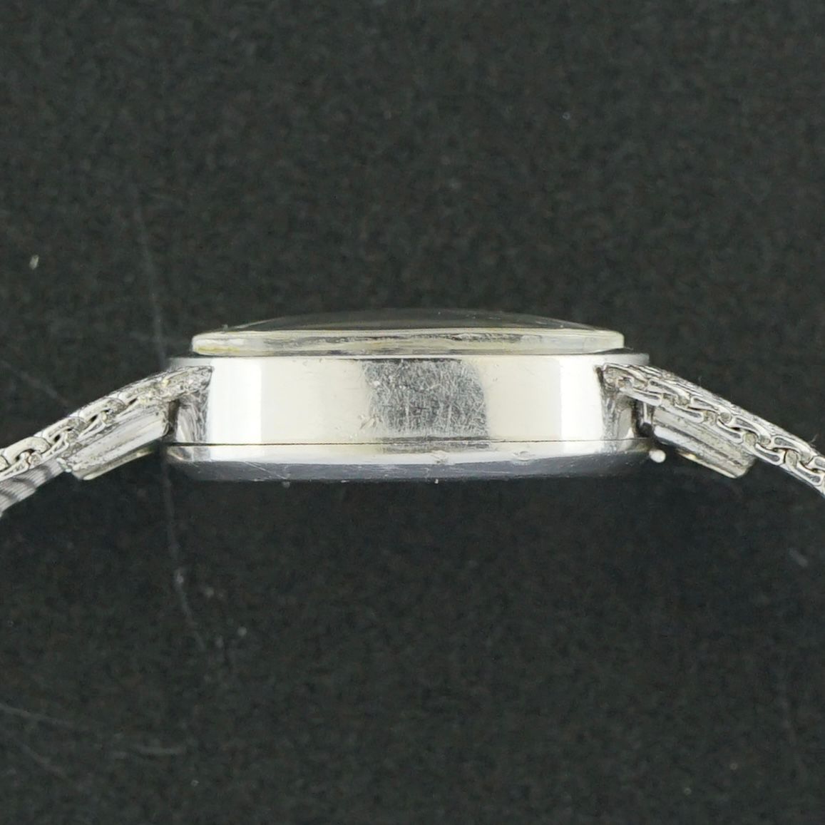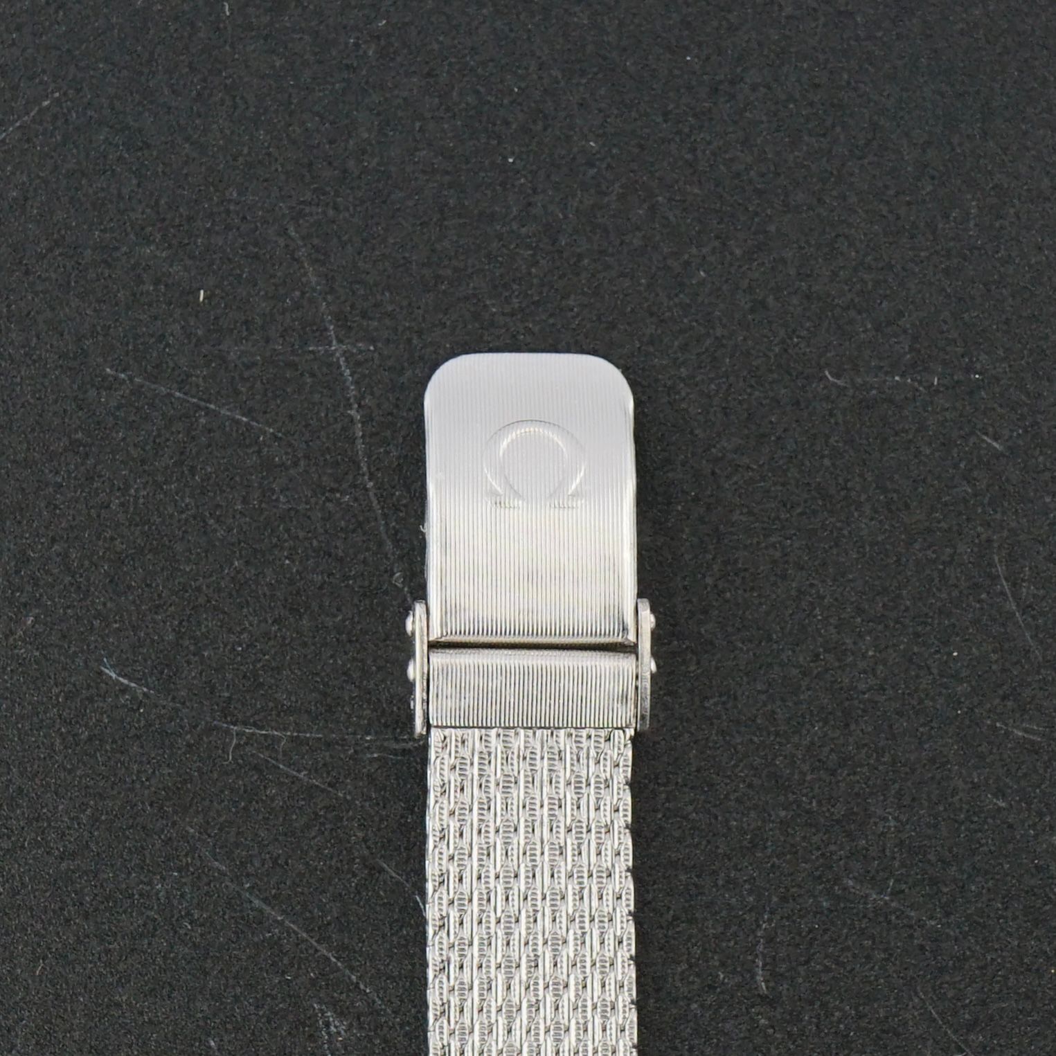 A Vintage Omega Lady from 1972 with a 10-carat white gold-filled case and matching original Omega mesh bracelet, the case measuring 17 mm in width and 21 mm from top to bottom. Features a beautiful silver dial with vertical brushed finish. Powered by a caliber 485 manual wind movement, serviced in April 2026 and running and functioning excellently. The original 10-carat gold-filled mesh bracelet is fully adjustable, fitting wrists from 7 to 17 cm. Overall, a beautiful, uncommon, and very well-dressed vintage piece for a lady’s wrist.