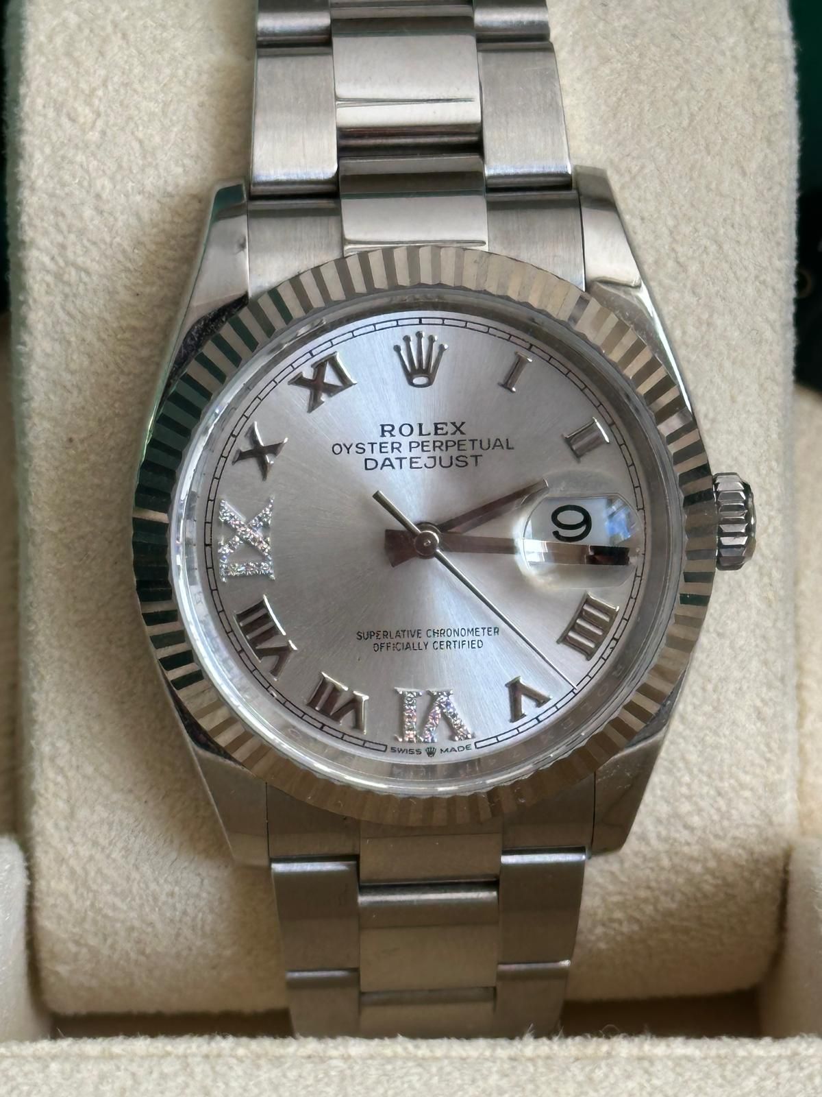 This iconic Rolex Datejust 36 ref. 126234 is presented with the elegant silver dial featuring Roman numerals and diamond-set hour markers—one of the most refined and sought-after configurations within the Datejust collection. The combination of the 36 mm Oyster case in Oystersteel, the distinguished white gold fluted bezel, and the sophisticated silver dial results in a perfectly balanced timepiece that embodies Rolex’s signature blend of luxury, precision, and timeless design.This example is offered in excellent condition and is dated 2022. The watch is powered by the Rolex in-house caliber 3235, celebrated for its exceptional precision, robustness, and approximately 70-hour power reserve, and naturally operates within Rolex Superlative Chronometer specifications.