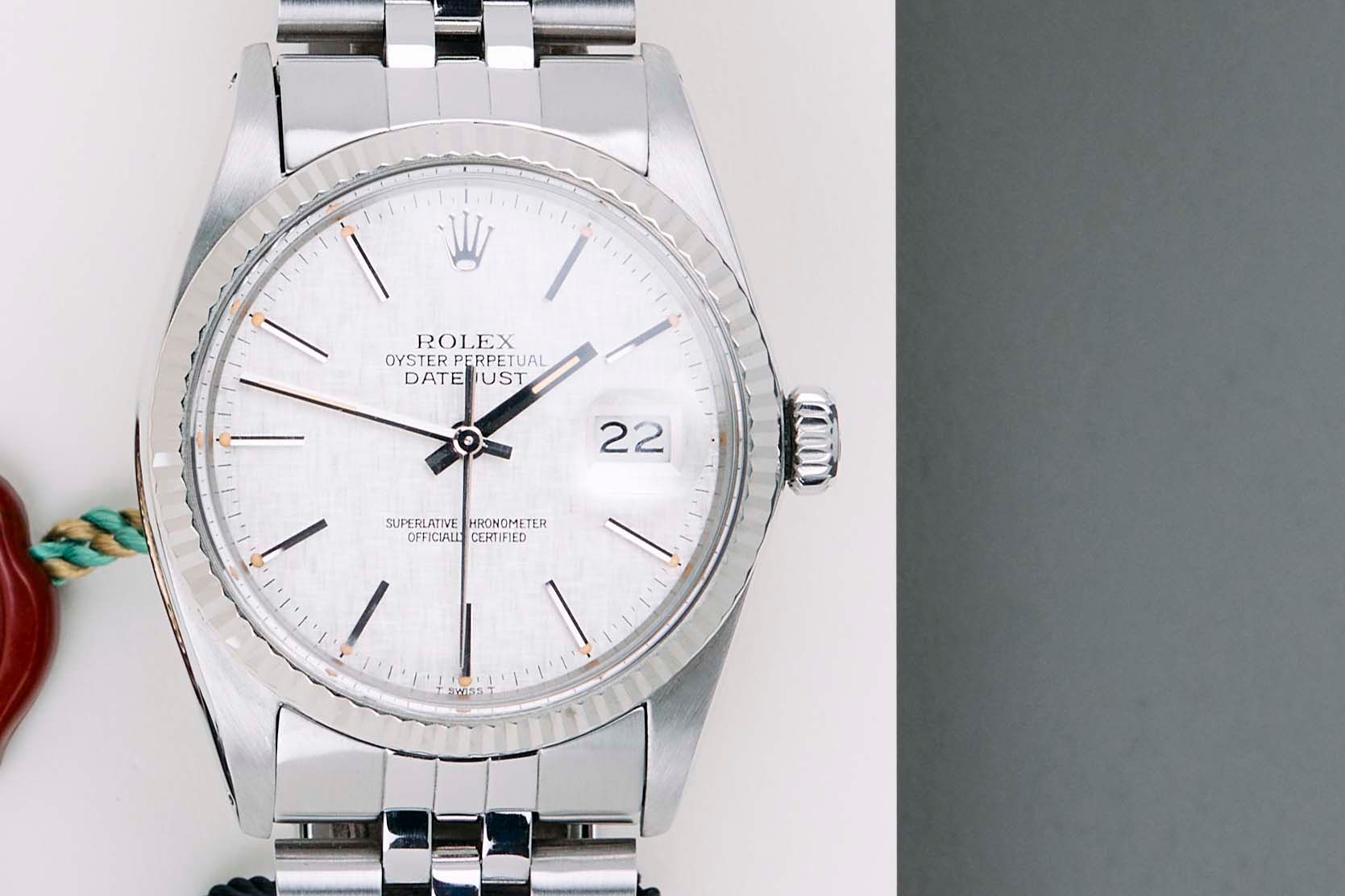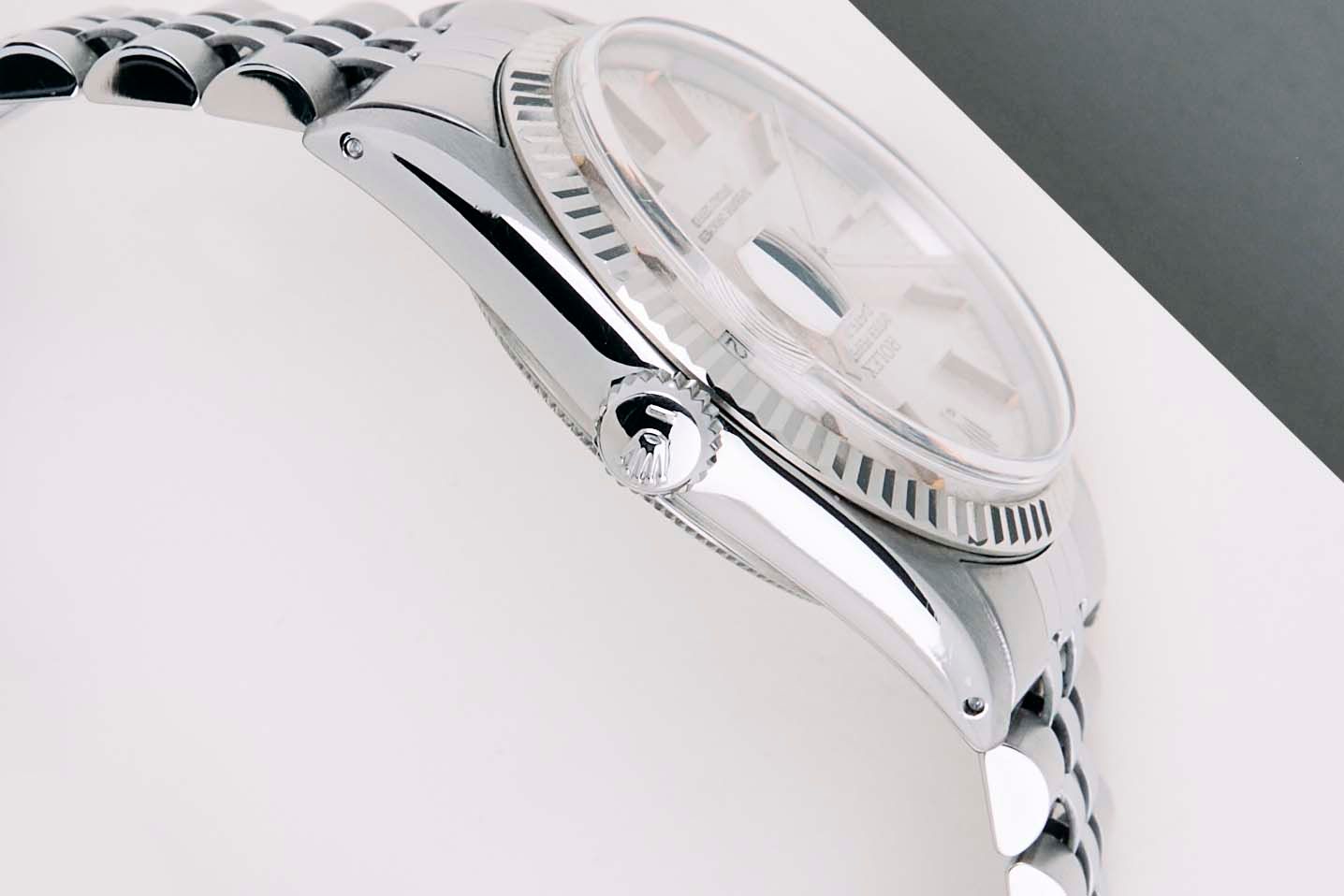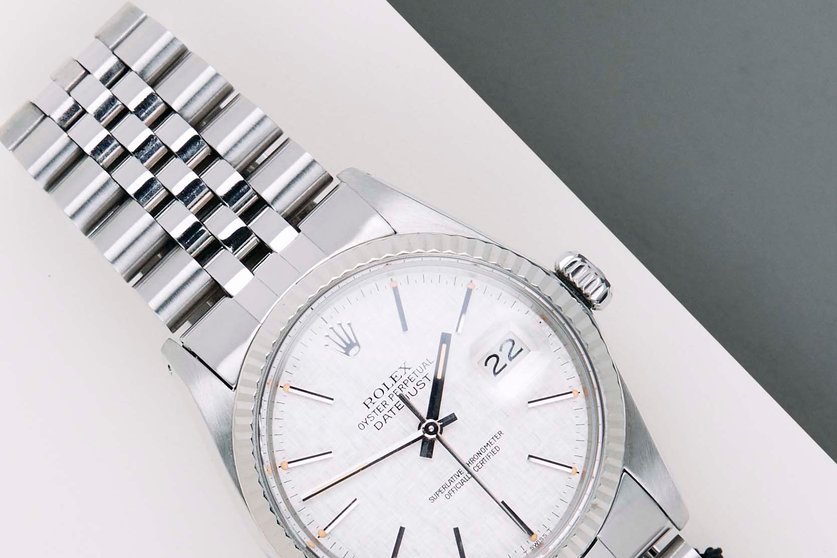 Rolex introduced the original Datejust in 1945 to celebrate the company's 40th anniversary. Due to the various case sizes and materials, the Datejust has been ingrained in Rolex's history and remains incredibly popular for 75 years.This Rolex Datejust 36 'Linnen Dial - Jubilee' was sold for the first time in December 1985.This Datejust is made of a combination of 18k White Gold and stainless steel and is fitted with a Jubilee bracelet. This 16014 is equipped with an original T Swiss T 'Linnen' Dial. In addition, the Datejust is equipped with an open 6 & 9 Date Wheel. The main benefit of a 16014 over a 1601 is the quick-set function for the date.This Rolex Datejust 36 is in mint condition. Furthermore, the watch has been serviced by our watchmaker, and therefore it comes with one year of Steiner warranty.