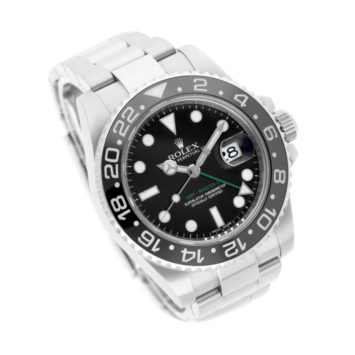 2011 Rolex GMT-Master II with a 40mm stainless steel case and folding clasp. This men's Rolex watch is in very good condition.