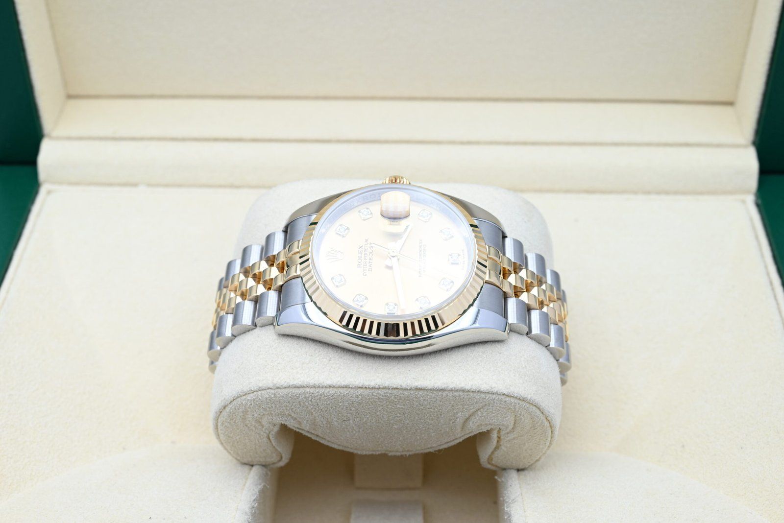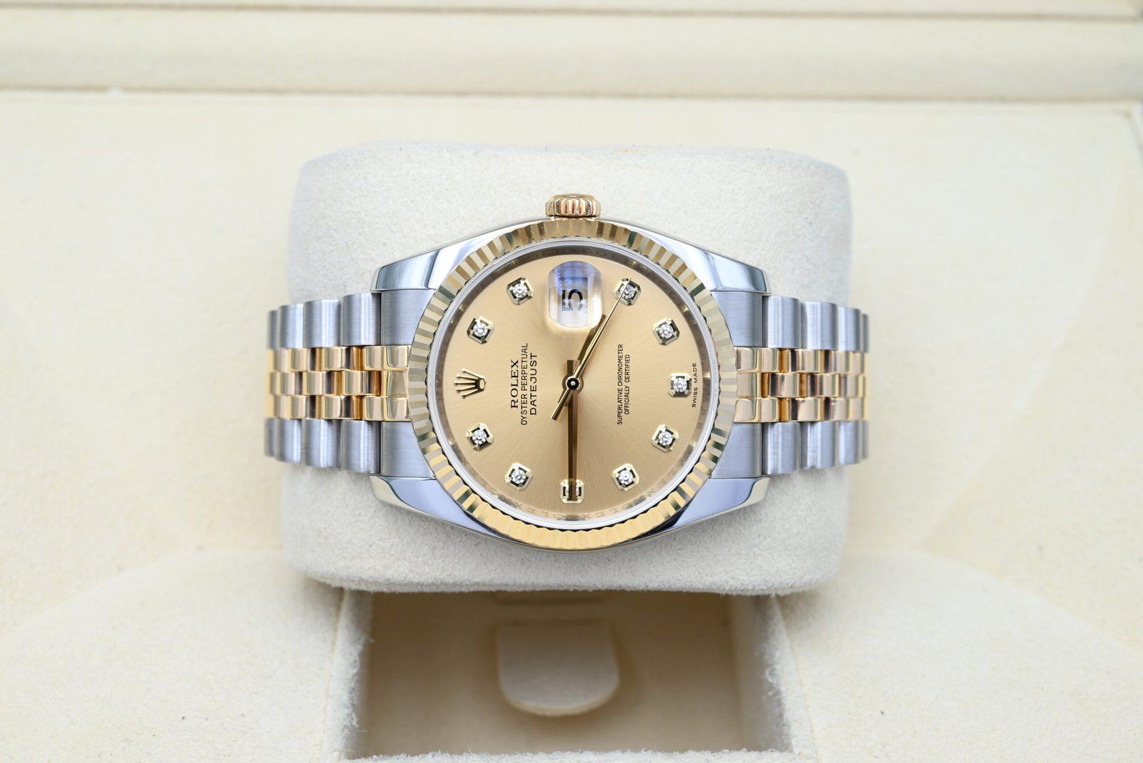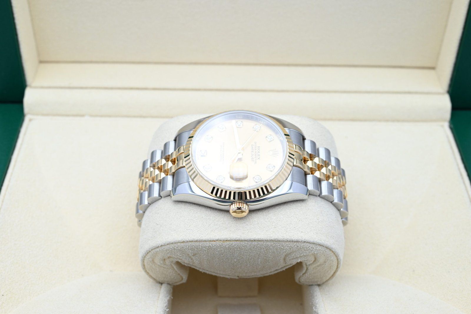 Rolex Datejust 116233 de 2009 com o mostrador de diamante champagne em excelente estado, incluindo a caixa e os documentos originais. Todos os nossos relógios foram cuidadosamente verificados pelo nosso próprio relojoeiro e passaram por manutenção quando necessário.