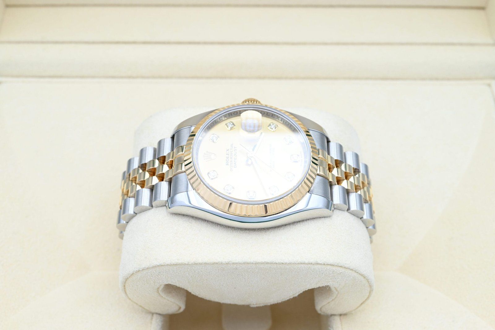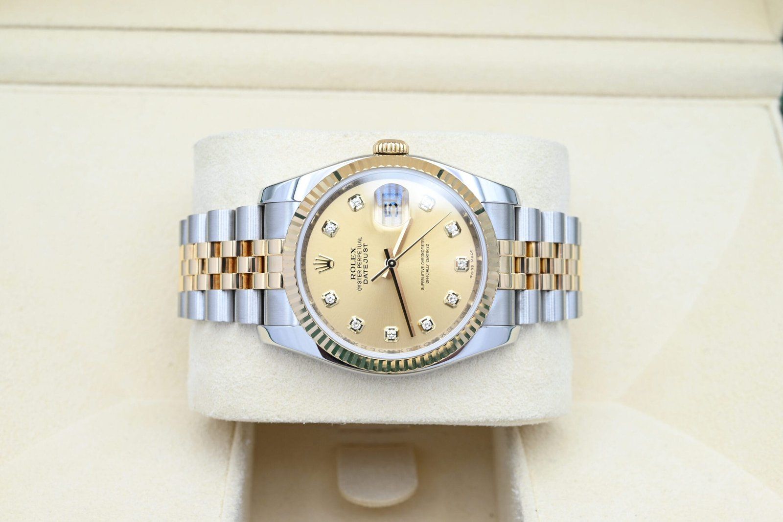 Rolex Datejust 116233 de 2007 com o mostrador de diamante champagne em excelente estado, vem completo com o conjunto completo. Todos os nossos relógios foram minuciosamente verificados pelo nosso próprio relojoeiro e passaram por manutenção quando necessário.