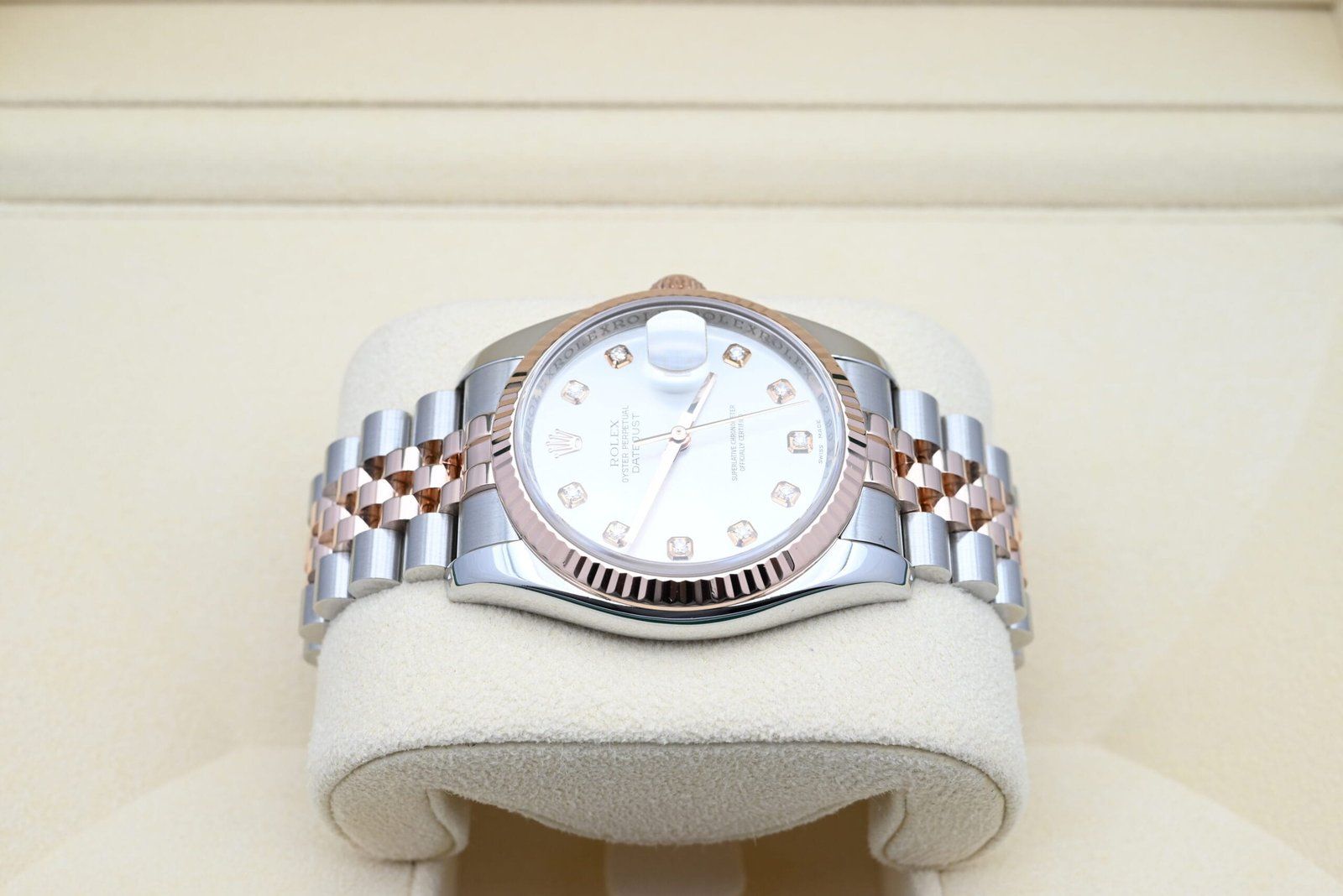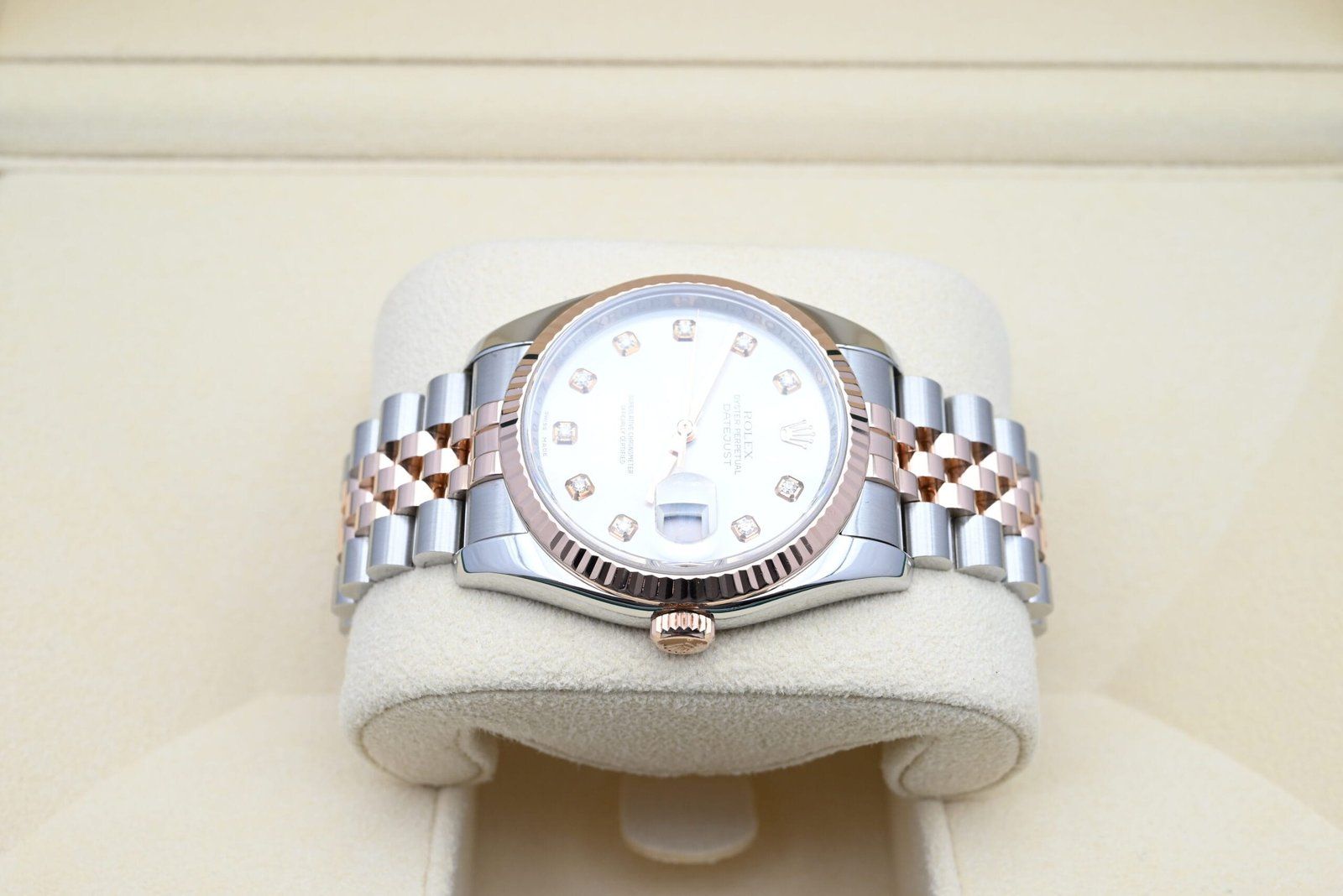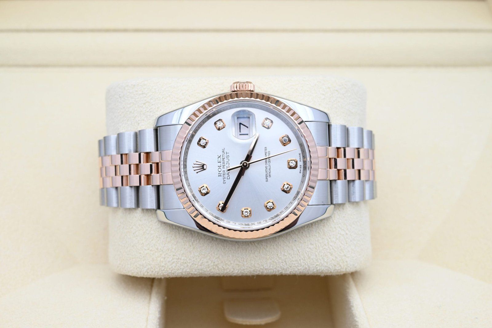 Rolex Datejust 116231 com o mostrador prateado com diamantes em excelente estado, incluindo a caixa e os documentos originais. Todos os nossos relógios foram minuciosamente verificados pelo nosso próprio relojoeiro e servidos quando necessário.
