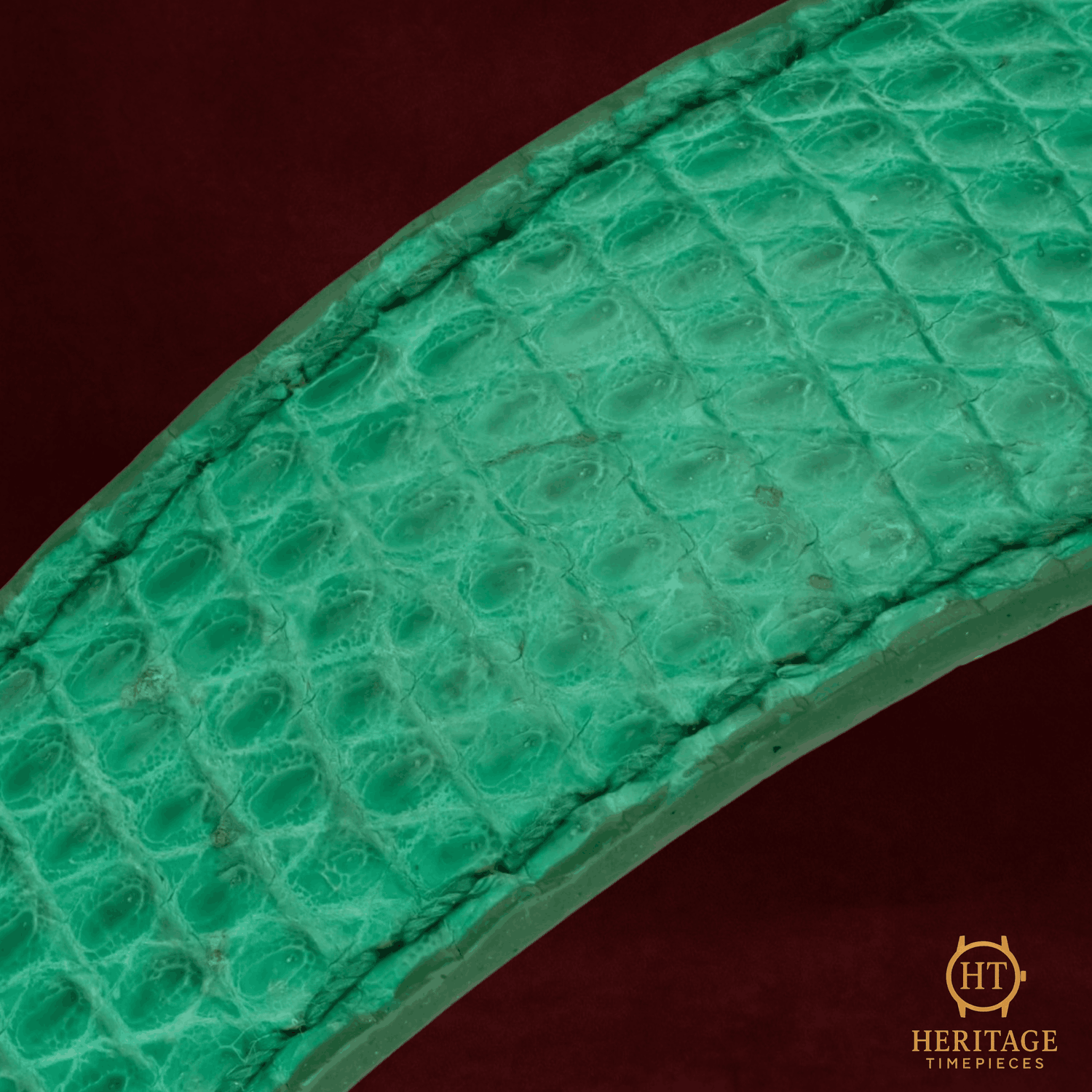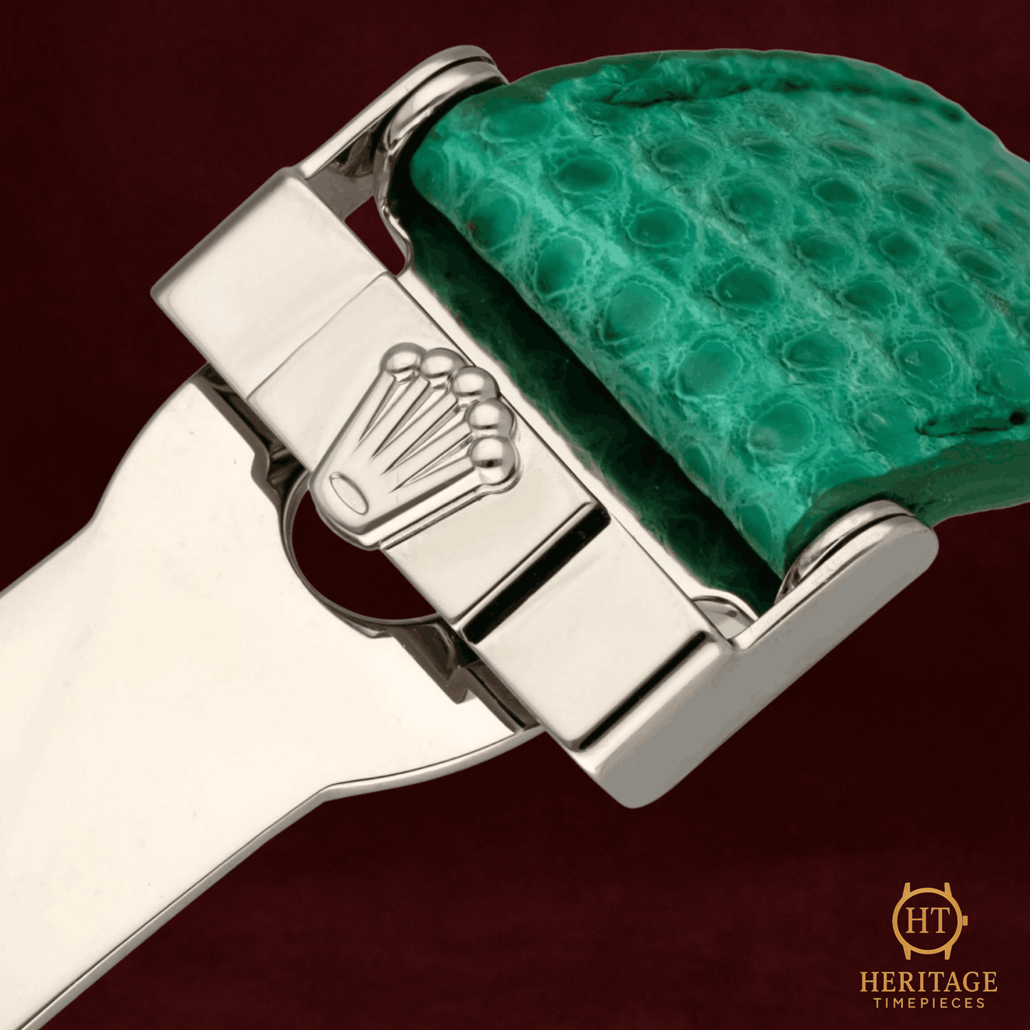 Heritage Narrative The Rolex Cosmograph Daytona “Beach” collection remains one of the most vibrant and collectible chapters in modern Daytona history. Released in the early 2000s, these rare references were produced in very limited quantities and presented in four distinctive lacquered dial colors — turquoise, pink, yellow, and green — each paired with a matching alligator strap. This reference 116519, crafted in 18k white gold, showcases the stunning green “Beach” dial, featuring applied Roman numerals and a glossy enamel finish that captures light in extraordinary ways. The combination of the vivid green palette and white gold case gives the piece both a playful and highly luxurious presence, embodying Rolex’s unique ability to balance craftsmanship and creativity. This 2006 example, accompanied by a Rolex factory service completed in 2022, is offered with its full original setincluding box, certificate, and manuals. Among the rarest and most distinctive modern Daytonas, the “Beach Green” remains a standout collector’s piece within the lineage of the 116519. Technical Specifications Reference:116519 “Beach Green” Year:2006 (Factory service 2022) Movement:Rolex Calibre 4130, automatic, chronometer-certified, column wheel and vertical clutch, 72-hour power reserve, small seconds at 6 o’clock, 30-minute counter at 3 o’clock, 12-hour counter at 9 o’clock Case:40 mm 18k white gold Oyster case, screw-down Triplock crown and pushers, polished finish Bezel:Fixed 18k white gold bezel with engraved tachymeter scale Crystal:Scratch-resistant sapphire Dial / Hands:Glossy green lacquered dial with applied Roman numerals, luminous white gold hands, matching green subdials Bracelet / Clasp:Green alligator leather strap with 18k white gold deployant clasp Water resistance:100 m / 330 ft (factory rating) Condition & Inclusions Overall grade:Pre-owned — excellent condition following Rolex factory service Service status:Rolex factory service completed in 2022; under Rolex service warranty Set:Full set — Rolex presentation box, warranty card, manuals, and service papers Shipping & Logistics Stored off-site and shipped fully insured within 1–3 business days. Worldwide shipping available; buyer responsible for any import duties or taxes. Shipping & Returns Complimentary insured worldwide shipping and a 14-day return window (watch must be returned in the same condition supplied). Every timepiece is authenticated, time-graphed, and prepared for secure transit. All shipments include full inspection before dispatch, professional packaging, and tracking updates throughout delivery. Returns are accepted within the 14-day period for store credit or refund, subject to condition verification upon receipt.
