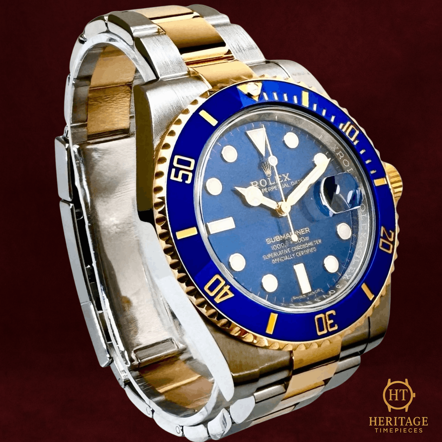Heritage Narrative The Rolex Submariner reference 116613 marks a pivotal evolution in the Submariner lineage, introducing modern materials and a more robust presence while preserving the model’s legendary identity. Launched as the successor to the aluminum-bezel 16613, this reference brought the Submariner firmly into the modern era. The defining feature is Rolex’s proprietary Cerachrom ceramic bezel, here executed in deep blue with gold-filled engravings. This innovation delivers exceptional resistance to scratches, fading, and corrosion, while maintaining the unmistakable Submariner aesthetic. Paired with the rich blue sunburst dial and gold-accented luminous markers, the 116613 strikes a precise balance between professional dive capability and refined luxury. Constructed in Rolesor steel and 18k yellow gold, this model also introduced the broader “maxi case” with thicker lugs and crown guards, giving the watch a more substantial and confident stance on the wrist. Despite its enhanced proportions, it remains unmistakably a Submariner, engineered for reliability, legibility, and durability in extreme conditions. The 116613 is widely regarded as the blueprint for modern two-tone Submariners, combining contemporary Rolex technology with one of the brand’s most iconic color combinations. Technical Specifications Reference:116613 Year:2011 Movement:Rolex automatic mechanical movement, self-winding, chronometer-certified Case:40 mm Oyster case in stainless steel with screw-down Triplock crown and caseback Bezel:Unidirectional rotating 18k yellow gold bezel with blue Cerachrom ceramic insert and 60-minute diving scale Crystal:Scratch-resistant sapphire crystal with Cyclops magnifier over the date Dial / Hands:Blue dial with luminous hour markers in gold surrounds and Mercedes hands Bracelet / Clasp:Two-tone Oyster bracelet in stainless steel and 18k yellow gold with Oysterlock safety clasp Water resistance:300 m / 1,000 ft (factory rating) Condition & Inclusions Overall grade:Pre-owned — mint condition Service status:Pre-owned — mint condition Set:Full set including original Rolex box, warranty certificate, booklets, and tag Shipping & Logistics Stored off-site and shipped fully insured within 1–3 business days.Worldwide shipping available; buyer responsible for any import duties or taxes. Shipping & Returns Complimentary insured worldwide shipping and a 14-day return window (watch must be returned in the same condition supplied). Each timepiece is authenticated, carefully inspected, and professionally prepared prior to dispatch. All shipments include secure packaging, tracking, and full insurance coverage.