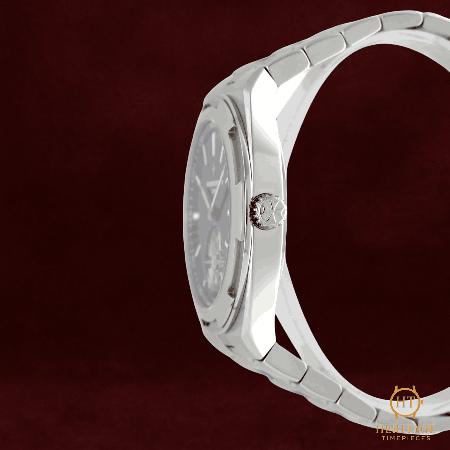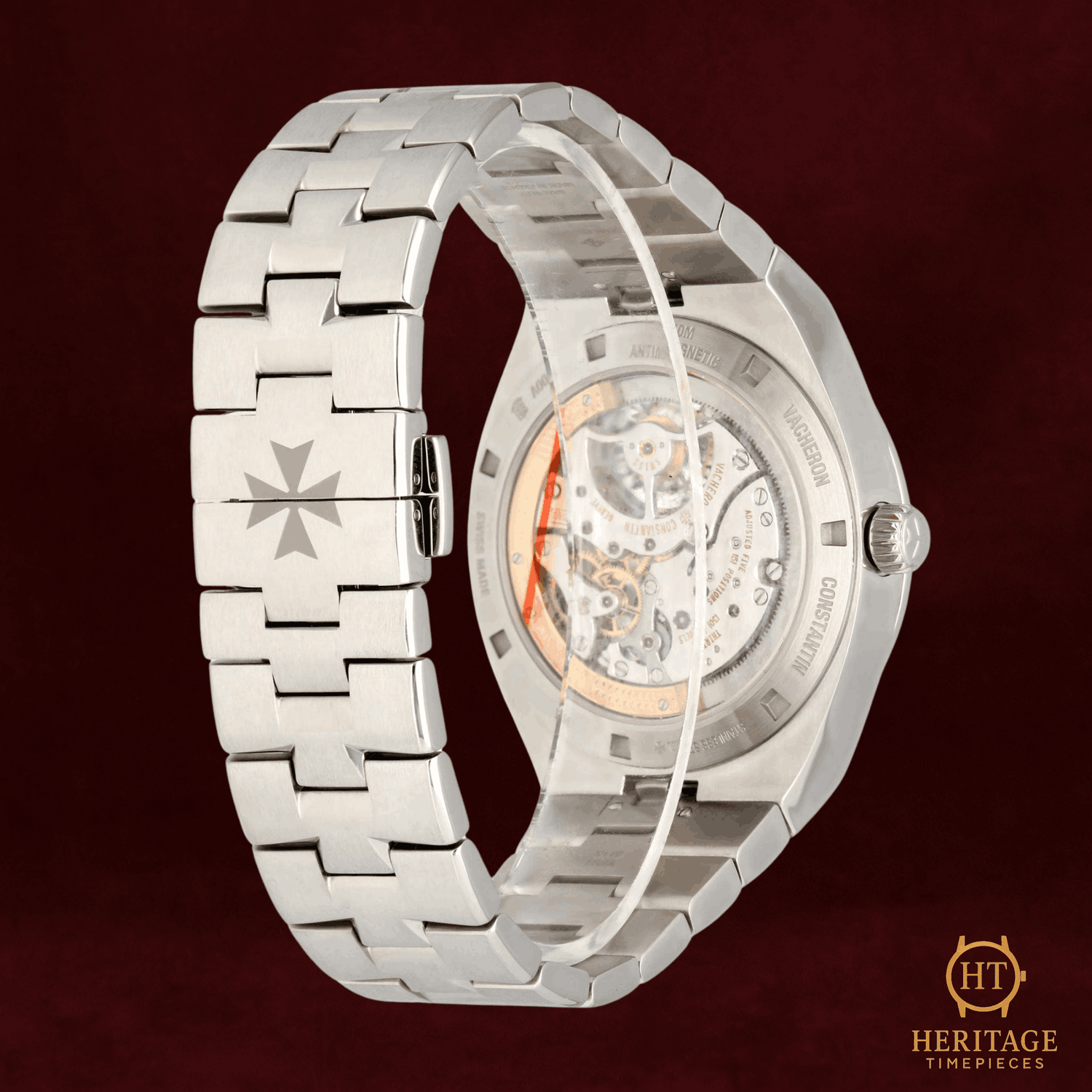 A caixa de aço inoxidável de 42,5 mm mantém as proporções esportivas da coleção Overseas, enquanto permanece relativamente fina para uma complicação de tourbillon. Uma característica definidora da referência é o sistema de intercambialidade de pulseiras da Vacheron Constantin, normalmente fornecido com três pulseiras: bracelete de aço, pulseira de couro e pulseira de borracha, permitindo que o relógio transite facilmente entre configurações formais e esportivas. Apresentado completo com caixa e garantia, este Overseas Tourbillon oferece uma excepcional pedigree horológica em uma plataforma versátil de aço inoxidável, atraindo colecionadores que buscam um relógio esportivo moderno com verdadeira substância de alta complicação.