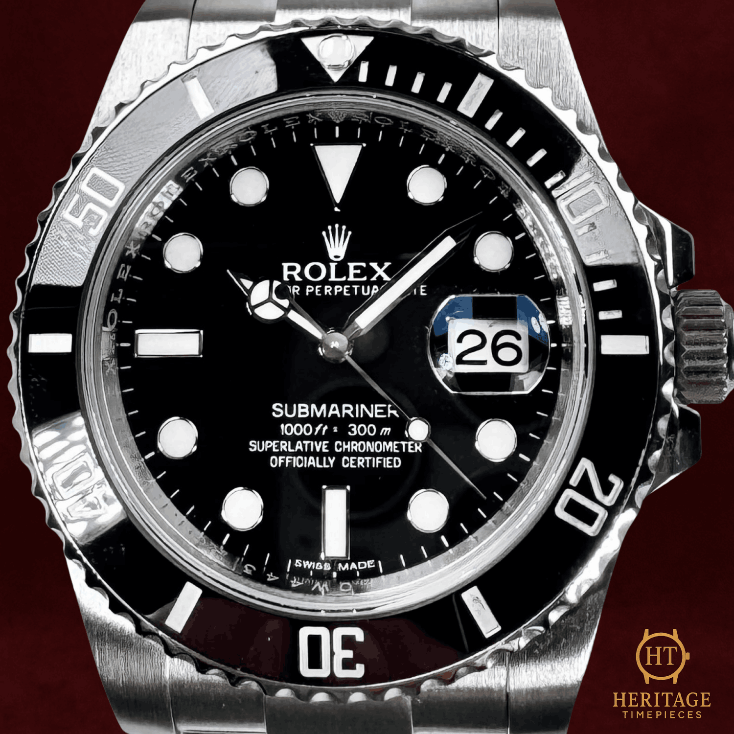 Heritage Narrative The Rolex Submariner Date reference 116610 represents the modern evolution of Rolex’s iconic dive watch. Introduced with a Cerachrom ceramic bezel and updated case proportions, it combines enhanced durability with the timeless Submariner design that has defined the category since 1953. Technical Specifications Reference:116610 Year:2013 Movement:Rolex calibre 3135 automatic self-winding movement Case:40 mm Oyster case in stainless steel Bezel:Unidirectional rotating bezel with black Cerachrom insert and platinum-filled numerals Crystal:Scratch-resistant sapphire crystal Dial / Hands:Black dial with luminous hour markers set in steel surrounds Bracelet / Clasp:Rolex Oyster bracelet in stainless steel with Oysterlock safety clasp and Glidelock extension Water resistance:300 m / 1,000 ft (manufacturer specification) Condition & Inclusions Overall grade:Pre-owned — mint condition (with protective factory stickers) Service status:Movement tested and functioning correctly Set:Full set — includes original box, certificate, booklets, and tags Shipping & Logistics Stored off-site and shipped fully insured within 1–3 business days.Worldwide shipping available; buyer responsible for any import duties or taxes. Shipping & Returns Complimentary insured worldwide shipping and a 14-day return window (watch must be returned in the same condition supplied). Each timepiece is authenticated, time-tested, and professionally prepared prior to dispatch. All shipments include secure packaging, tracking, and full insurance coverage.