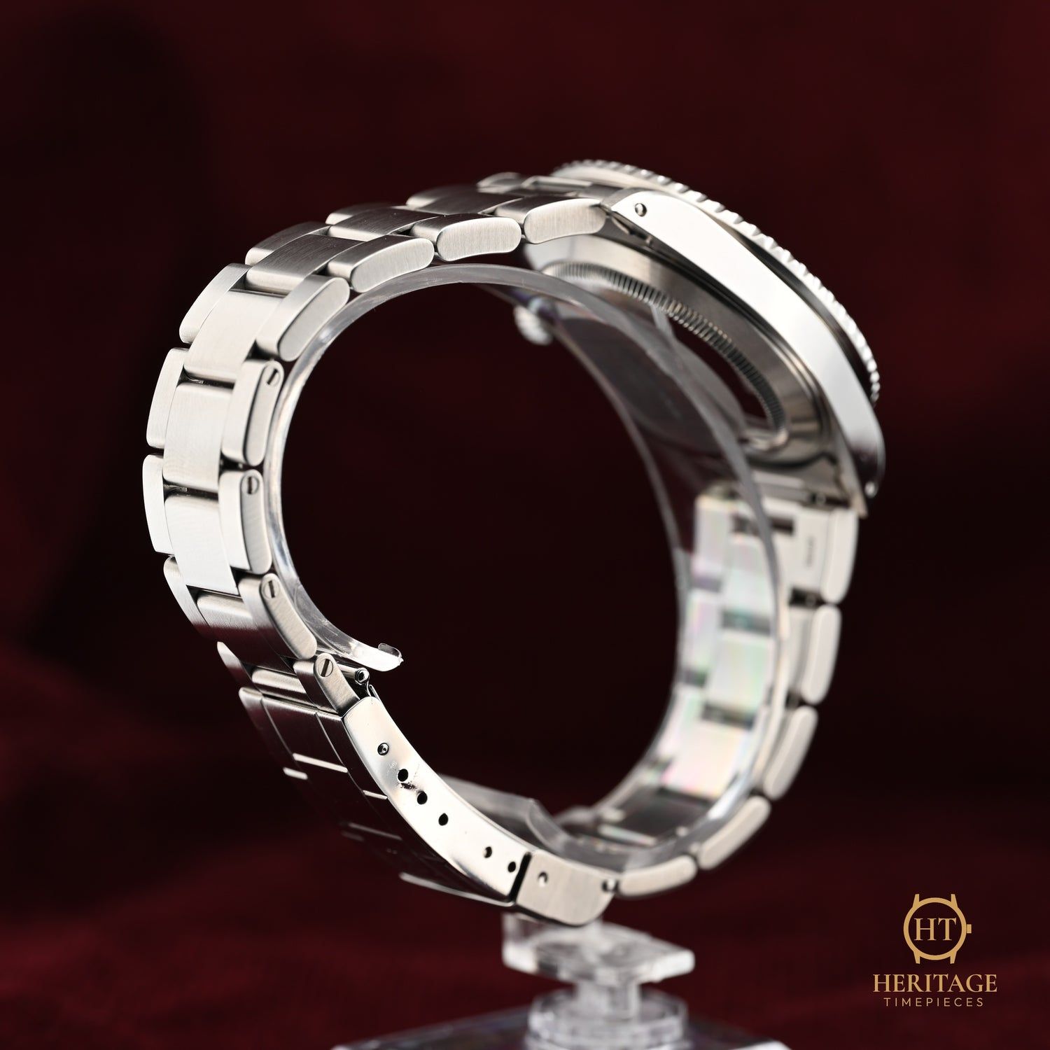 Heritage Narrative The Submariner Date ref. 16610 bridges vintage charisma and modern engineering. Produced from 1988 to 2010, it retains the sleek, pre‑“Super Case” profile of early Submariners while benefiting from sapphire crystal and the chronometer‑certified Calibre 3135. This 1998 example sits at the tail‑end of the tritium era—its “T < 25” dial plots have aged to a subtle cream, offering warm contrast to the glossy black dial and aluminum bezel insert. Rarer still, the watch remains complete with its miniature Rolex anchor charm, boxes, papers, and accessories—an increasingly elusive package that underscores careful, long‑term stewardship. Technical Specifications Reference: 16610 – Submariner Date Year: 1998 (U‑series) Movement: Rolex Calibre 3135, automatic, 31 jewels, 28 800 vph, ~48‑hour power reserve, quick‑set date Case: 40 mm Oystersteel; unidirectional black aluminum bezel; Triplock screw‑down crown Crystal: Sapphire with Cyclops date magnifier Dial / Hands: Glossy black dial; tritium lume plots (“T < 25”); Mercedes hands with matching tritium Bracelet / Clasp: Oyster bracelet ref. 93150 with folding clasp and diver’s extension Water Resistance: 300 m / 1 000 ft (factory rating) Condition & Inclusions Overall Grade: Excellent—sharp lug chamfers, minimal hairlines, clean bezel insert; bracelet shows very light stretch Service Status: Movement inspected and amplitude‑tested August 2025; running within chronometer tolerances Set:Inner & outer Rolex boxesPunched warranty paper (1998)Submariner anchor (300 m / 1 000 ft)Chronometer and Submariner bookletsBoth swing tags and extra bracelet linkHeritage Timepieces certificate of authenticity Shipping & Logistics Stored off-site and shipped fully insured within 1–3 business daysWorldwide shipping available; buyer responsible for any import duties or taxes Shipping & Returns Complimentary insured worldwide shipping and a 14-day return window (watch must be returned in the same condition supplied). Every piece is authenticated, time-graphed, and prepared for secure transit.