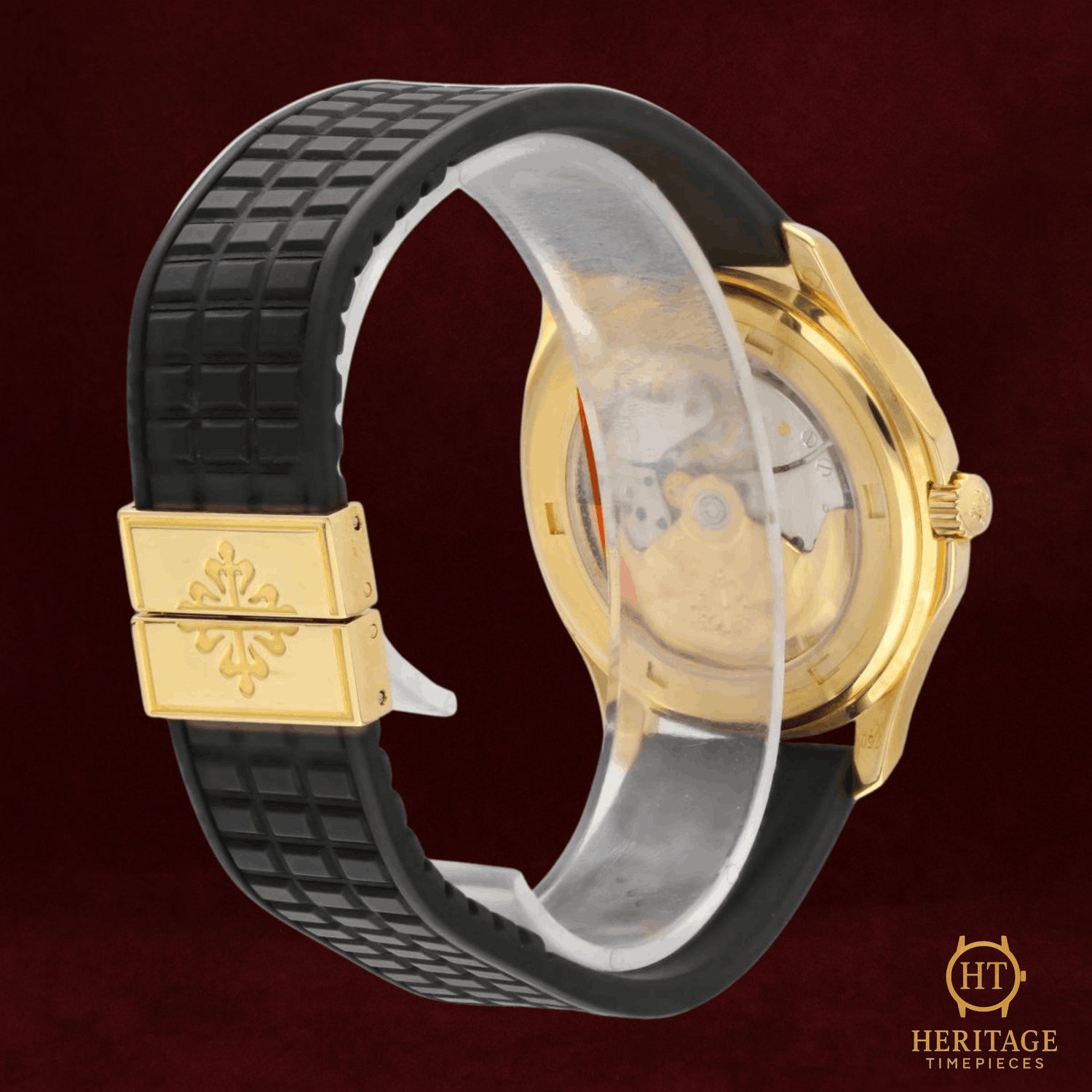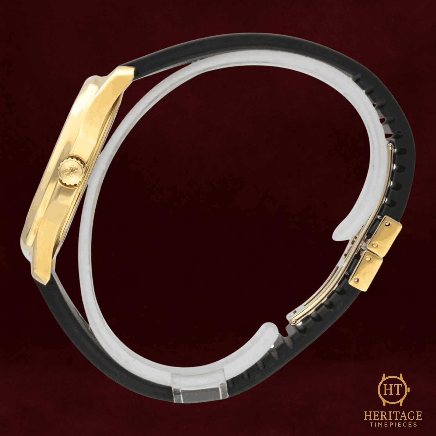 Heritage Narrative The Patek Philippe Aquanaut reference 5065J-001 represents an important evolution of the early Aquanaut collection. Introduced as the larger 38 mm “Jumbo” version, it refined the model’s sporty character while maintaining the elegance that defines Patek Philippe’s modern sport watches. Technical Specifications Reference:5065J-001 Year:2001Patek Philippe service revision in 2021 Movement:Patek Philippe Caliber 315 SC automatic movement Case:38 mm case in 18k yellow gold Bezel:Rounded octagonal bezel in 18k yellow gold Crystal:Scratch-resistant sapphire crystal with sapphire display caseback Dial / Hands:Black embossed “grenade” dial with applied Arabic numerals and luminous hands Bracelet / Clasp:Black composite rubber strap with 18k yellow gold deployant clasp Water resistance:120 m (manufacturer specification) Condition & Inclusions Overall grade:Pre-owned — excellent condition Service status:Serviced by Patek Philippe in 2021 Set:Full set — box and warranty Shipping & Logistics Stored off-site and shipped fully insured within 1–3 business days.Worldwide shipping available; buyer responsible for any import duties or taxes. Shipping & Returns Complimentary insured worldwide shipping and a 14-day return window (watch must be returned in the same condition supplied). Each timepiece is authenticated, time-tested, and professionally prepared prior to dispatch. All shipments include secure packaging, tracking, and full insurance coverage.