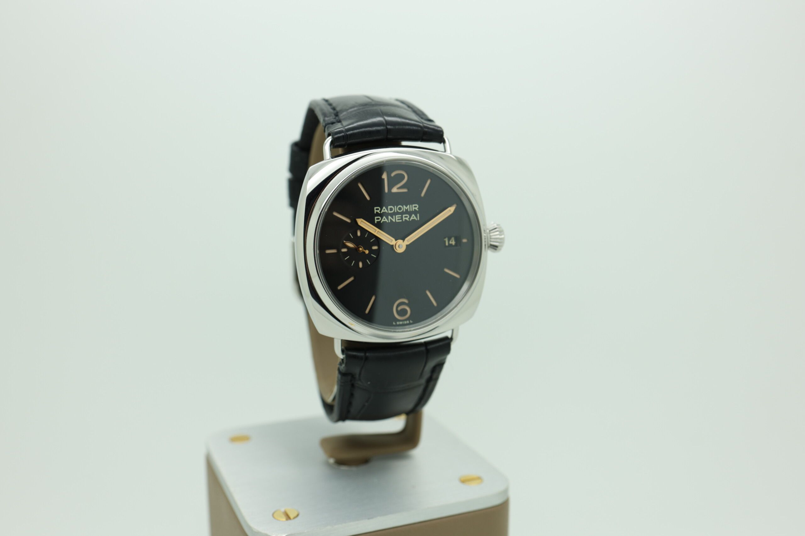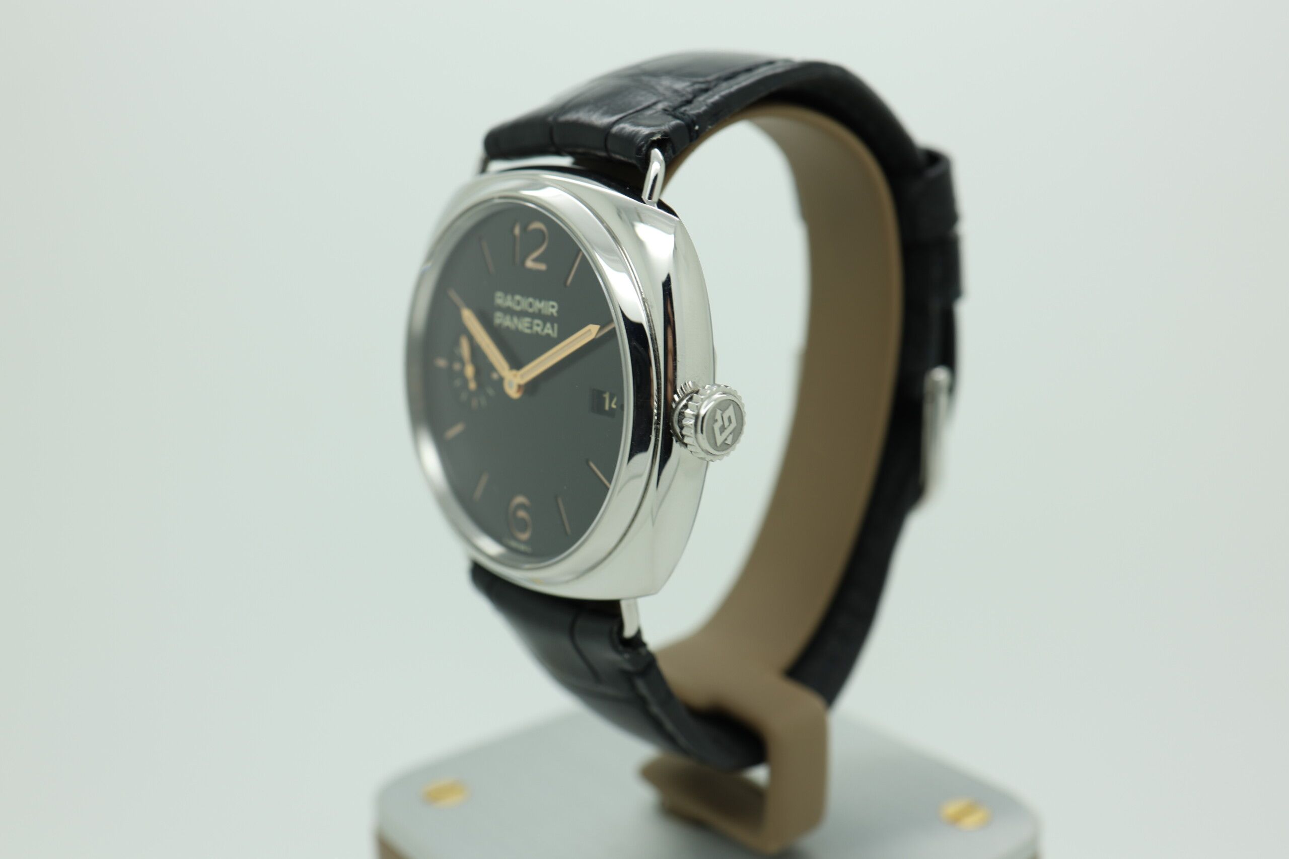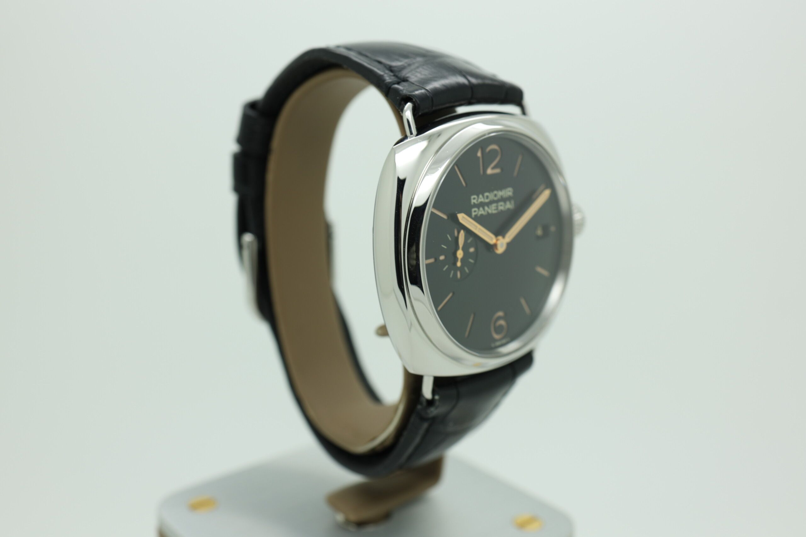 The clean, highly legible dial features classic Arabic numerals and baton markers, enhanced by luminous coating for optimal visibility in low-light conditions. True to the Radiomir DNA, the watch showcases a pure, uncluttered aesthetic that emphasizes symmetry and heritage design, making it a standout piece for collectors who appreciate understated luxury.