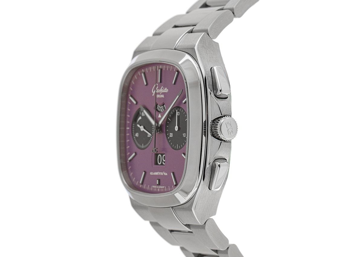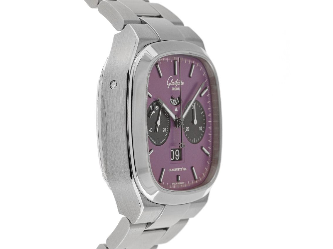 Gehäuse Edelstahl poliert und satiniert, rechteckig, Gehäusemaße ohne Krone (L x B x H) 40 x 40 x 14,1mm. Lünette Edelstahl glatt und poliert. Armband Edelstahl poliert und satiniert, Sicherheitsfaltschließe Edelstahl mit Hersteller-Logo. Zifferblatt violett "Plasma" matt lackiert mit aufgesetzten schwarzen Leuchtindexen und schwarzen Leuchtzeigern. Uhrwerk Automatik, Glashütte Original Manufakturkaliber 37-02 mit 65 Edelsteinen, Gangreserve ca. 70 Stunden, 28.800 A/h. Glashütte Dreiviertelplatine mit Streifenschliff, Schwanenhals-Feinregulierung, Rotor skelettiert mit Streifenschliff und Doppel-G-Logo. Anzeige von Stunde und Minute über Zeiger aus der Mitte, kleine Sekunde mit Sekundenstopp zur sekundengenauen Einstellung der Uhrzeit bei 9 Uhr, Panoramadatumsanzeige mit Schnellverstellung bei 6 Uhr, einstellbar über Drücker bei 10 Uhr, Gangreserveanzeige zwischen 9 und 10 Uhr. Saphirglas kratzfest. Krone verschraubbar mit Flankenschutz und Hersteller-Logo. Boden Edelstahl 8-fach verschraubt und graviert mit Saphirglas Sichtfenster. Gewicht der Uhr inklusive Armband 188g, Länge des Armbandes inklusive Gehäuse 185mm. Wasserdicht bis 10 ATM. Referenznummer: 1-37-02-20-02-70, ID: ST1160231280426H-16800, Artikelnummer: 10000085400. Original Glashütte Original Box mit Umkarton und Garantie Papiere von März 2026, Full Set. Limitiert auf 100 Exemplare. Ungetragen. Lieferzeit sofort.