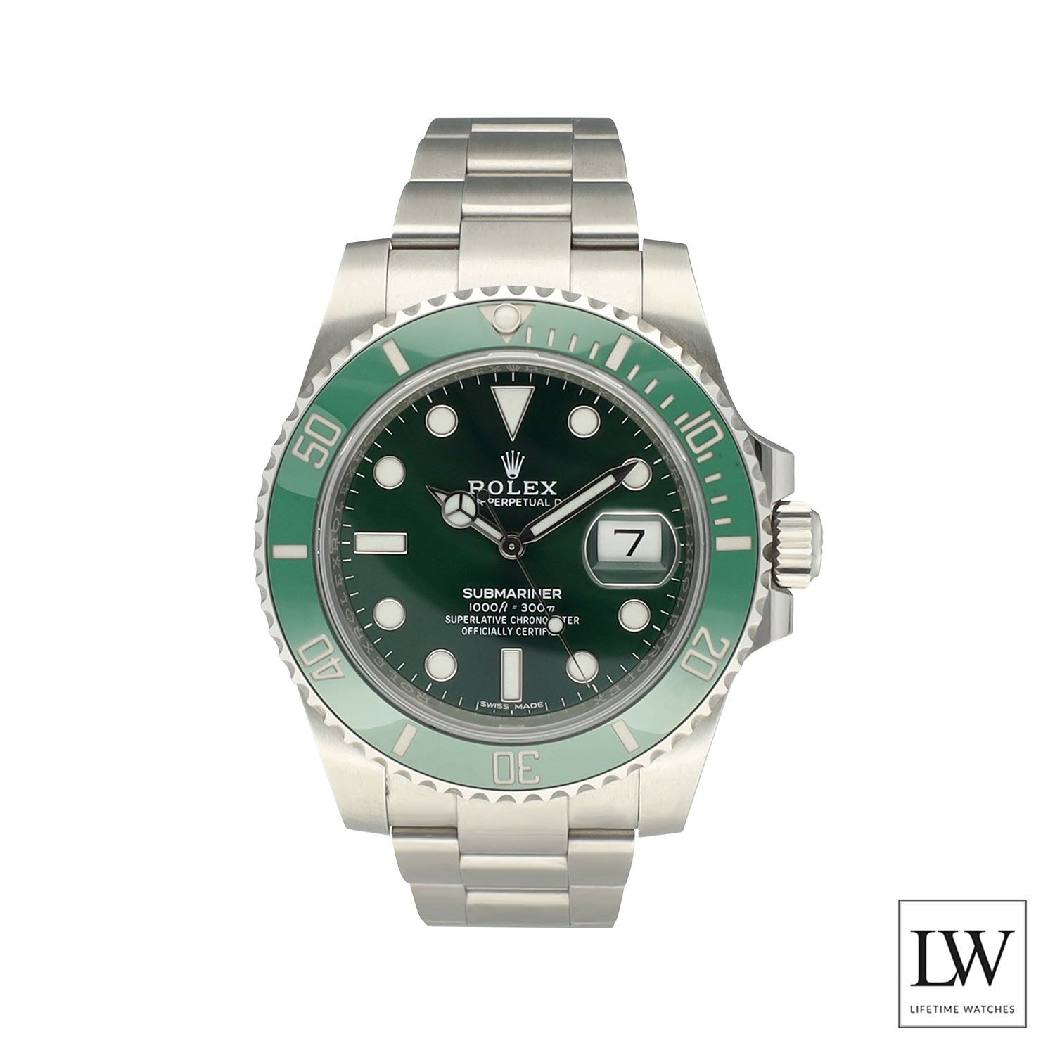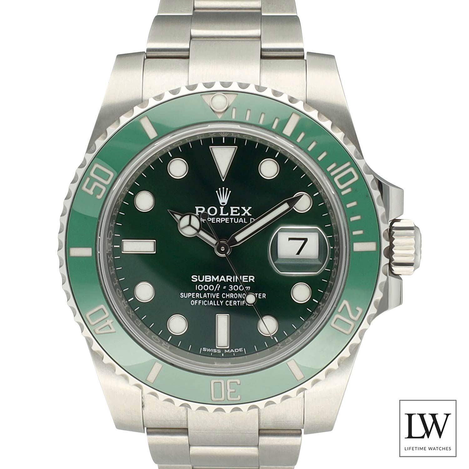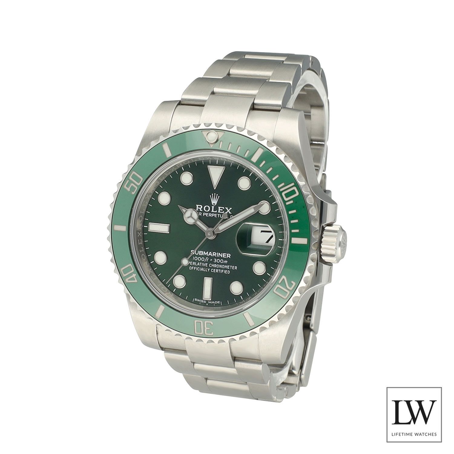 The Rolex Submariner Date ref. 116610LV is one of the most recognizable modern dive watches in the Rolex collection. This configuration features the iconic green sunburst dial combined with the matching green Cerachrom bezel, creating a bold and highly sought after look that has earned this model the nickname “Hulk”.