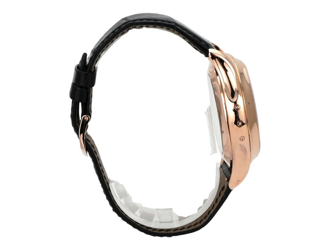 Caixa de ouro rosa polido, diâmetro da caixa 42 mm, bezel de ouro rosa polido, pulseira de couro preto com fivela, mostrador marrom com efeito sol, movimento automático, calibre de fabricação CH 28-520 QA 24H com 37 rubis, frequência 28.800 A/h, reserva de marcha de até 45 horas, calendário anual, cronógrafo, exibição de data, mês, dia da semana, fundo da caixa em ouro rosa com janela de cristal de safira, resistente à água até 3 bar.