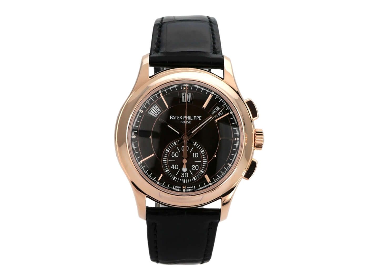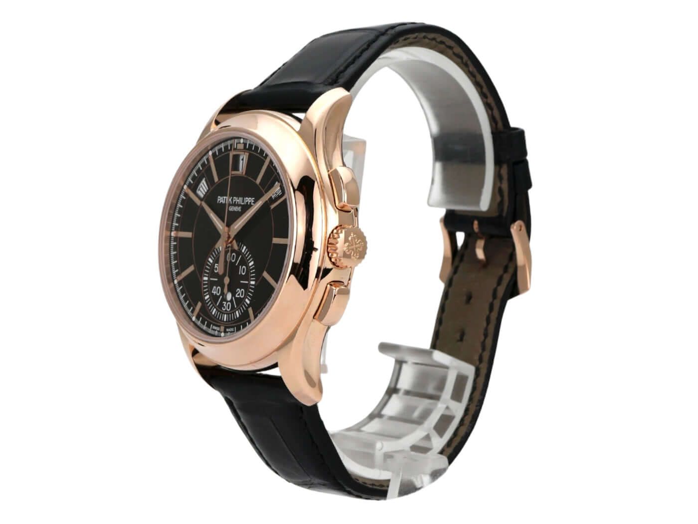 Patek Philippe Ref. 5905R-001 Annual CalendarPolished rose gold case, case diameter 42 mm, polished rose gold bezel, black leather with pin buckle, brown sunburst dial, automatic winding, manufacture caliber CH 28-520 QA 24H with 37 jewels, frequency 28,800 A/h, power reserve up to 45 hours, annual calendar, chronograph, date, month display, day of the week, rose gold case back with sapphire crystal window, water-resistant up to 3 bar.