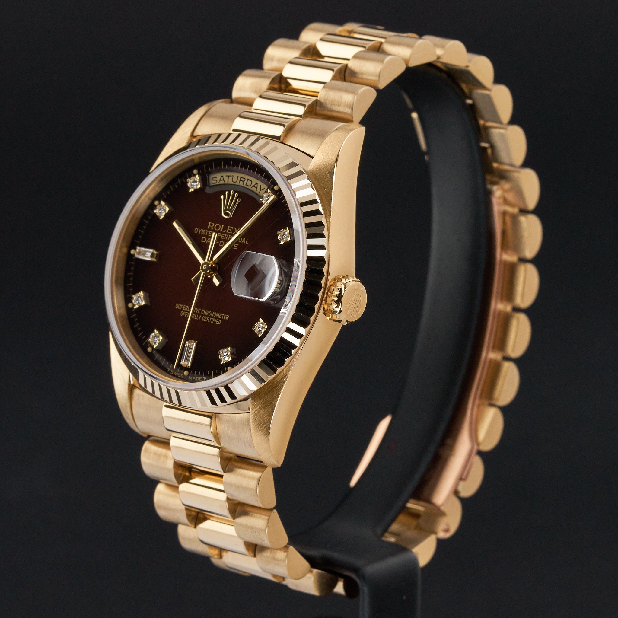 This Rolex Day-Date 18238 features a Brown vignette small diamond dial and is crafted from 18K yellow gold, with a production year of 1991.