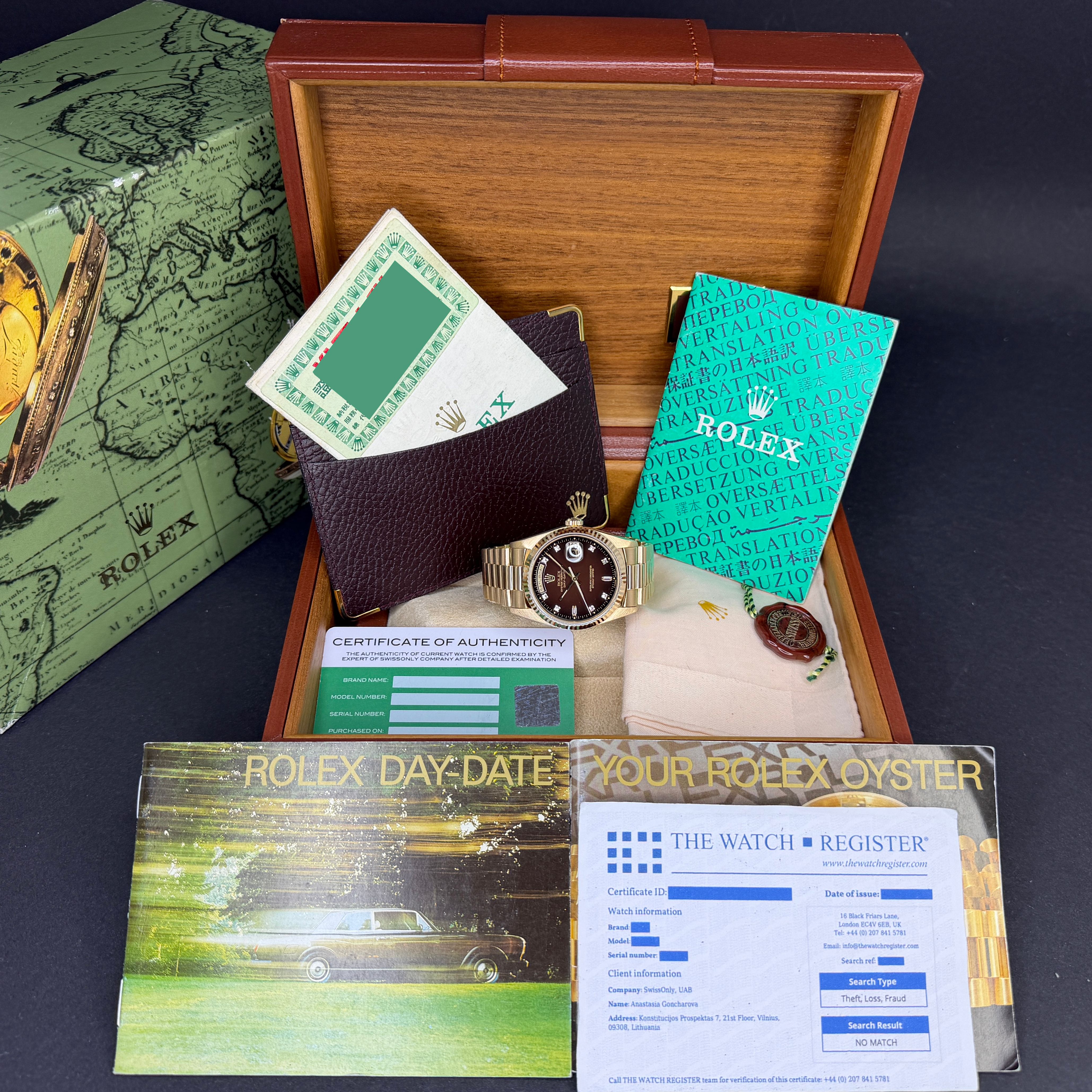 Rolex Day Date President, 18238, 36mm, 1991, Yellow gold, Brown Vignette Small Diamond dial, Fullset, 1y warrant